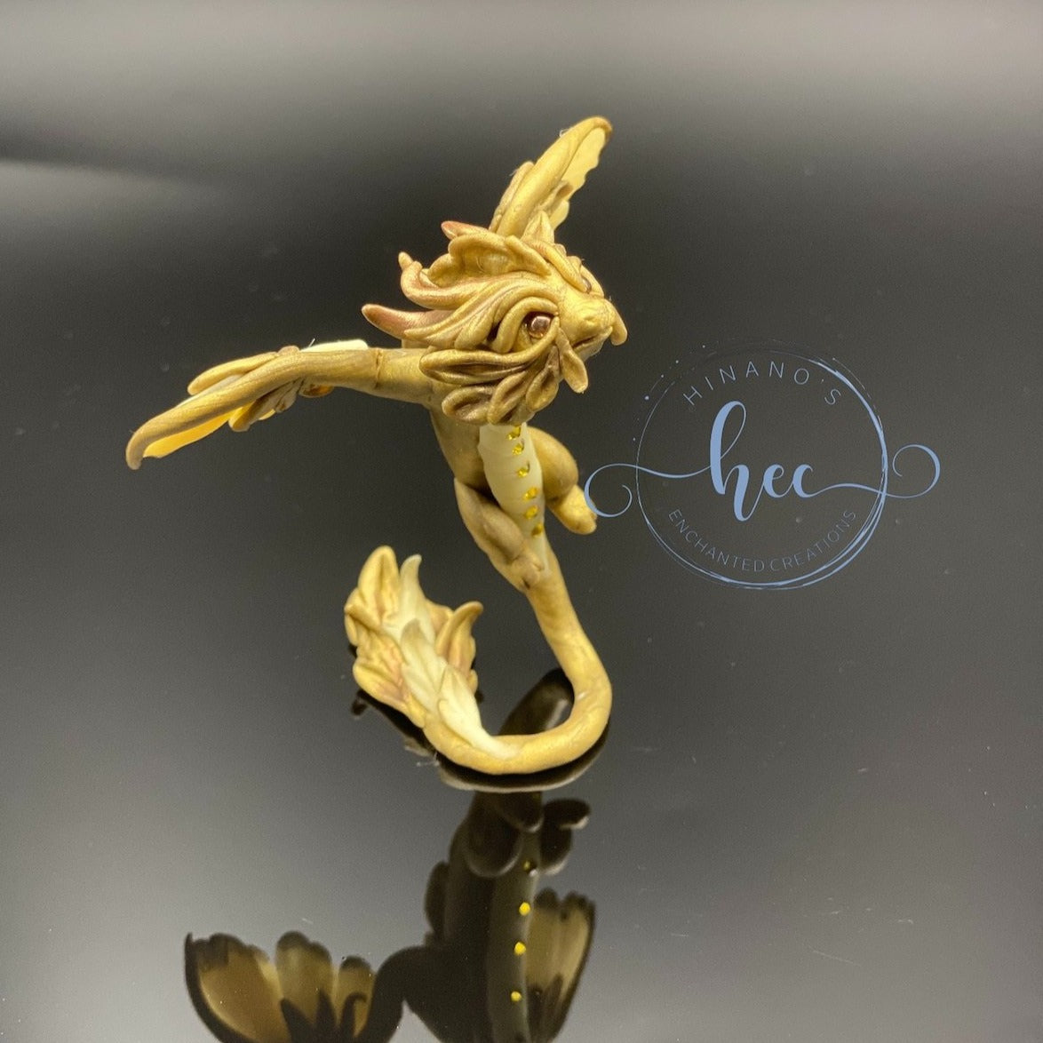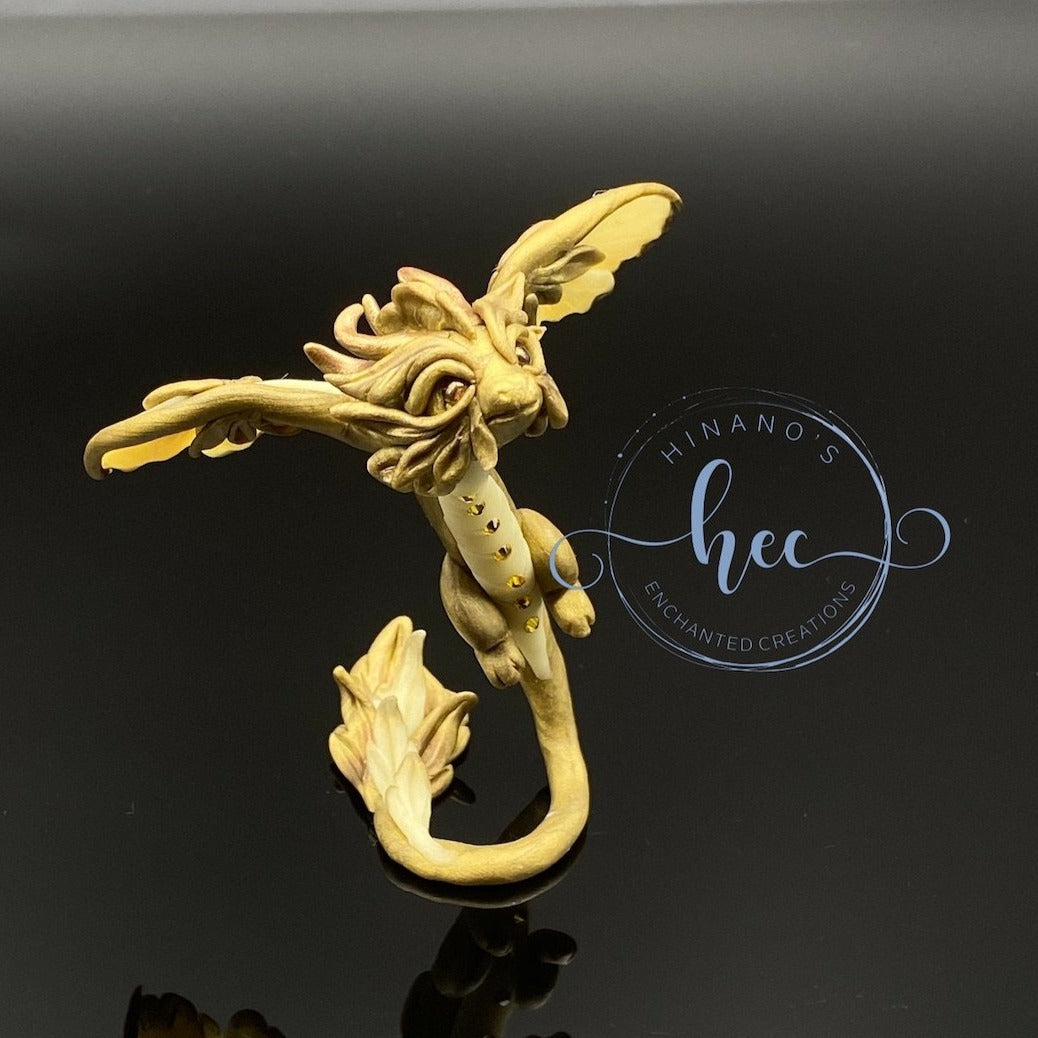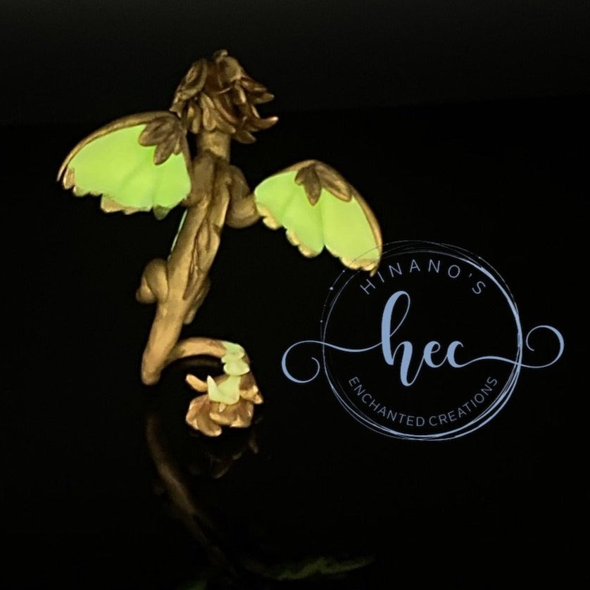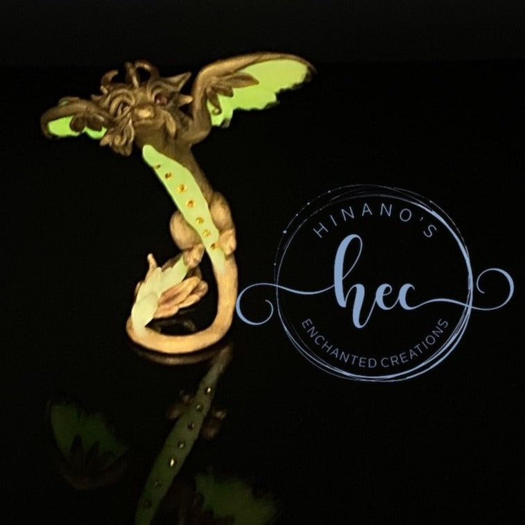This little bronze dragon is studded with Swarovski crystals under his belly. All the light colored areas on this guy such as his wings, belly and parts of his tail glow in the dark when exposed and charged by light.