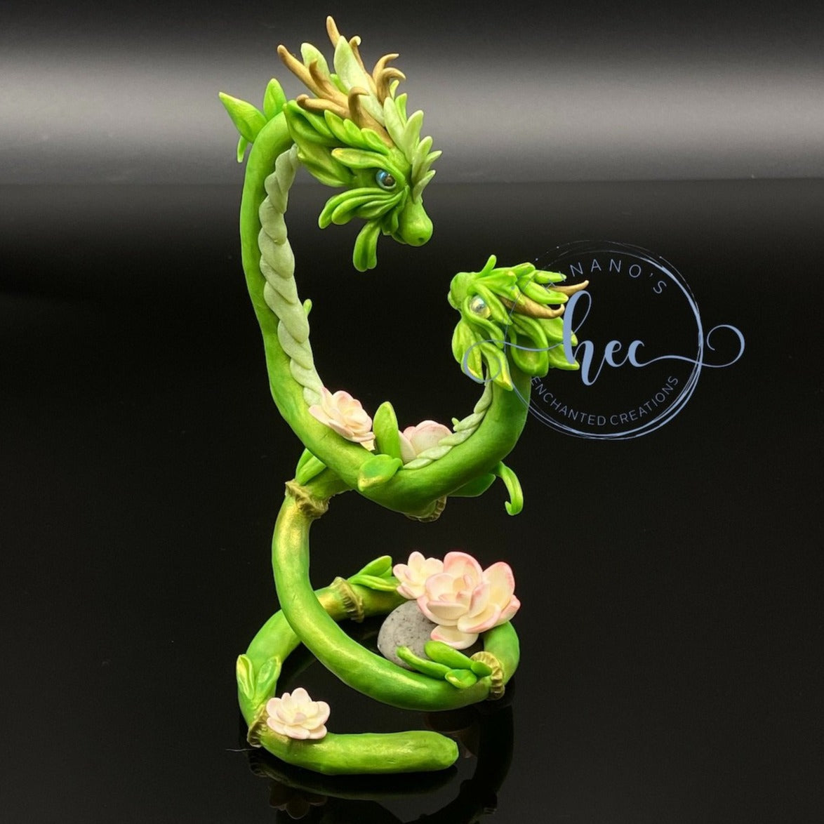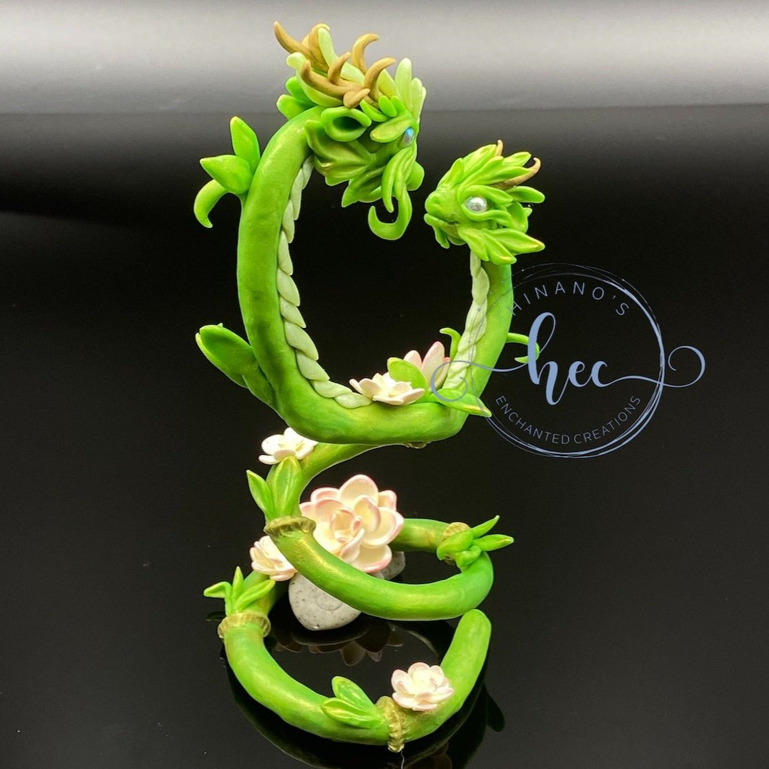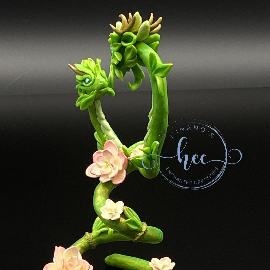 Lucky Bamboo Dragon mother and child. Sculpted entirely by hand out of Sculpey Premo Polymerclay. Features glass cabachon, pearl ex powder and pastel chalk shading.