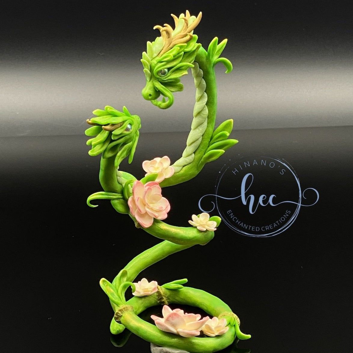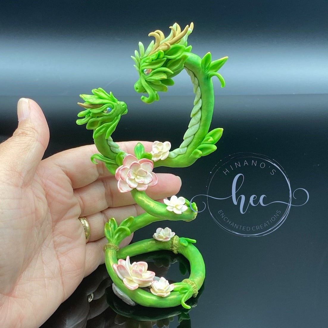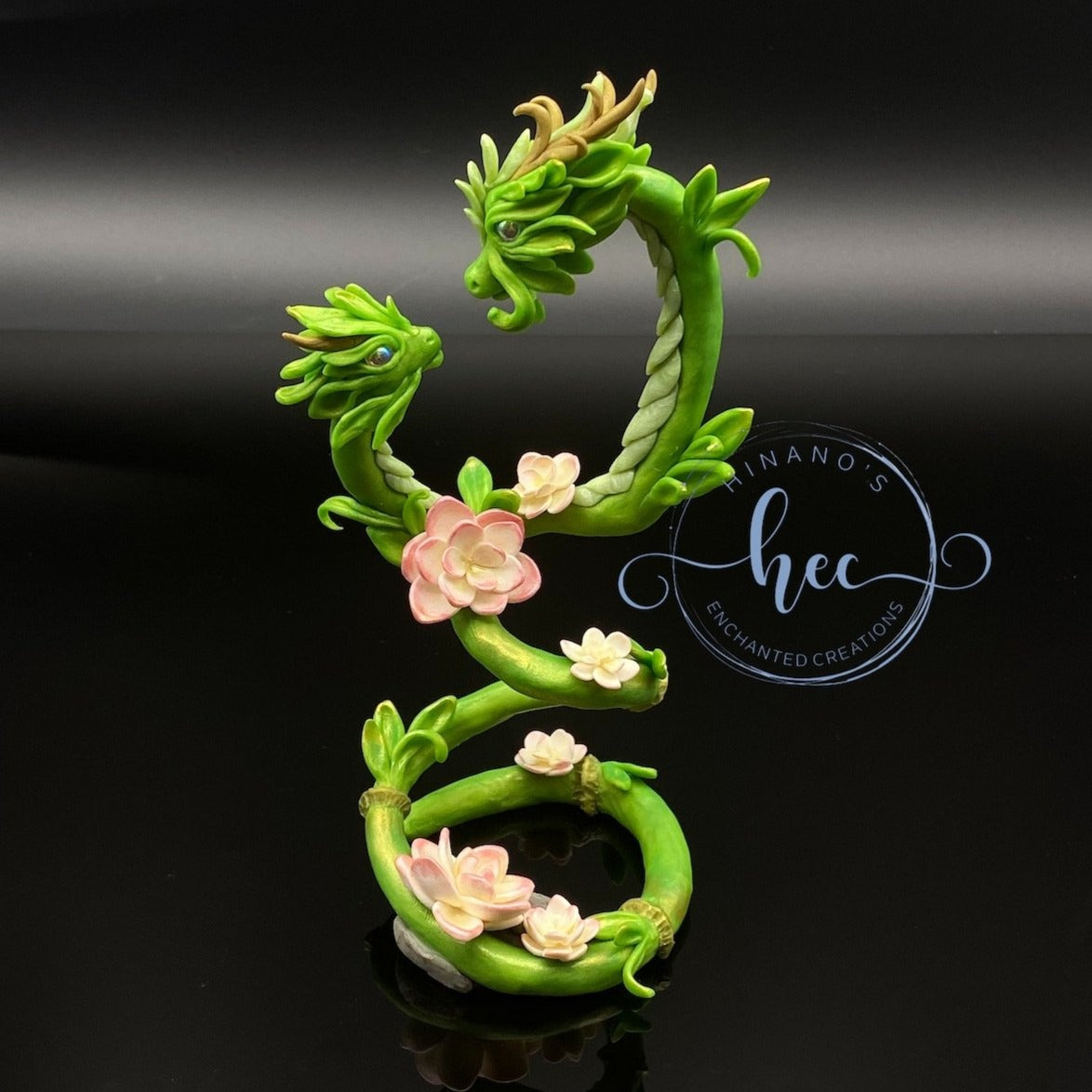 Lucky Bamboo Dragon mother and child. Sculpted entirely by hand out of Sculpey Premo Polymerclay. Features glass cabachon, pearl ex powder and pastel chalk shading.