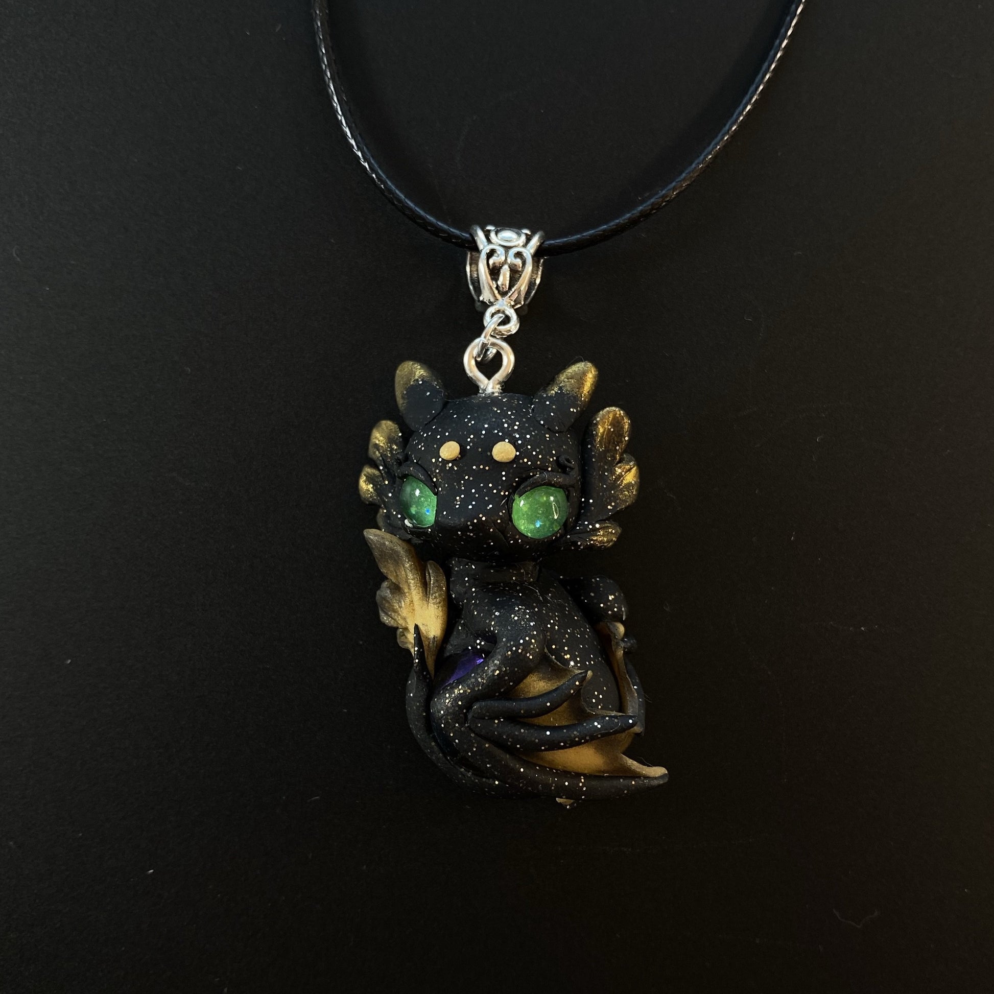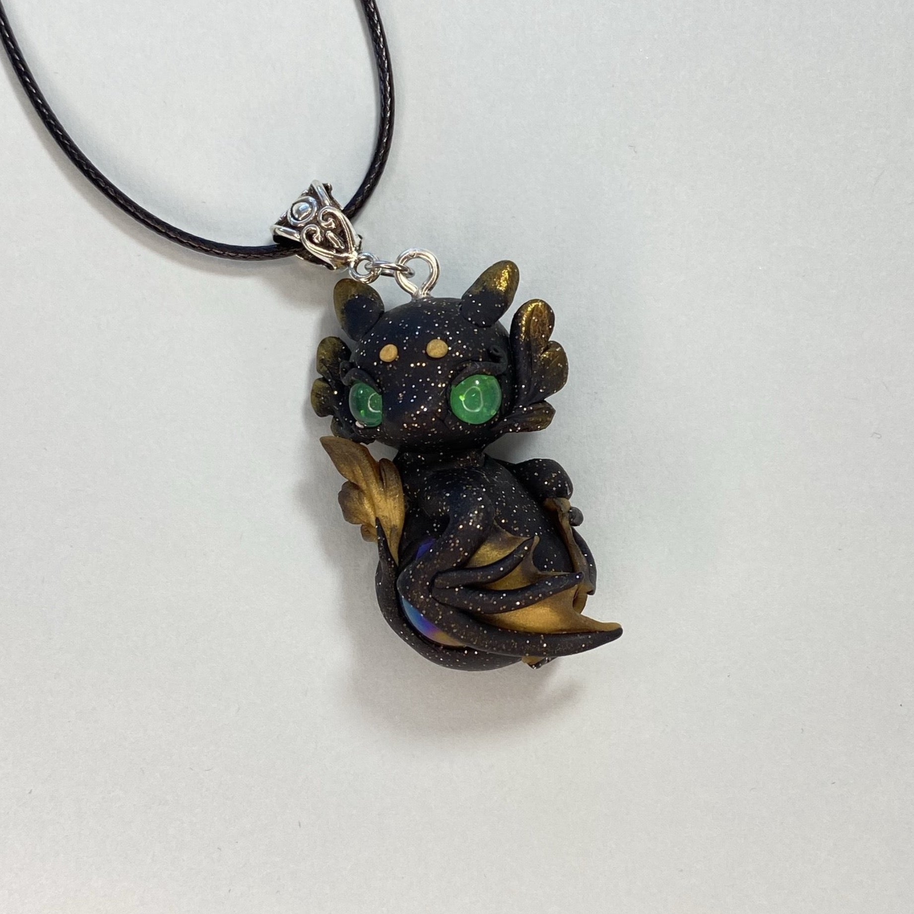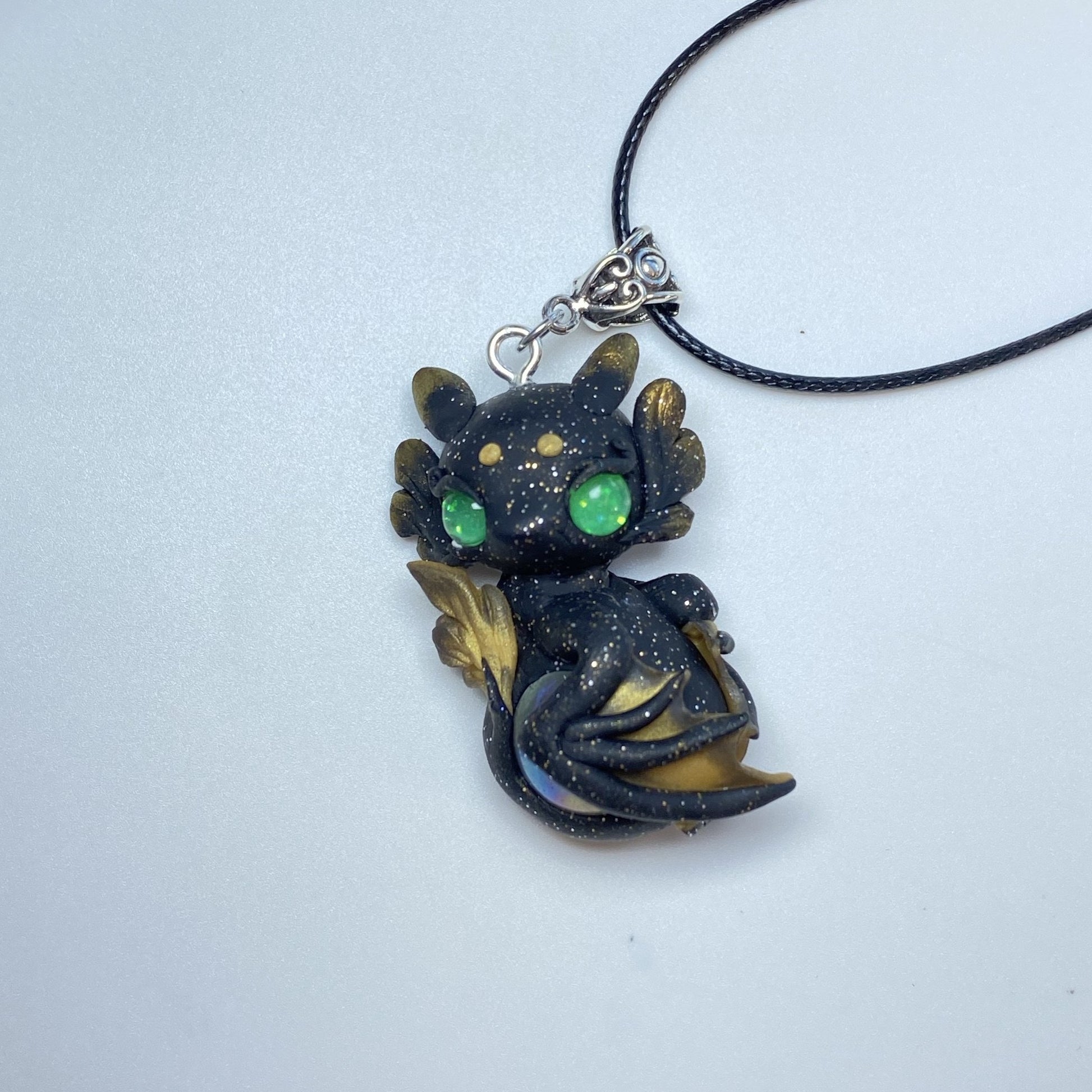 This black and gold, glitter flecked dragon is guarding his precious marble. His green eyes glow in the dark when exposed to uv lights or bright light for a period of time. Materials used include sculpey premo clay in black glitter and gold, pearl ex powders, glow powder, uv resin and glass cabochons for eyes. Leather necklace included.
