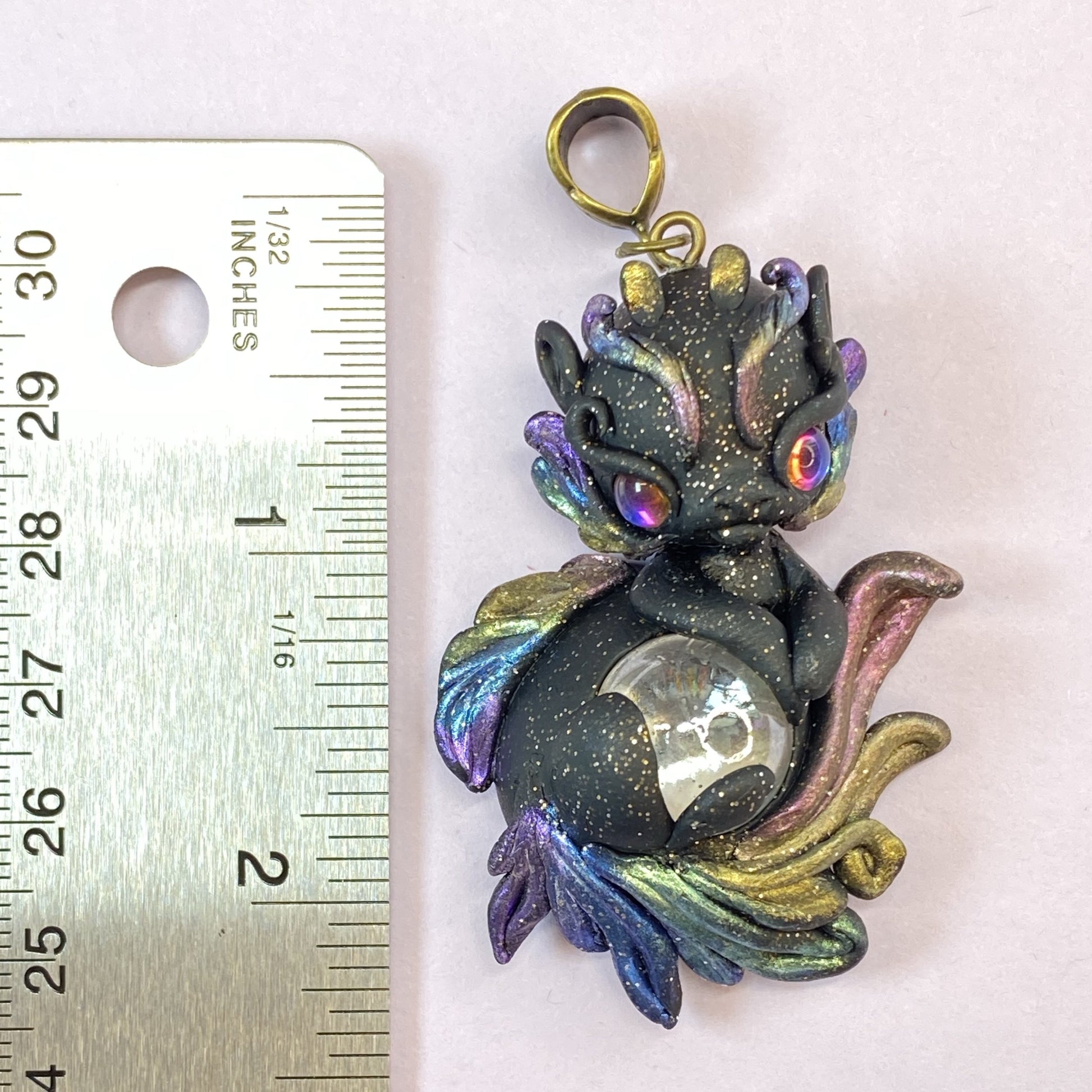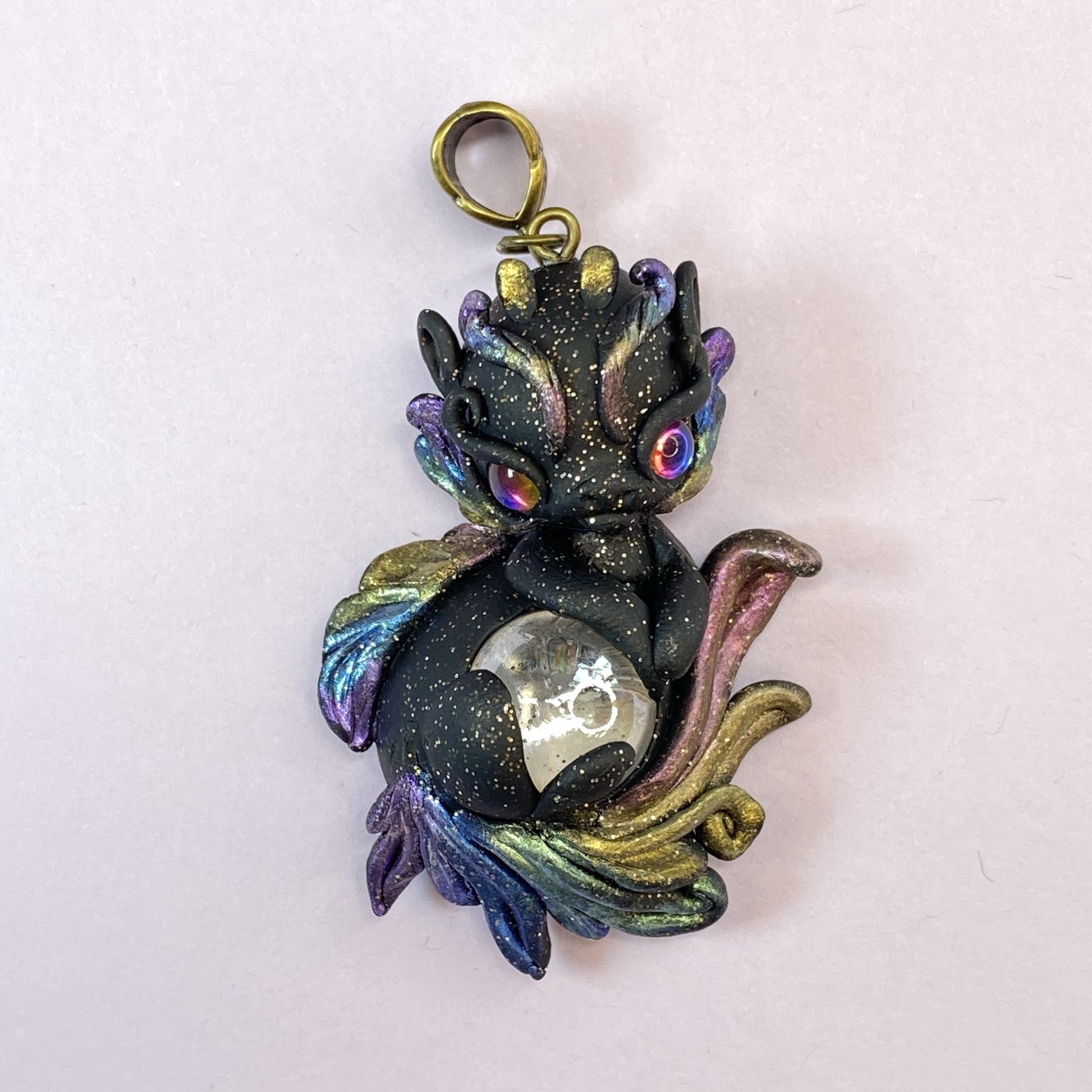 This black dragon twinkles with gold glitter to accentuate his rainbow mane and tail as he guards his glass marble. Materials used to create this piece include sculpey premo clay, pearl ex pigments, crystal cabochons for eyes and a glass marble. Leather necklace included.