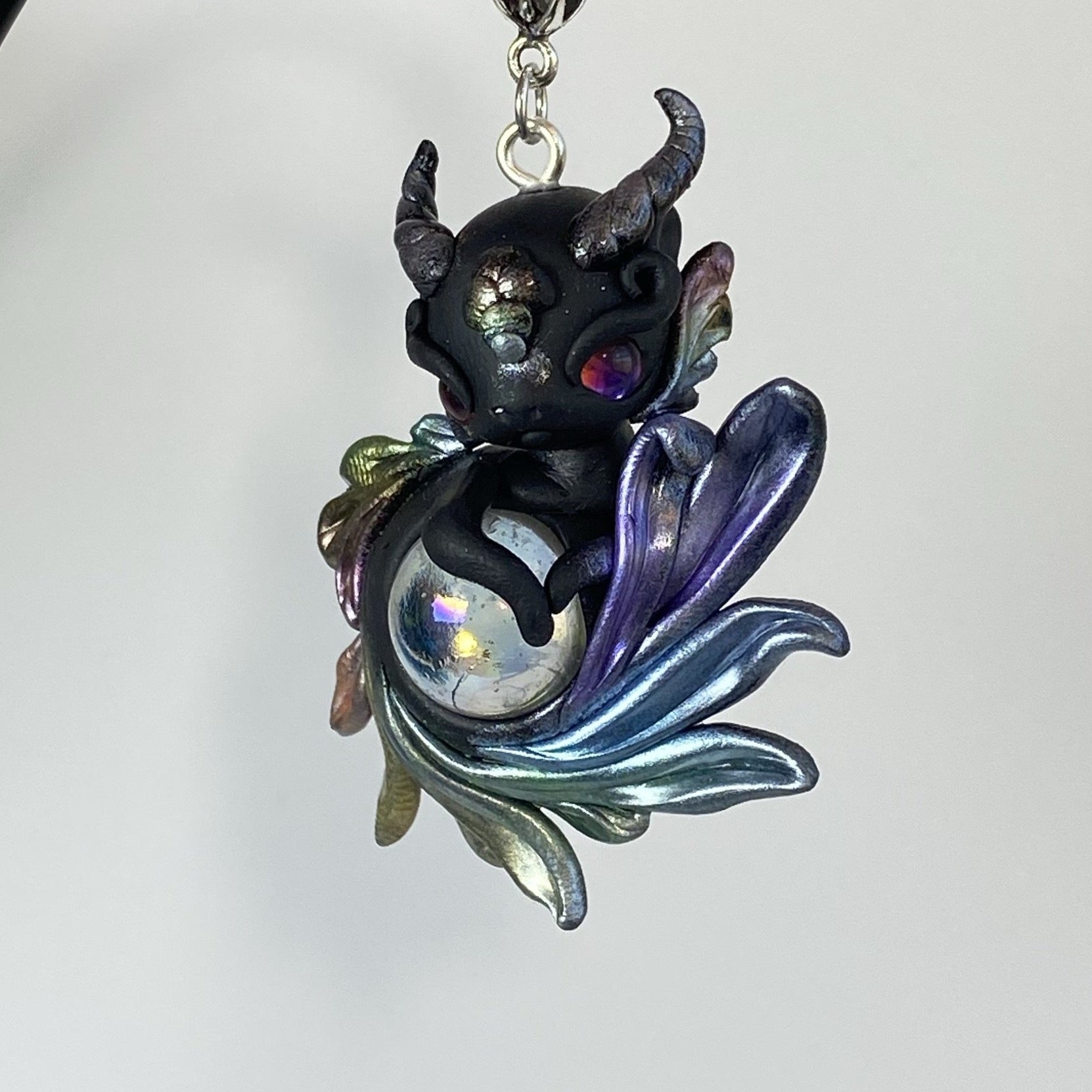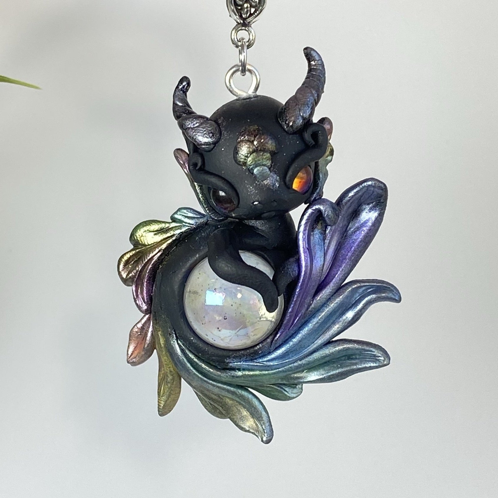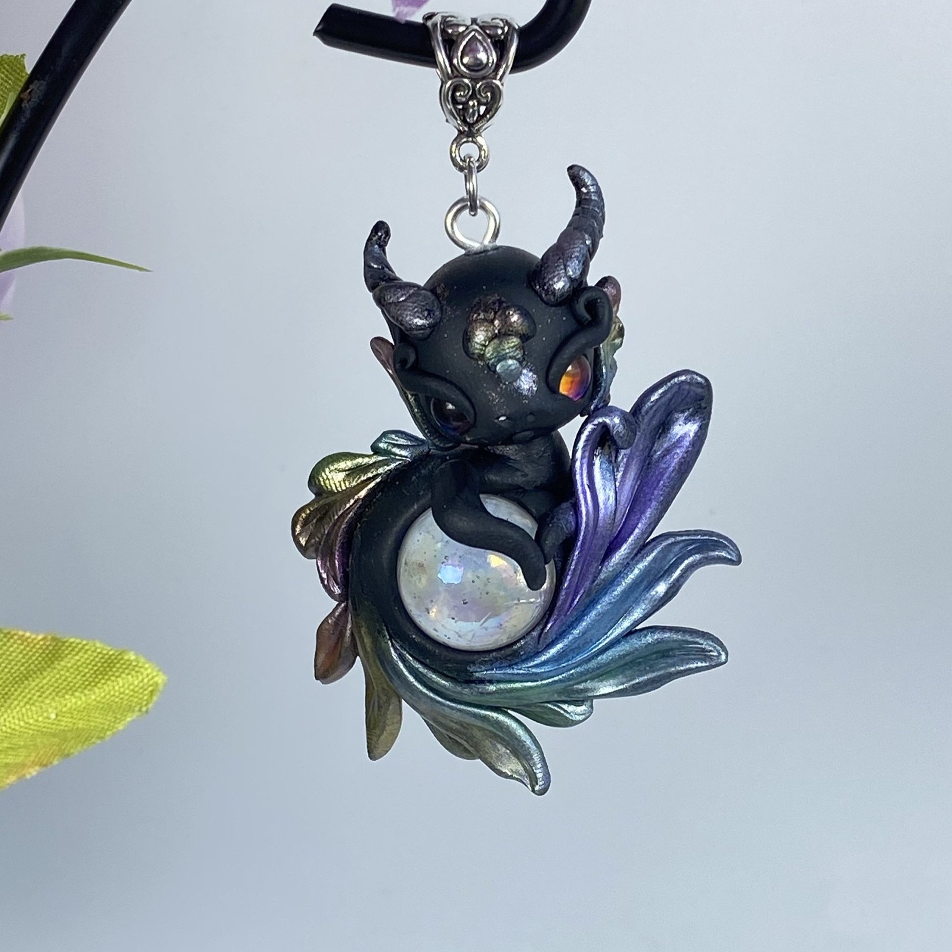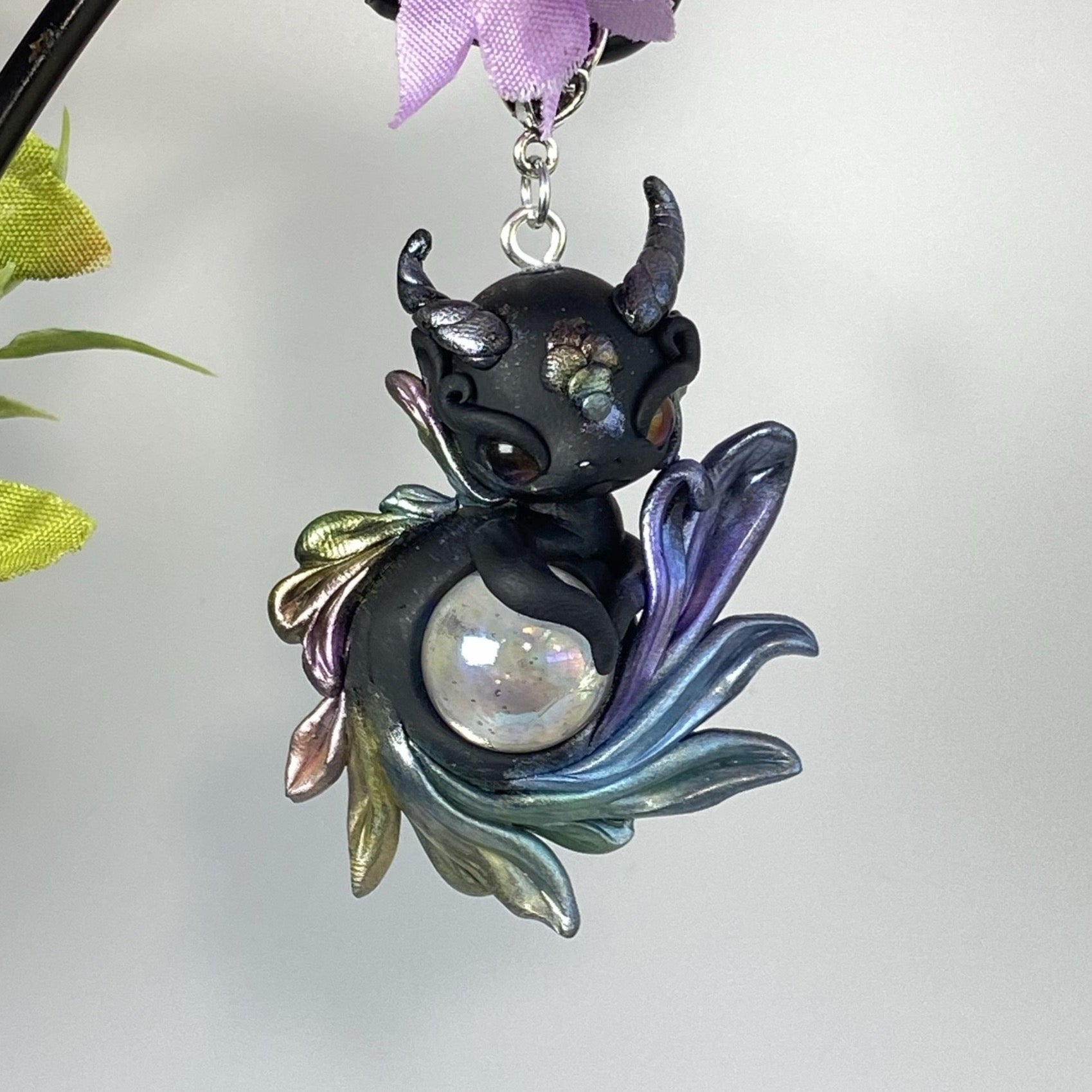 Black Dragon with pastel rainbow colors holding a marble. This tiny baby is made with sculpey premo clay, pan pastel pigments and ab cabochon eyes. Leather cord necklace included.