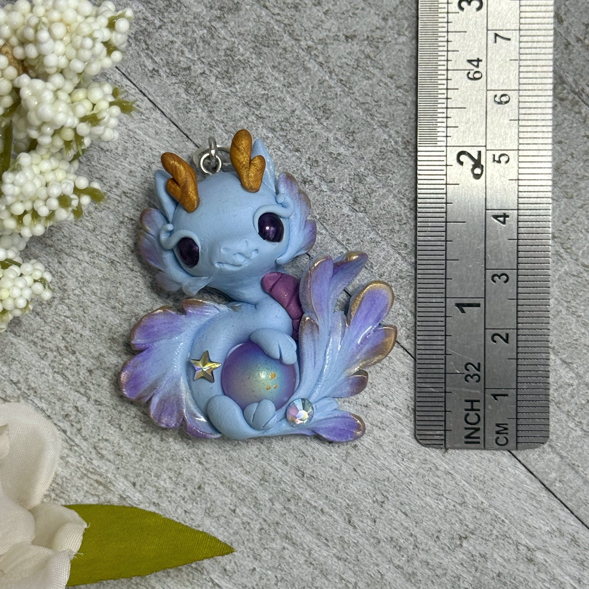This Blue and Purple Baby Dragon Pendant is a playful blend of vibrant colors and sparkling details. Handmade from polymer clay, it features shimmering glass beads and dazzling Swarovski crystals, enhanced with rich pigment powders and a glossy varnish finish and UV Resin. Ready to wear on an 18" leather cord necklace, this one-of-a-kind dragon adds a magical touch of whimsy to any outfit.