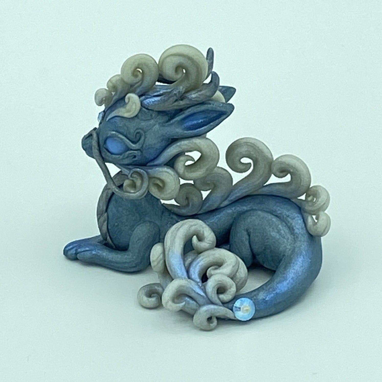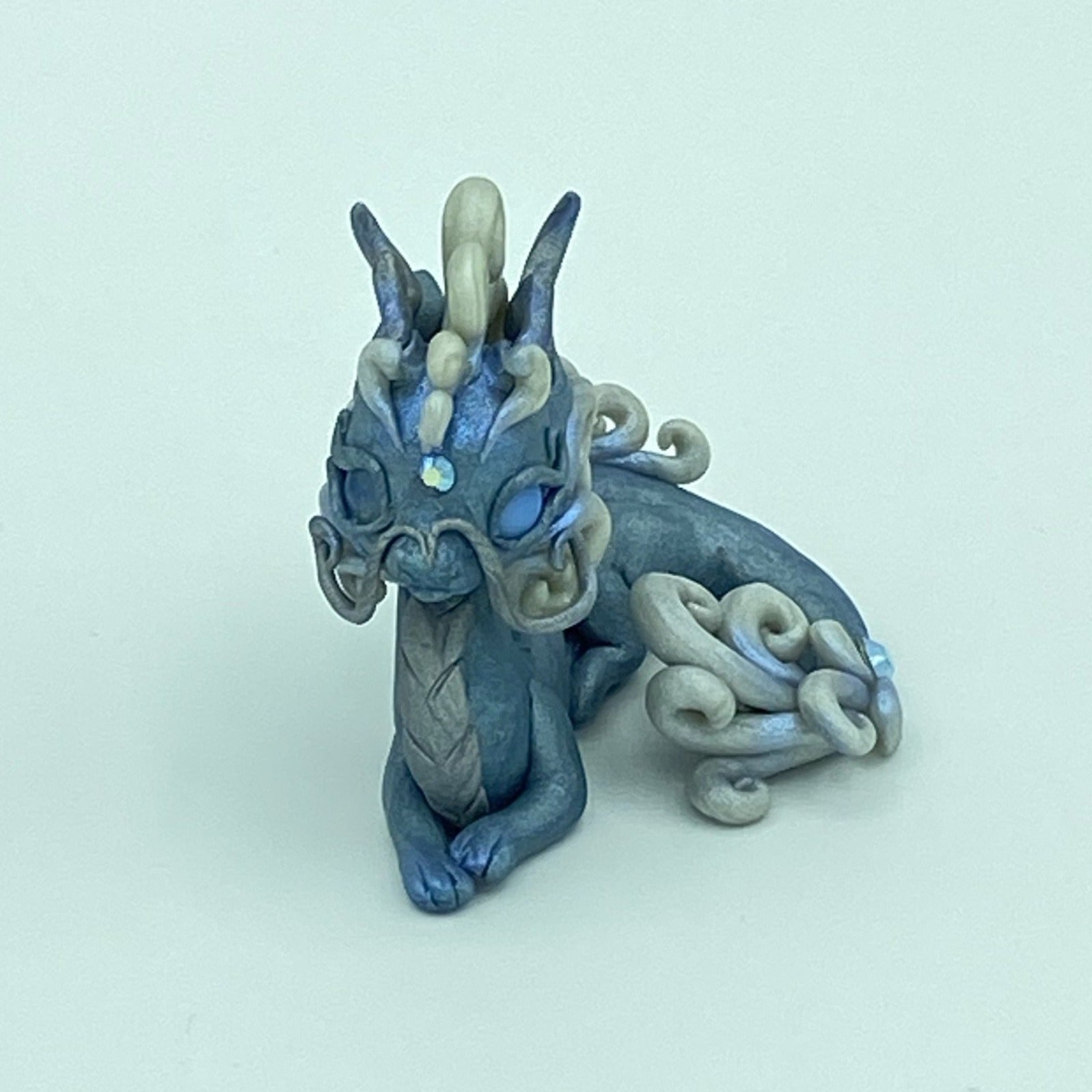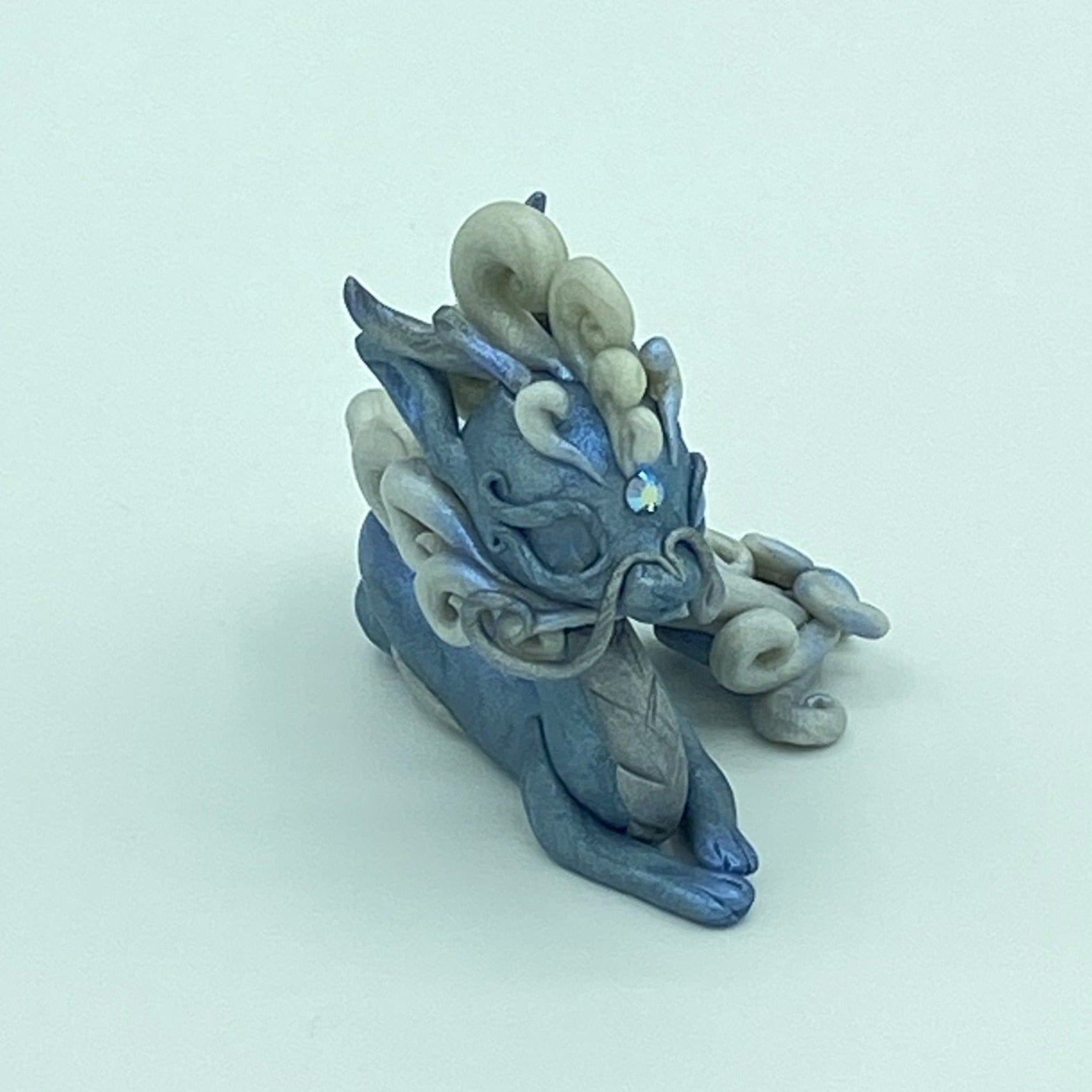 Delicate Cloud dragon in silvery blue shades with iridescent shimmer. Genuine swarovski crystals adorn his tail and forehead. Sculpted out of Polymer Clay with mica pearl powders and glass cabochon eyes.