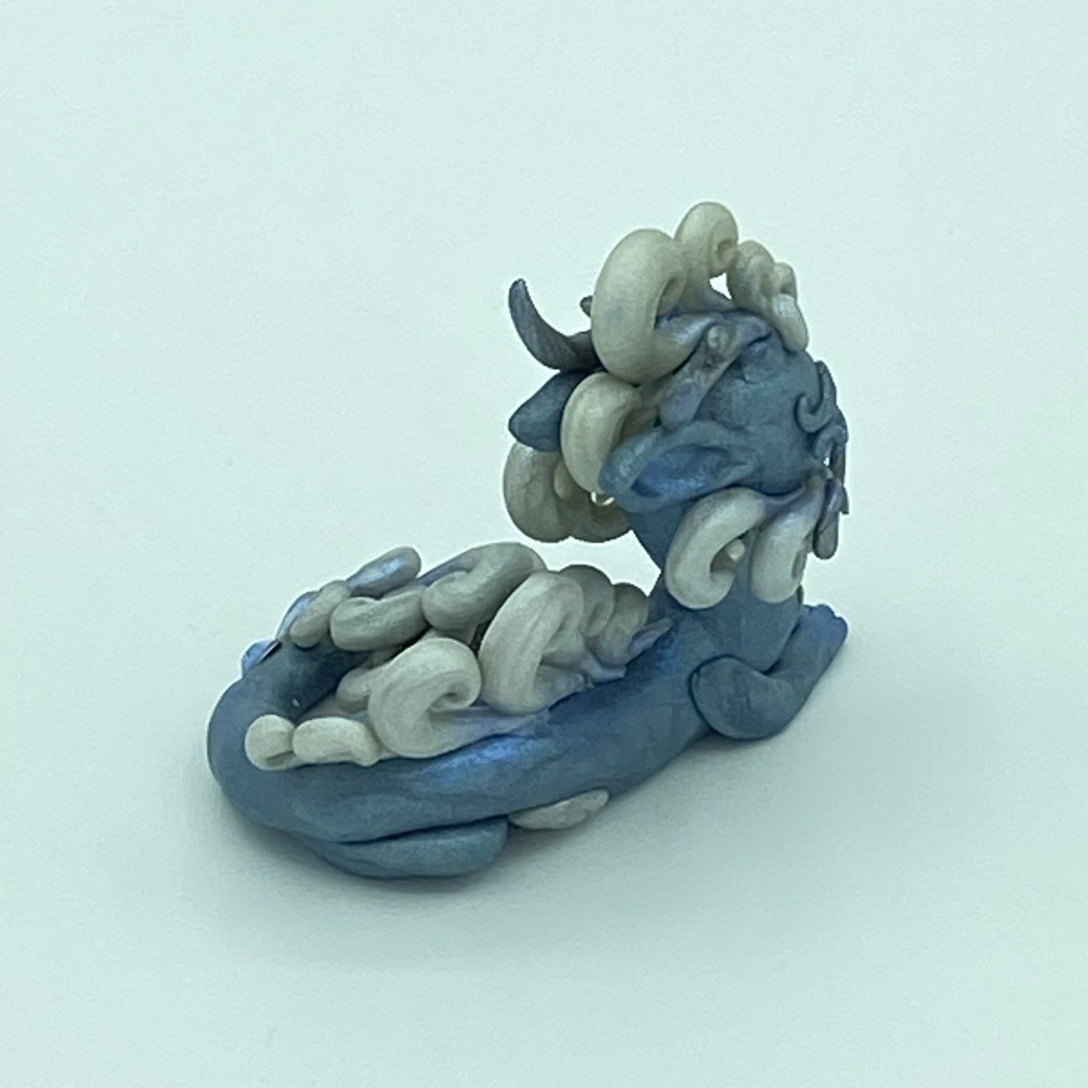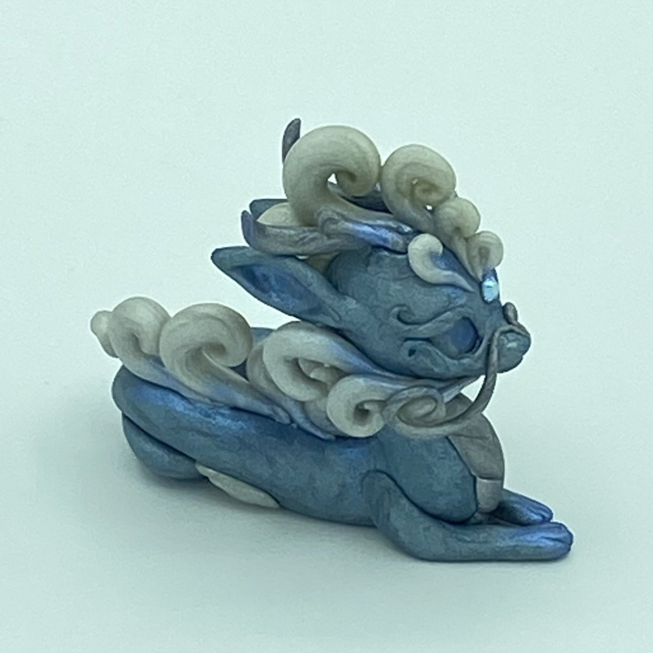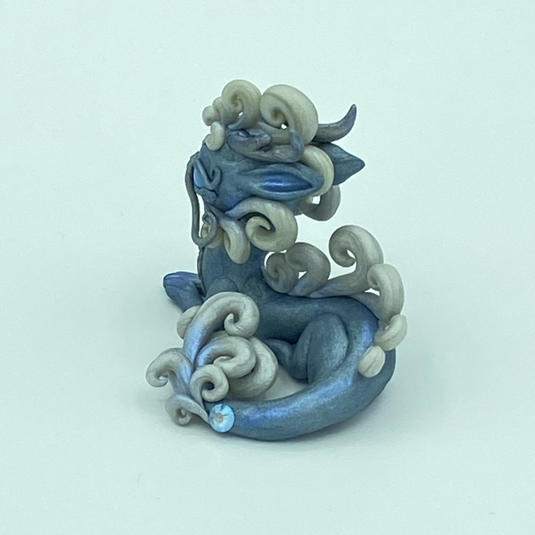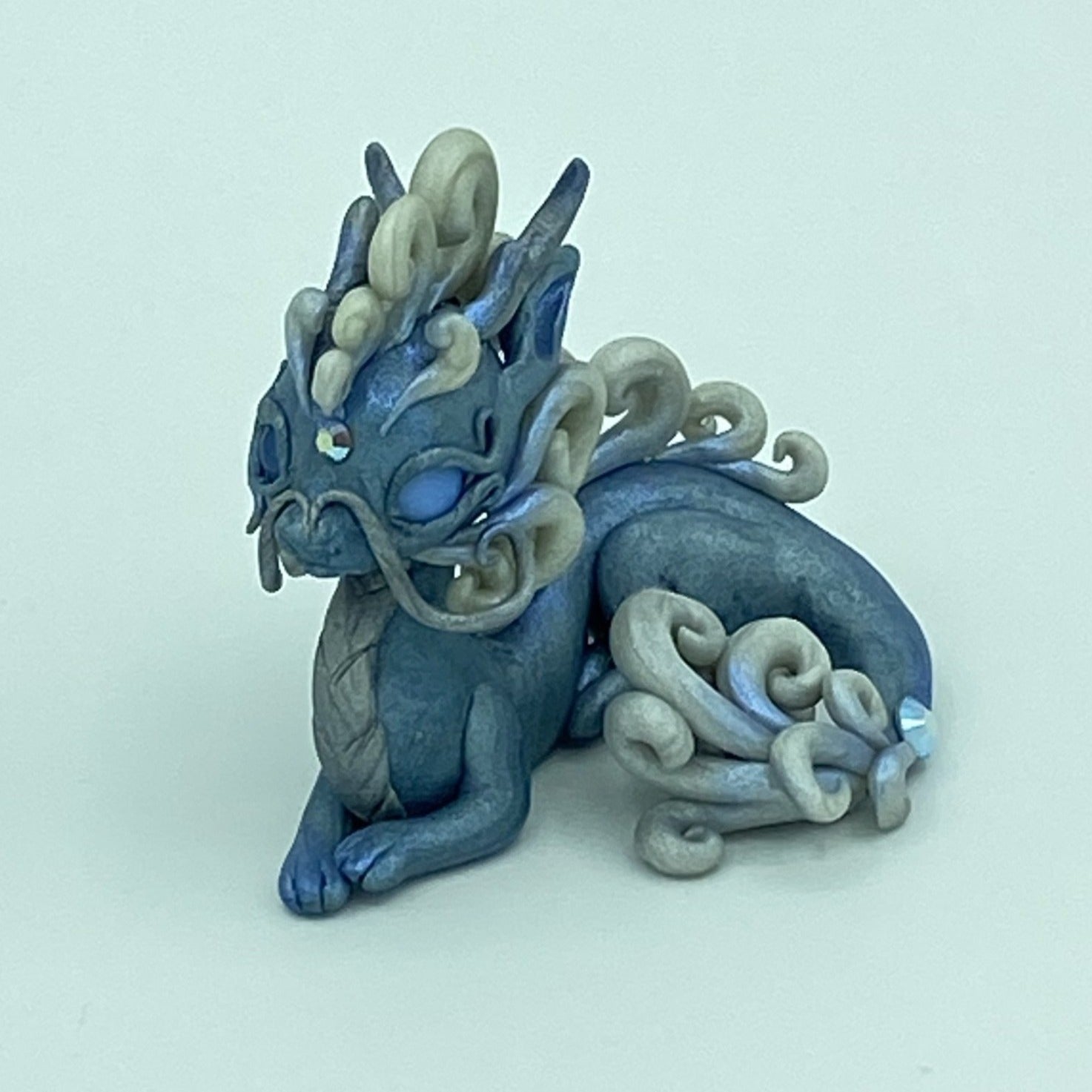 Delicate Cloud dragon in silvery blue shades with iridescent shimmer. Genuine swarovski crystals adorn his tail and forehead. Sculpted out of Polymer Clay with mica pearl powders and glass cabochon eyes.