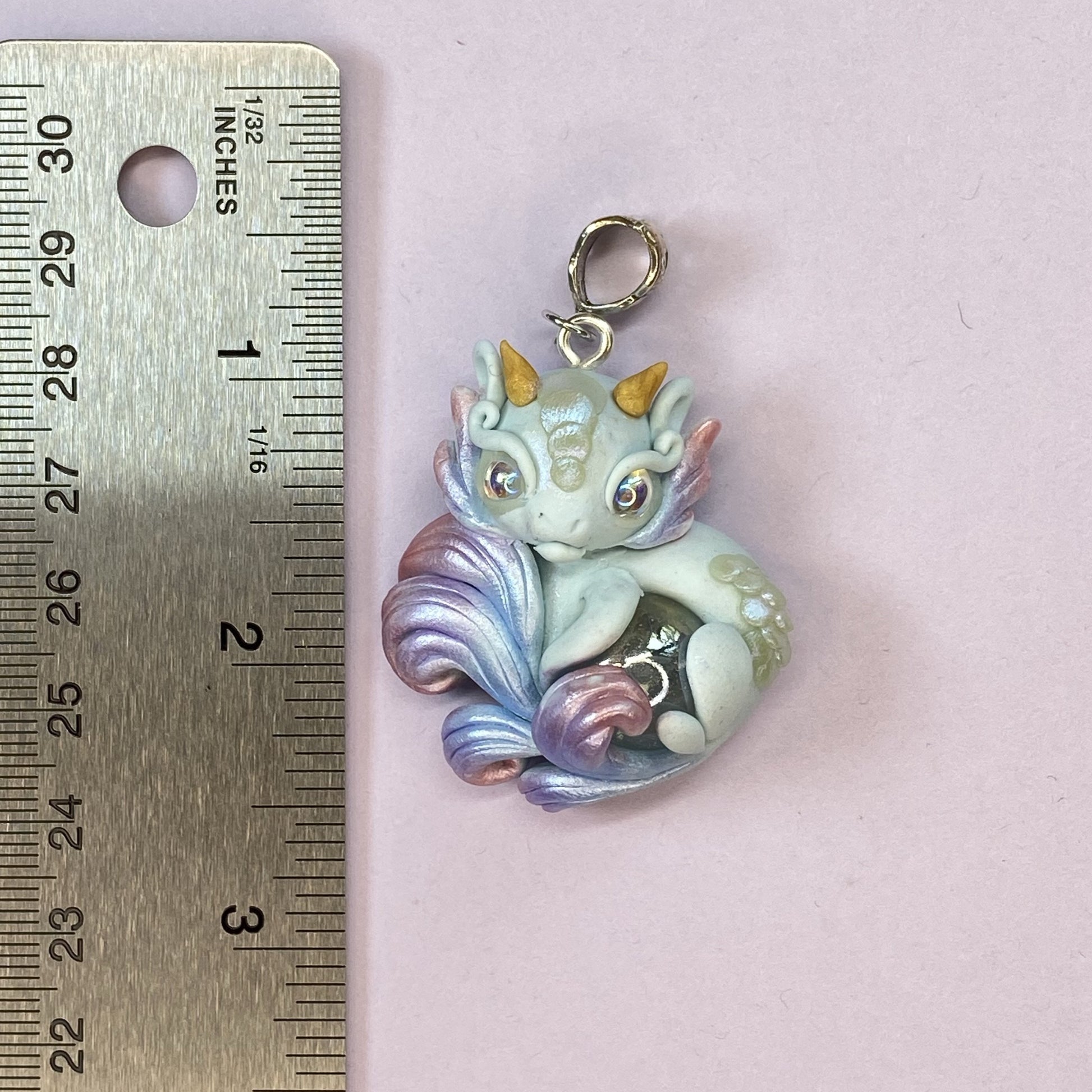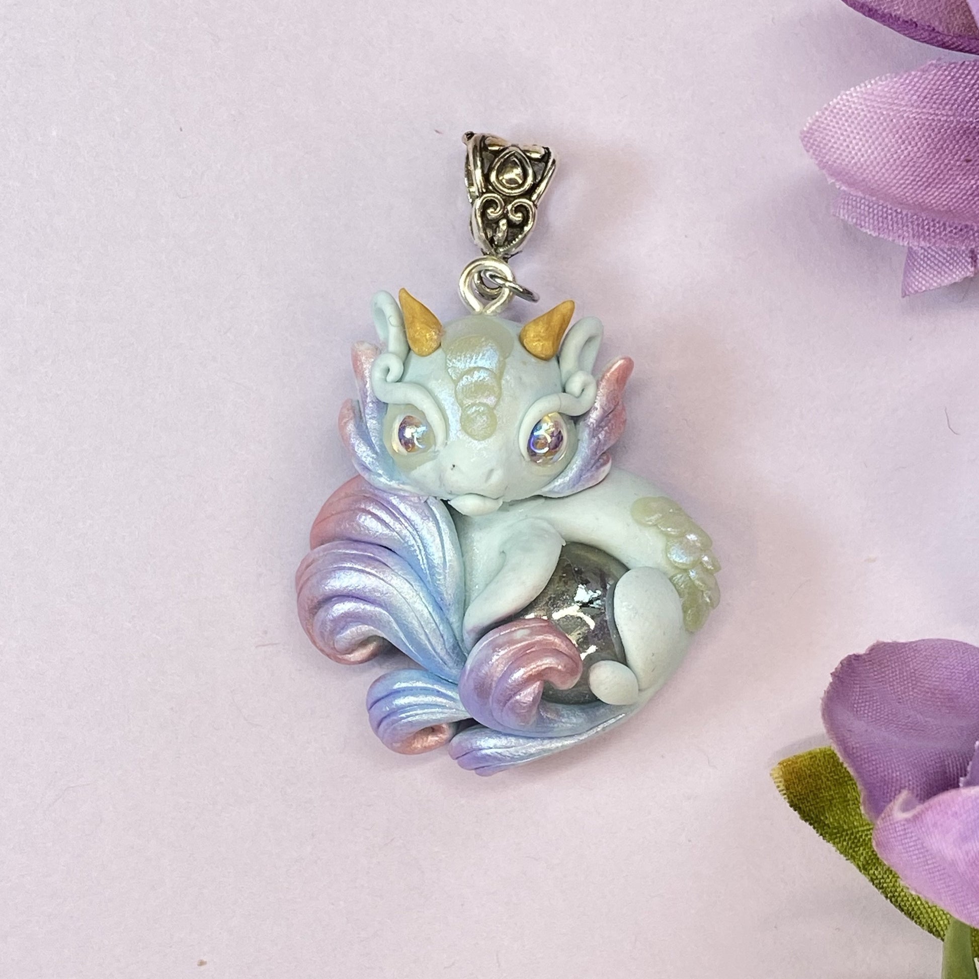 This tiny little Dragon gives off Cotton Candy vibes with her blue, purple and pink hues. Clutching her glass marble, she has pearlescent scales going down her back. Materials used include sculpey premo clay, ab crystal cabochon for eyes, pan pastel powder pigments and a glass marble. Leather necklace included.