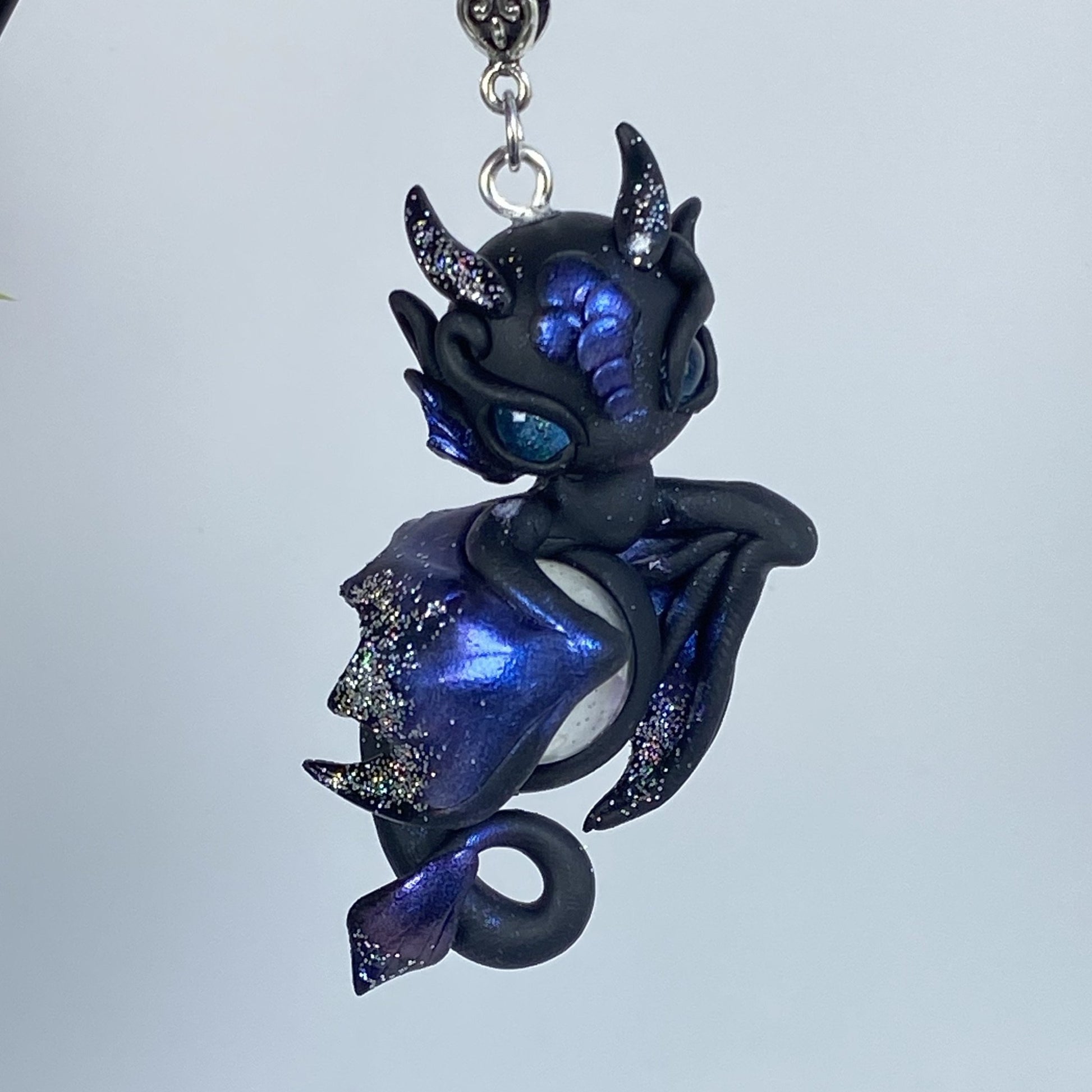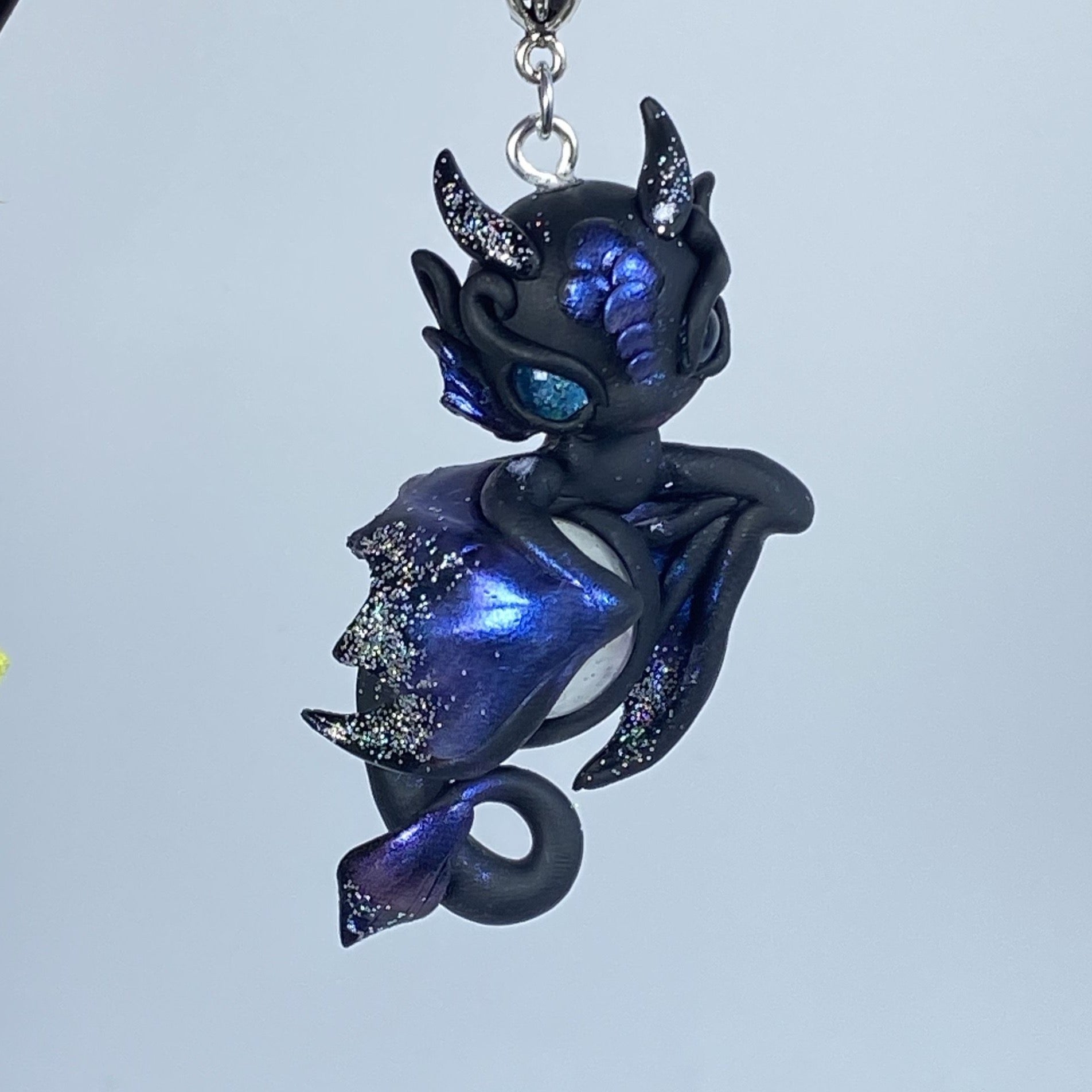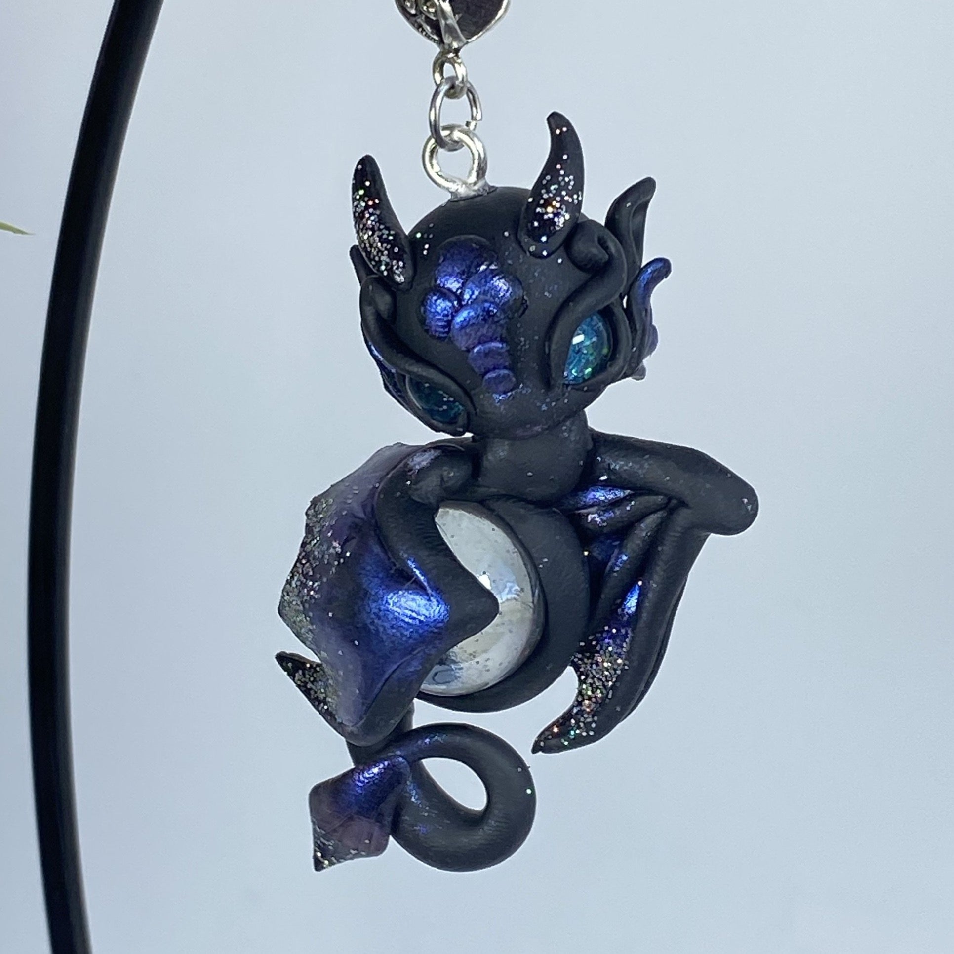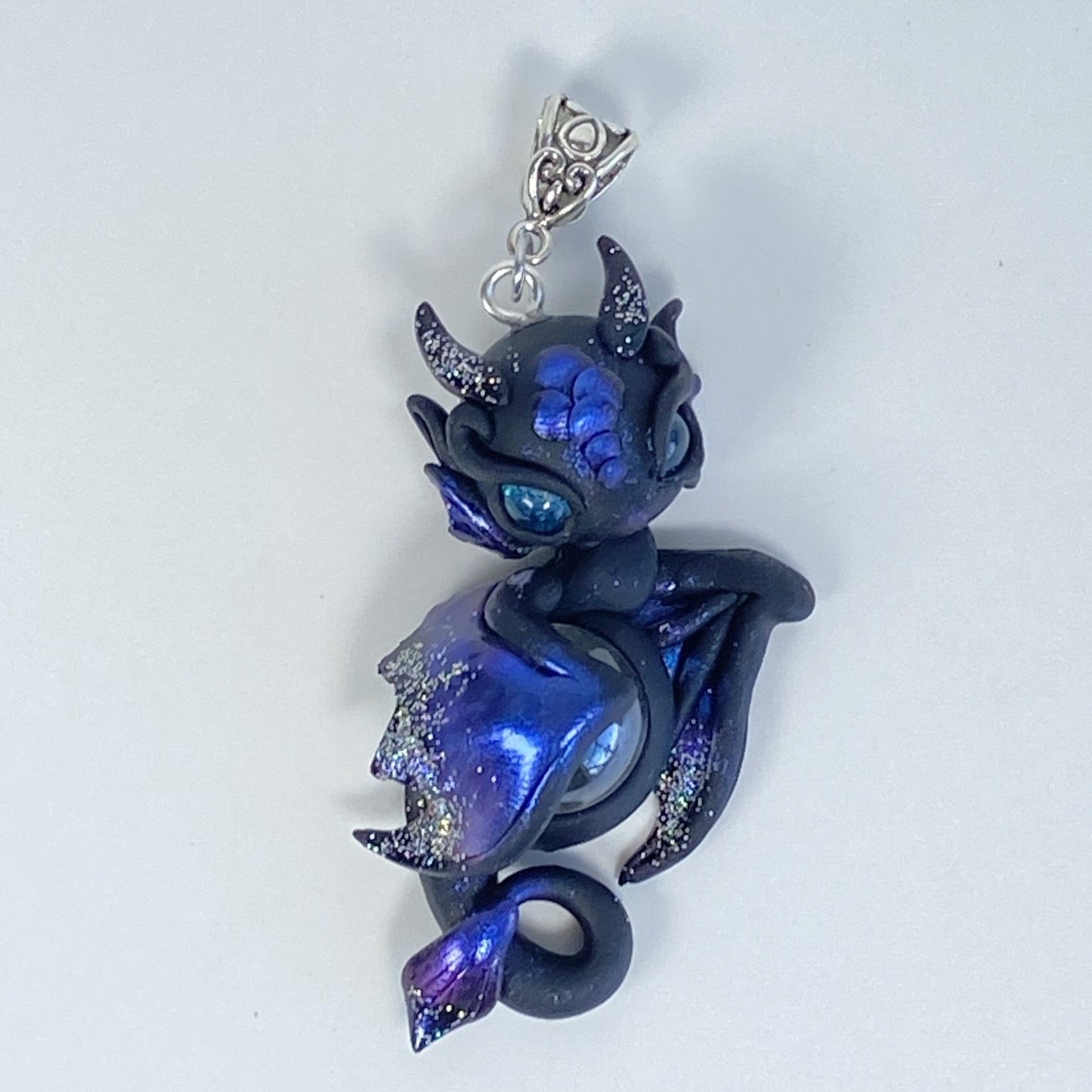 This pretty dragon carries the stars on the tips of his wings and tail. This blue and purple marble guardian has eyes that glow in the dark when charged under a light. Materials used include sculpey premo clay, holographic glitter, solar dust pigments, and glow in the dark eyes made with glow powder, resin and glass. Leather necklace included.