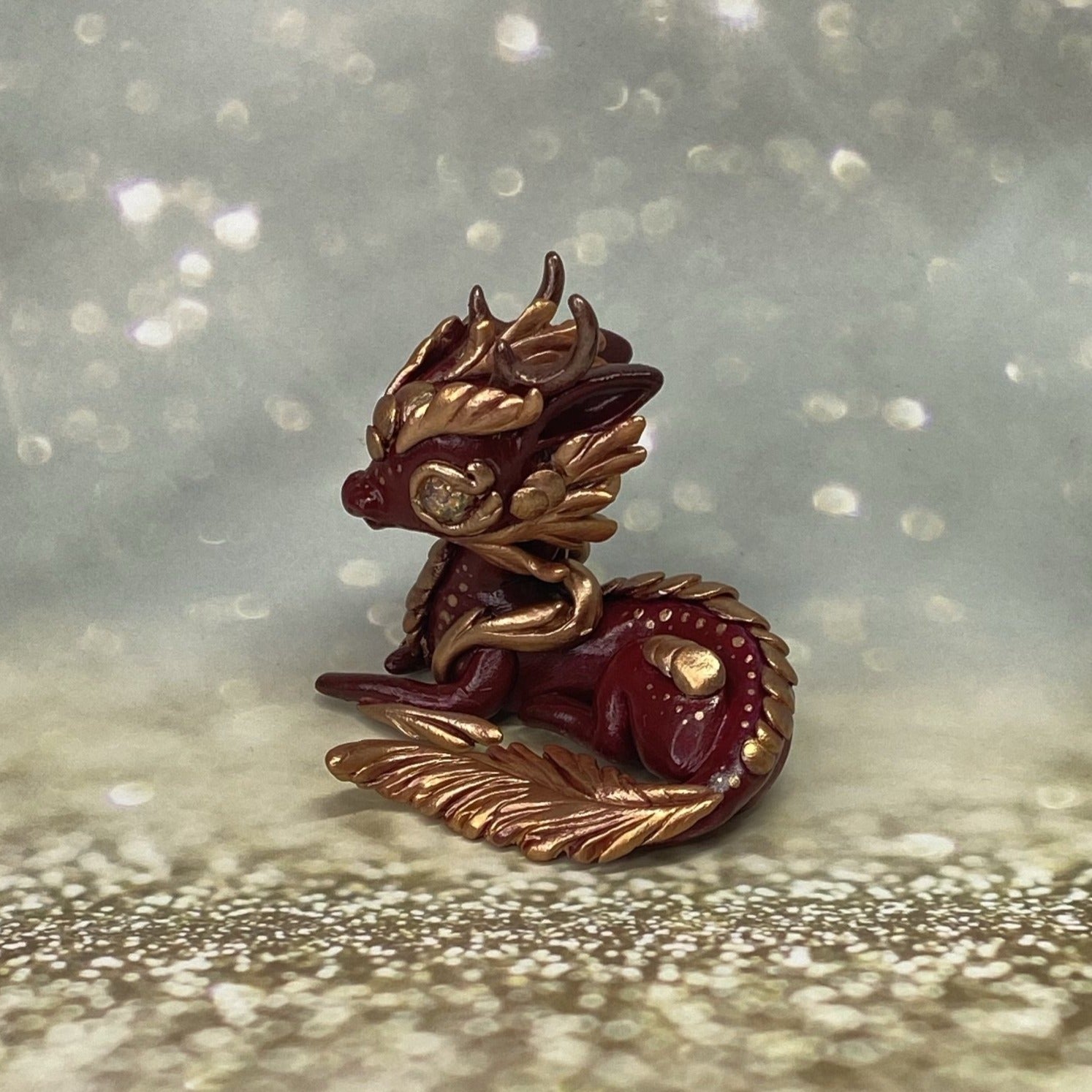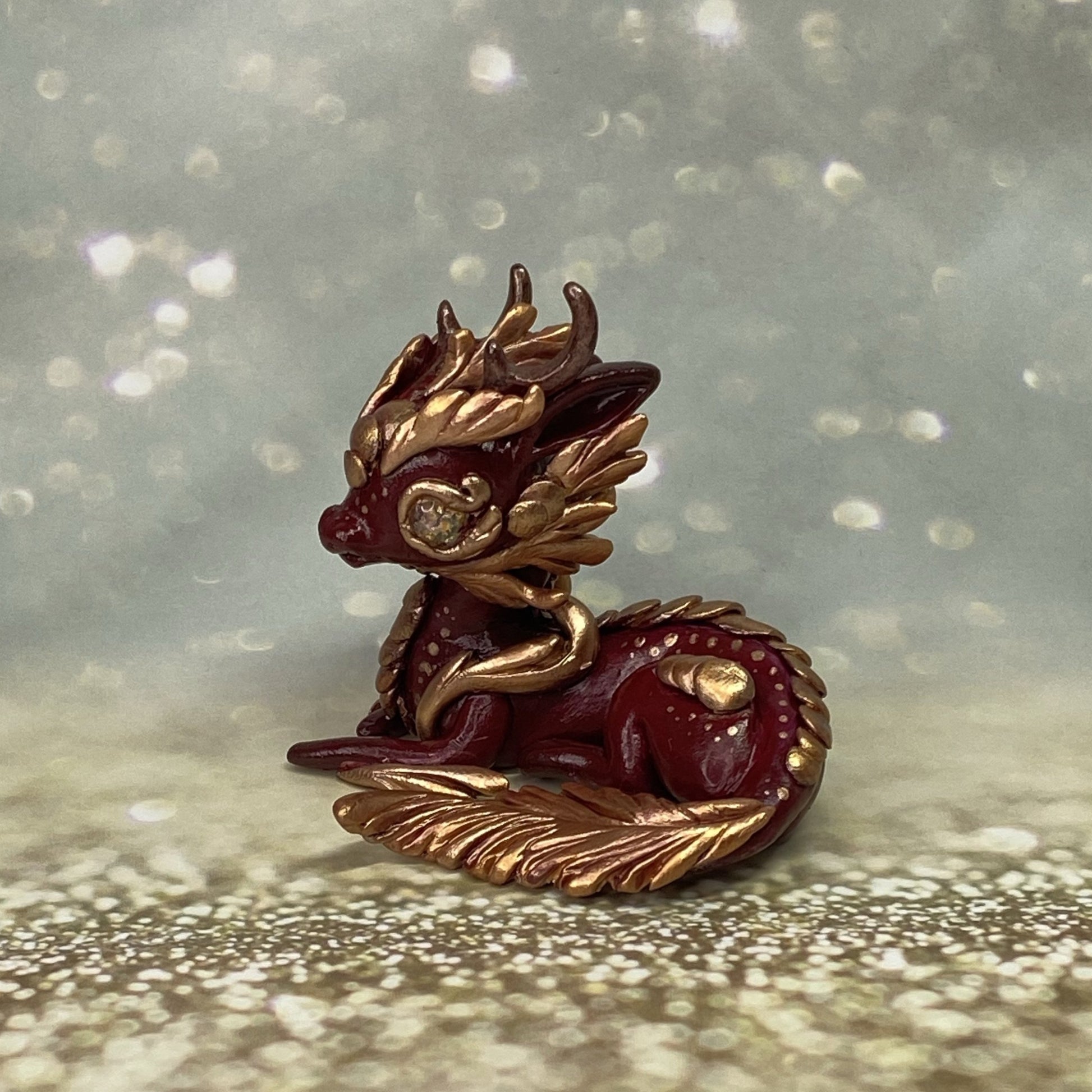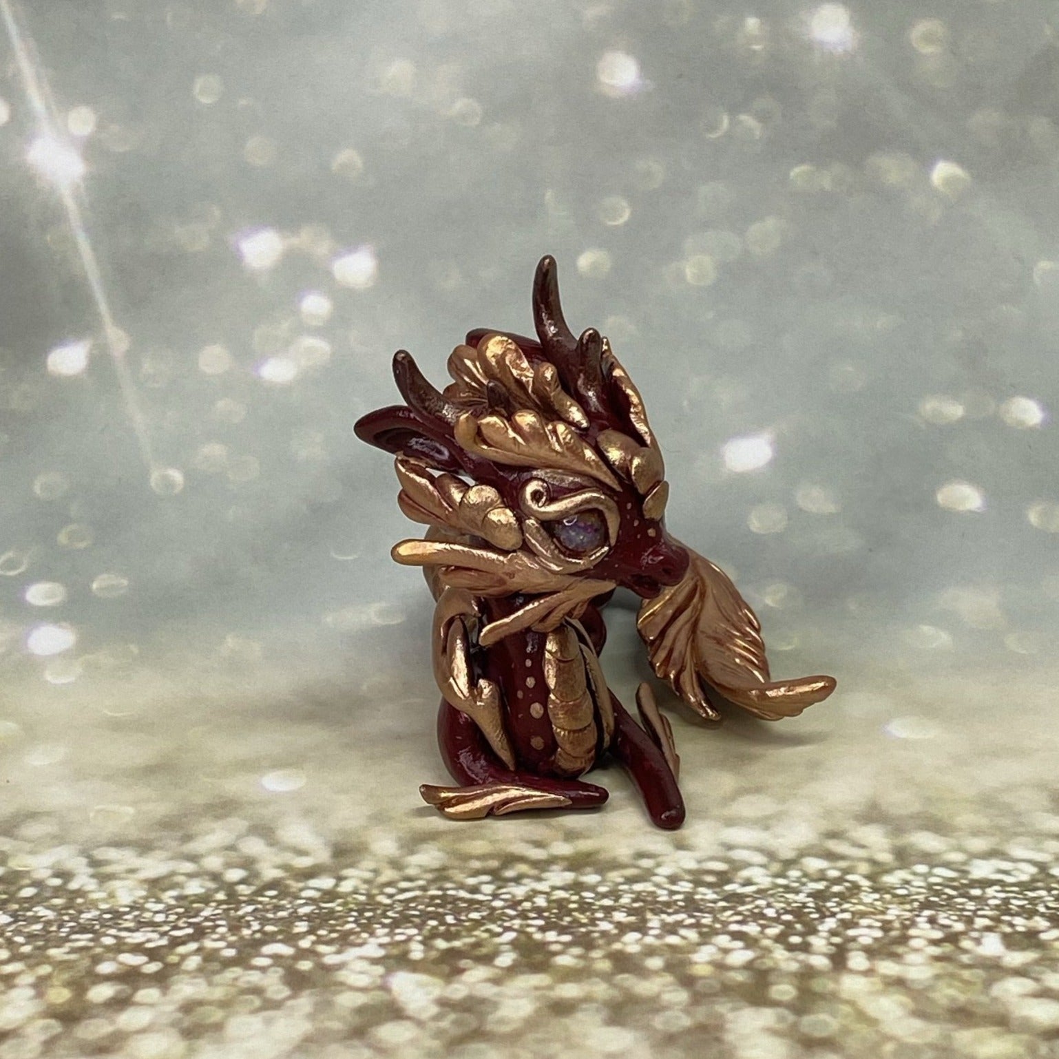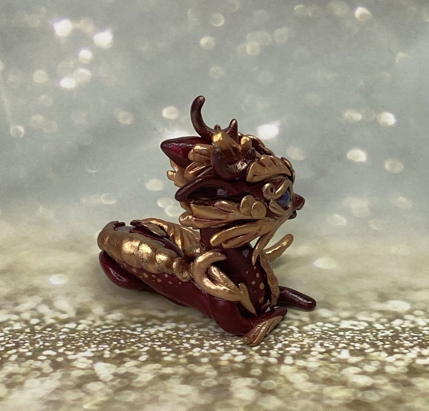 Dark burgundy Dragon accentuated with varying shades of Rose Gold. Fire opal cabochon glass eyes, sculpted entirely by hand out of Polymer Sculpey clay and painted with acrylic paints.