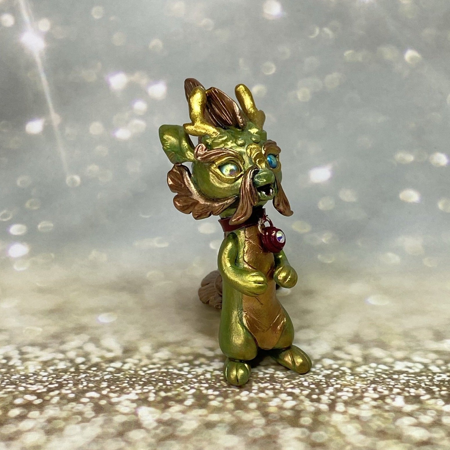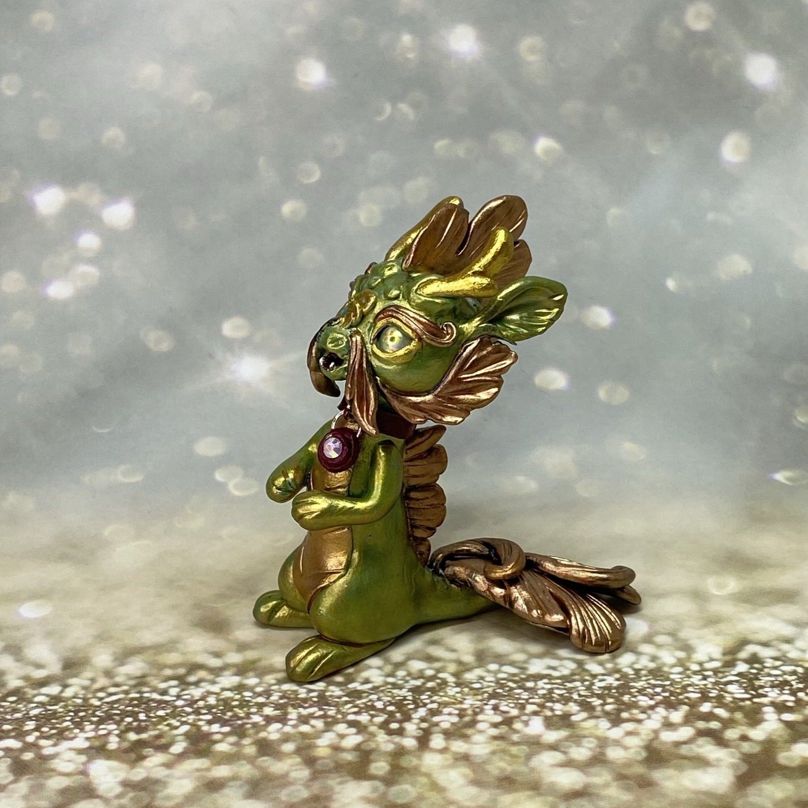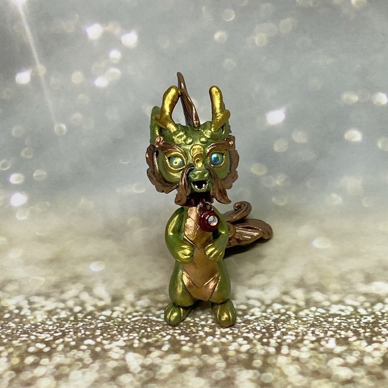 Little chibi dragon is smiling and showing off his two tiny white teeth! Painted in shades of golden green, rose gold and gold hues, he has a collar with a swarovski crystal pendant around his neck. Sculpted by hand out of Super Sculpey Polymer clay and painted with acrylic paints. Czech AB glass cabachons for eyes.