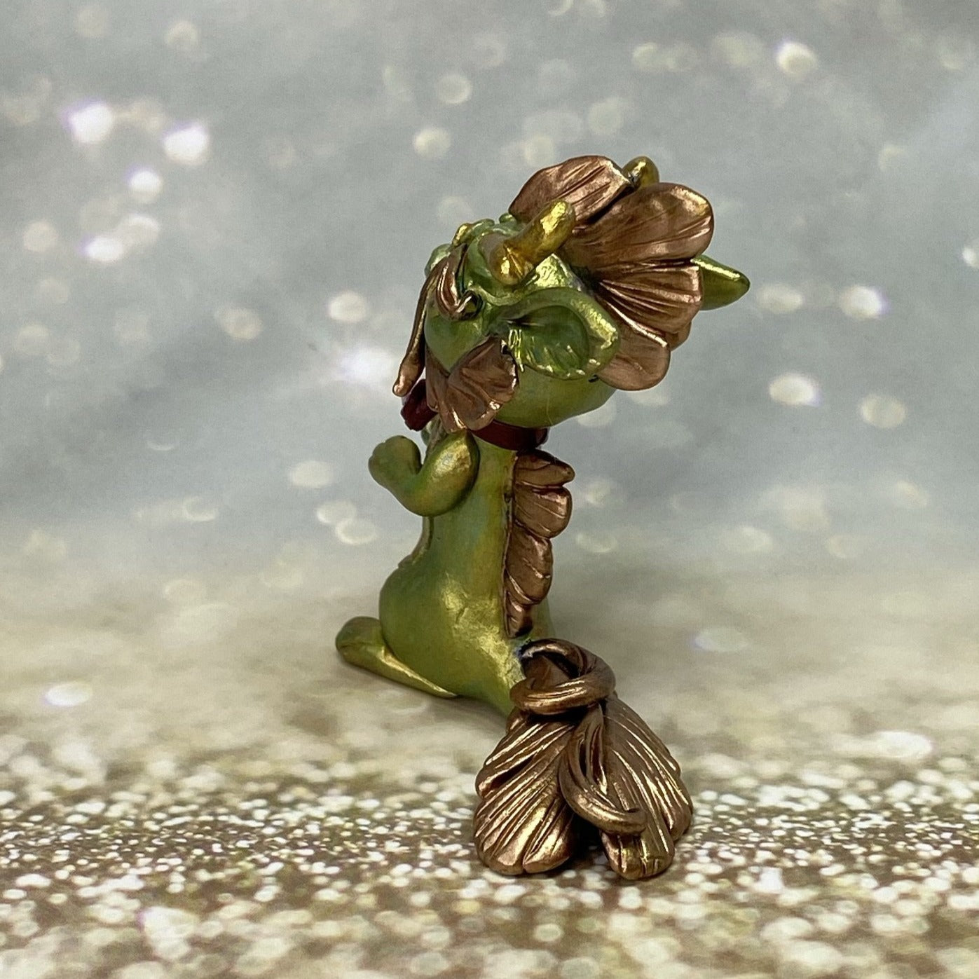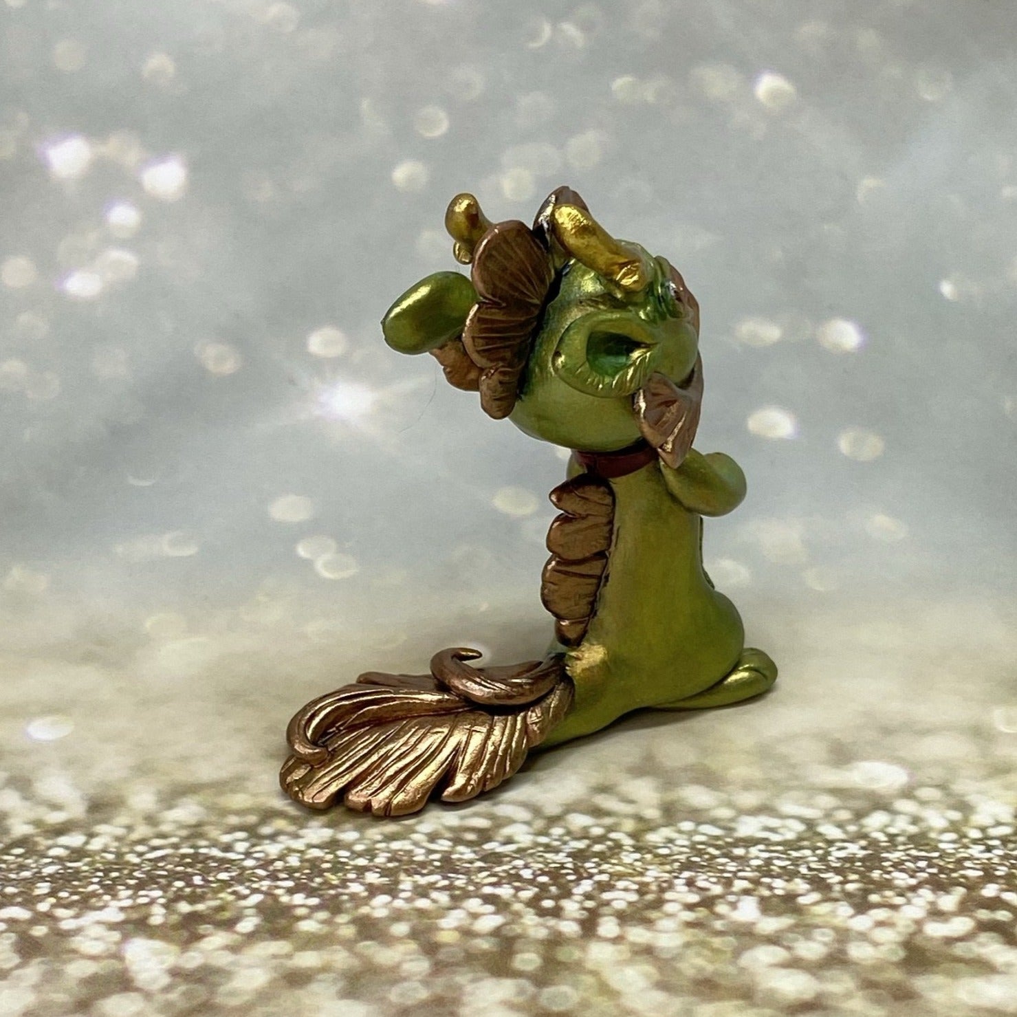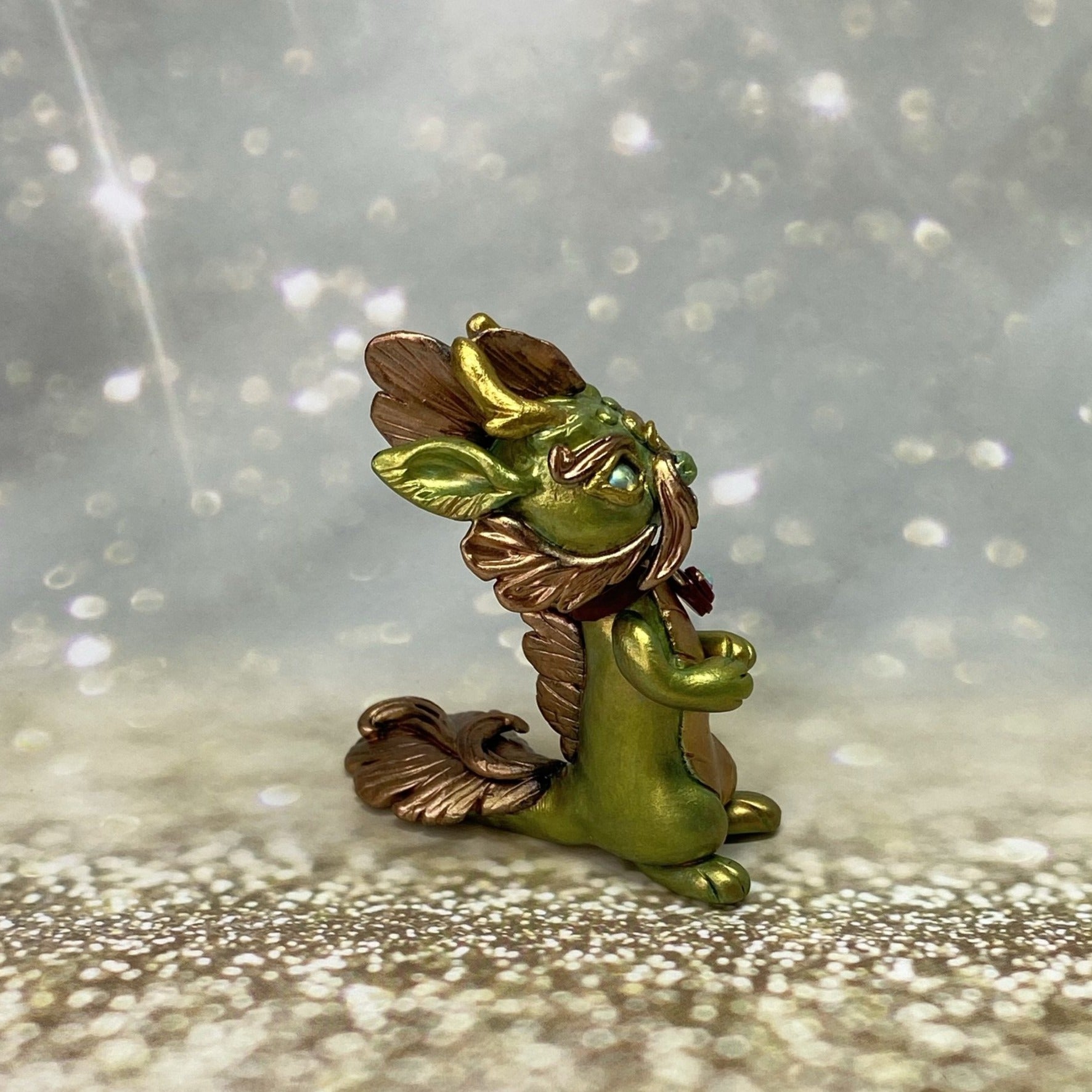 Little chibi dragon is smiling and showing off his two tiny white teeth! Painted in shades of golden green, rose gold and gold hues, he has a collar with a swarovski crystal pendant around his neck. Sculpted by hand out of Super Sculpey Polymer clay and painted with acrylic paints. Czech AB glass cabachons for eyes.