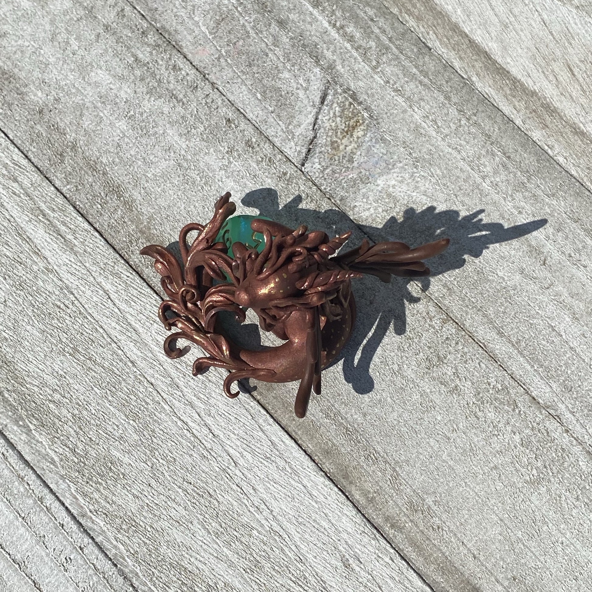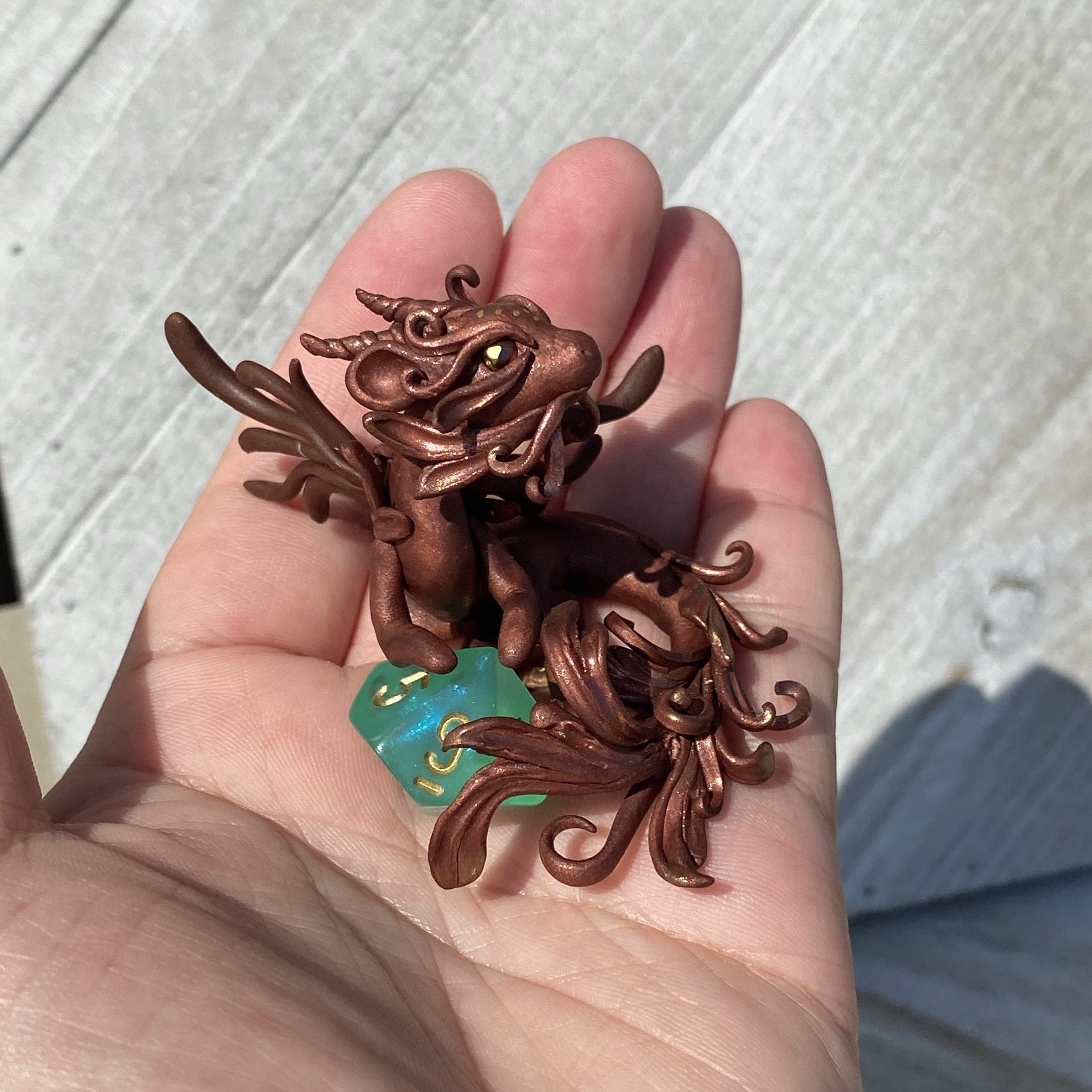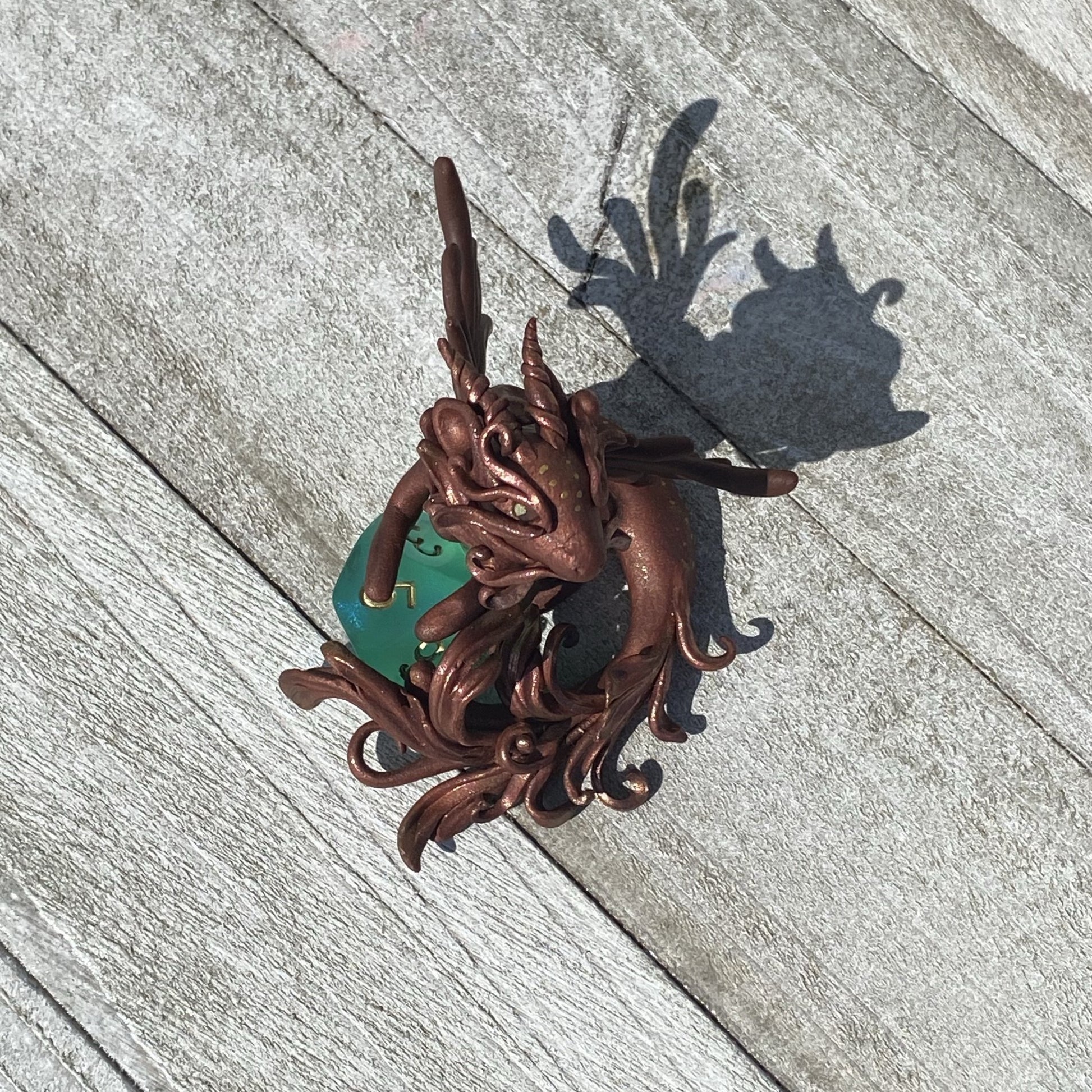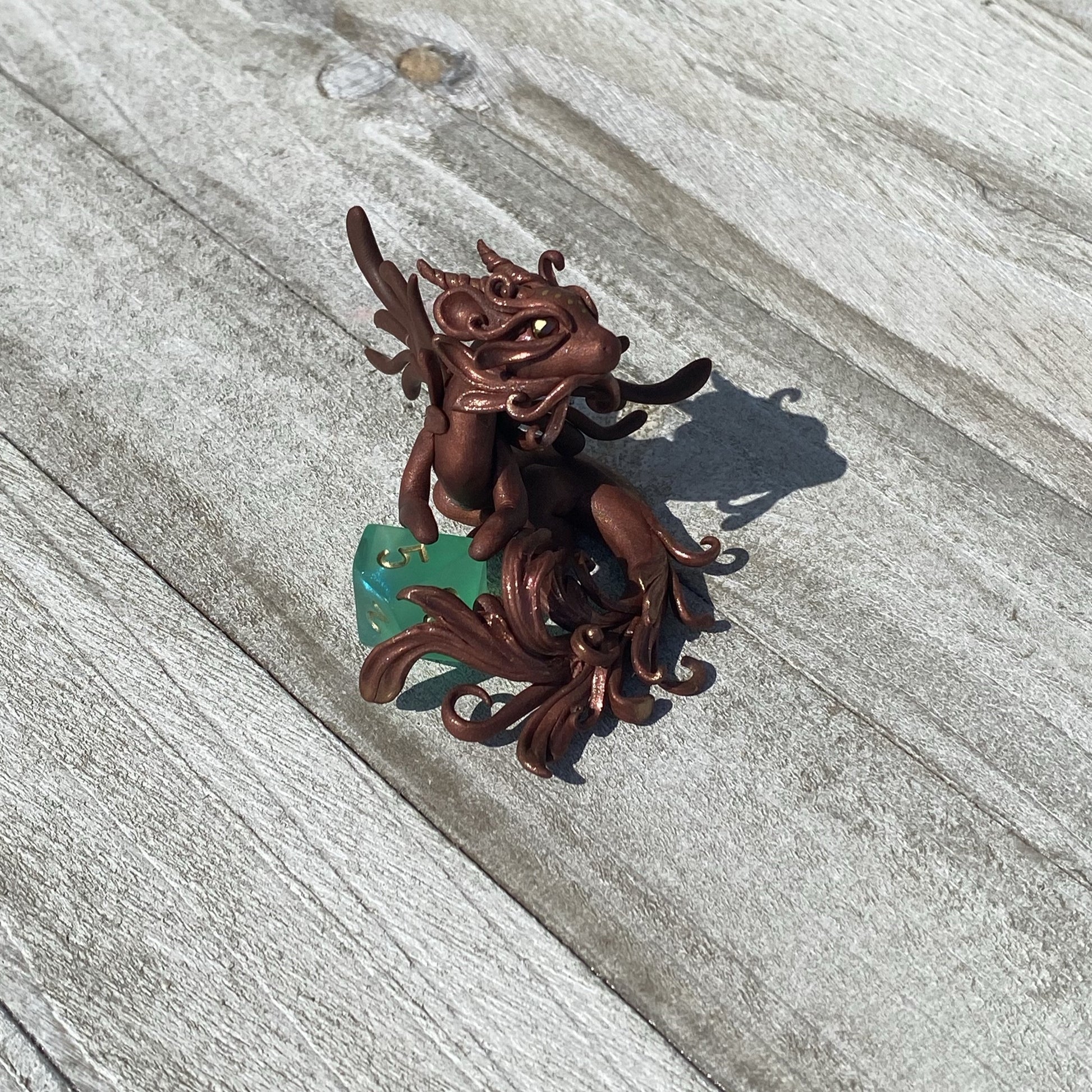 Copper Bronze Dragon has delicate wings and frill as she guards her 10 sided aurora borealis colored die. Gold and copper pearl mica powders were used as well as swarovski crystal beads for her eyes. Sculpted entirely by hand in Premo Sculpey polymer clay. Die is not attached.
