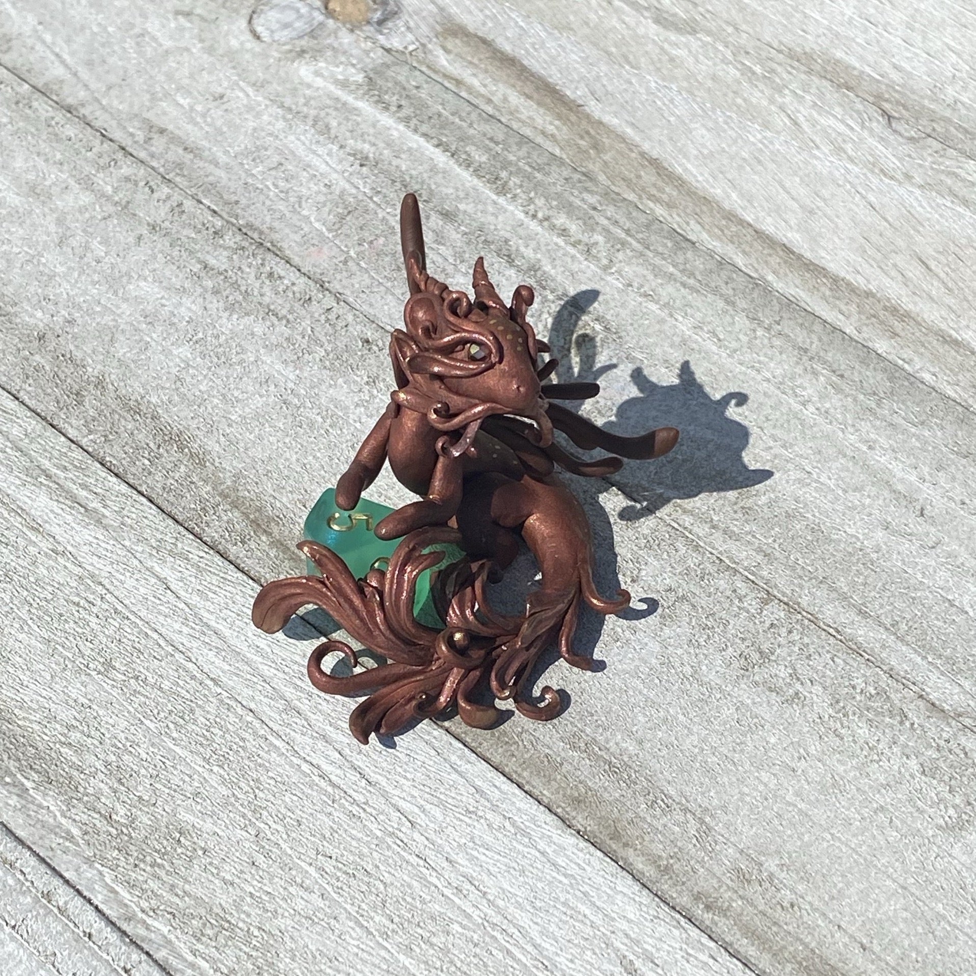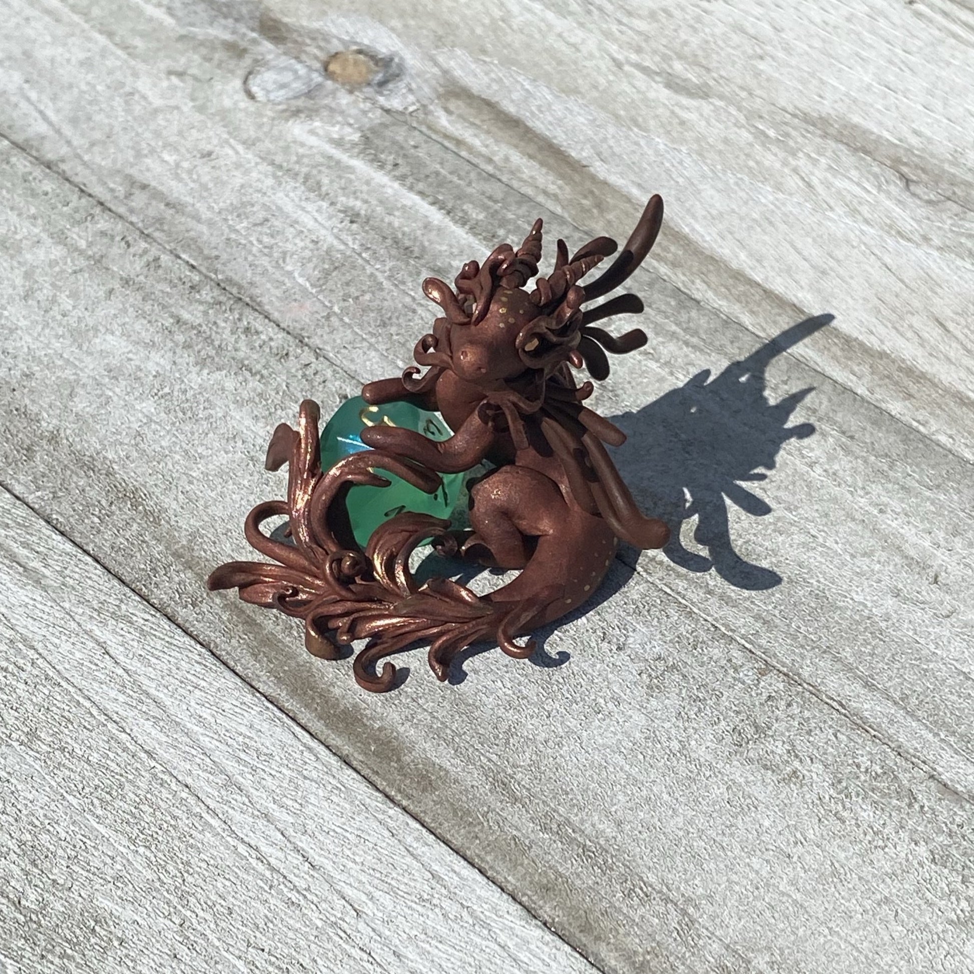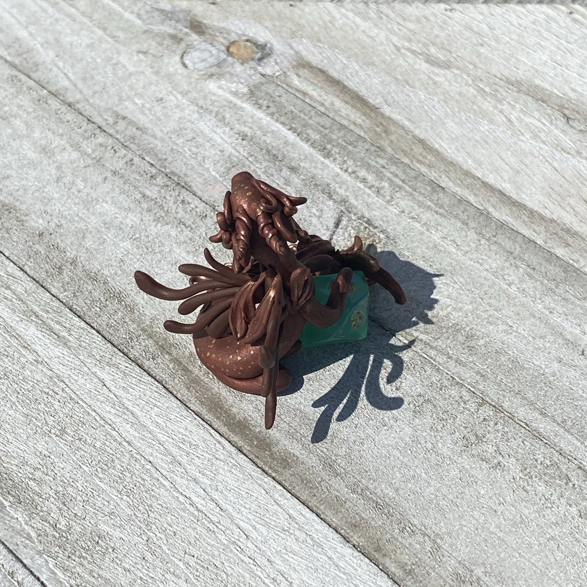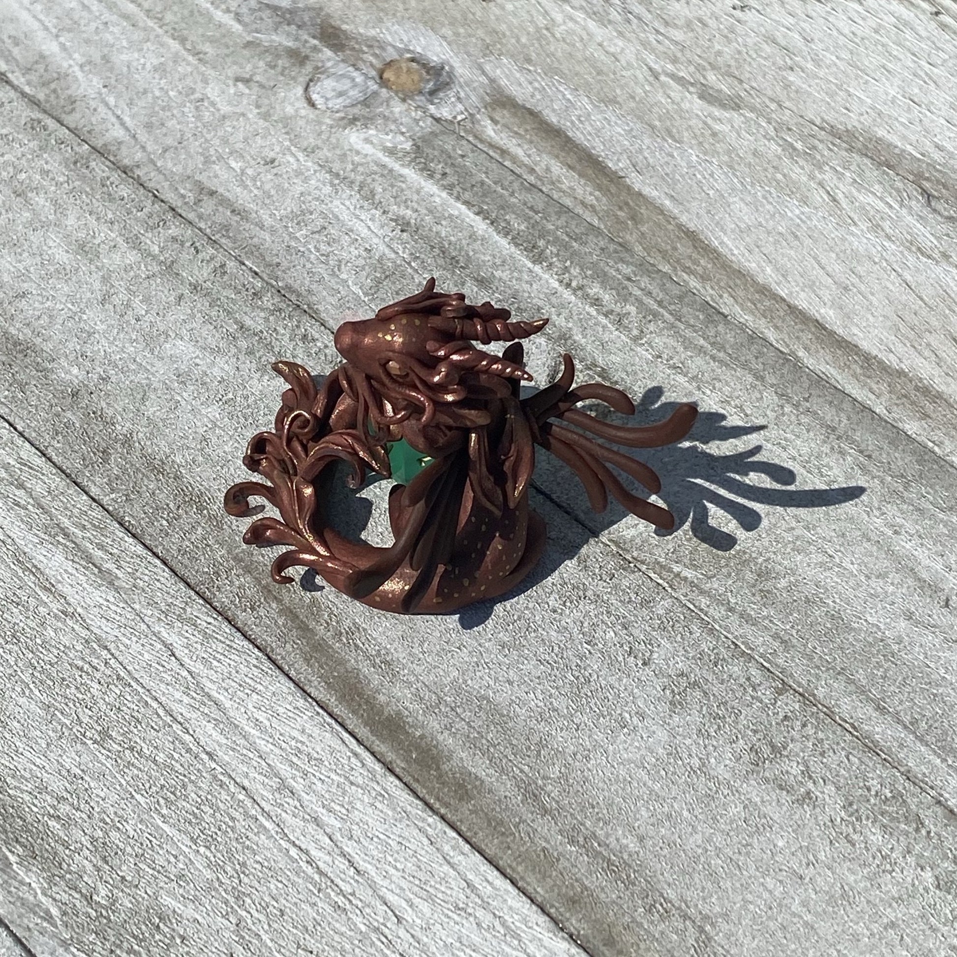Copper Bronze Dragon has delicate wings and frill as she guards her 10 sided aurora borealis colored die. Gold and copper pearl mica powders were used as well as swarovski crystal beads for her eyes. Sculpted entirely by hand in Premo Sculpey polymer clay. Die is not attached.