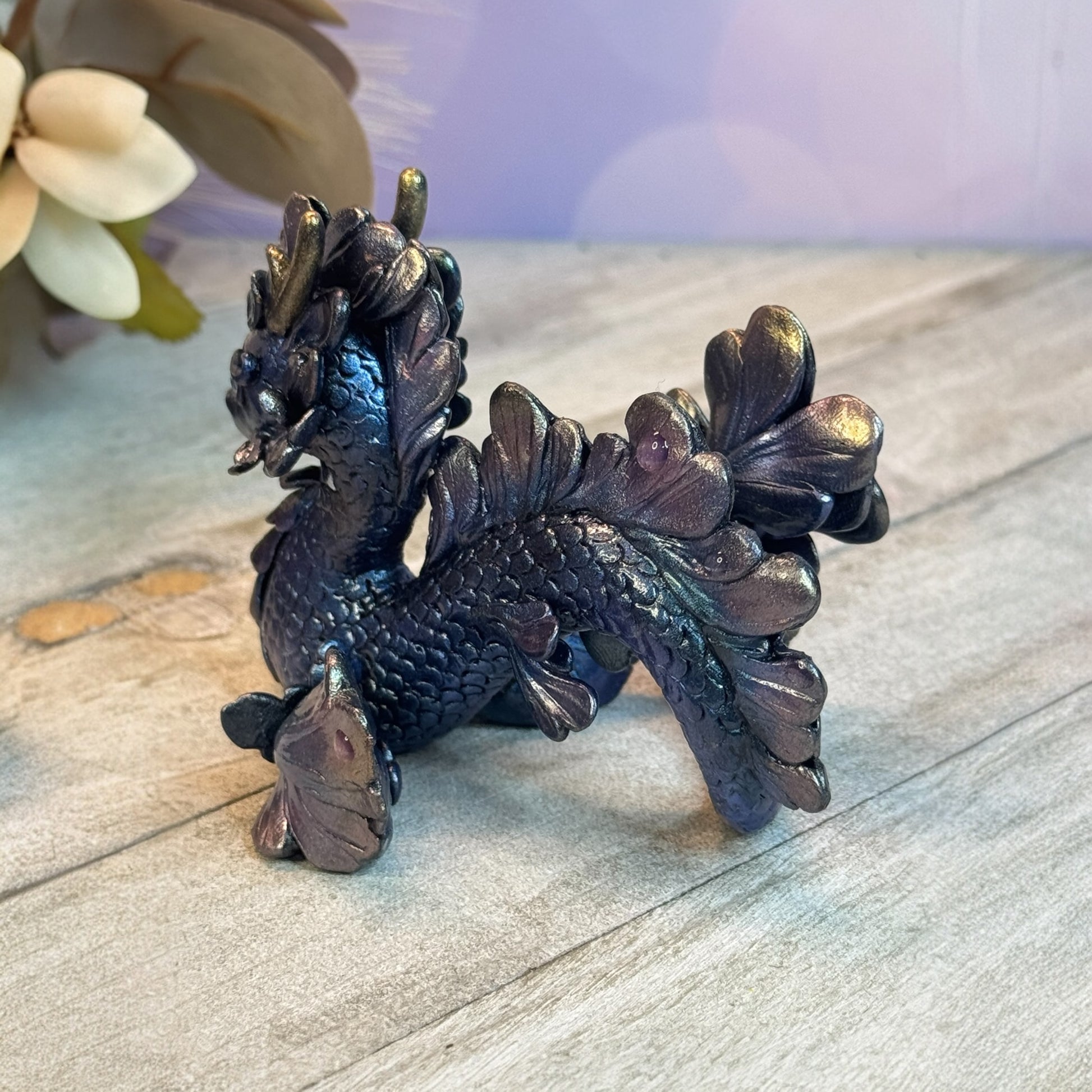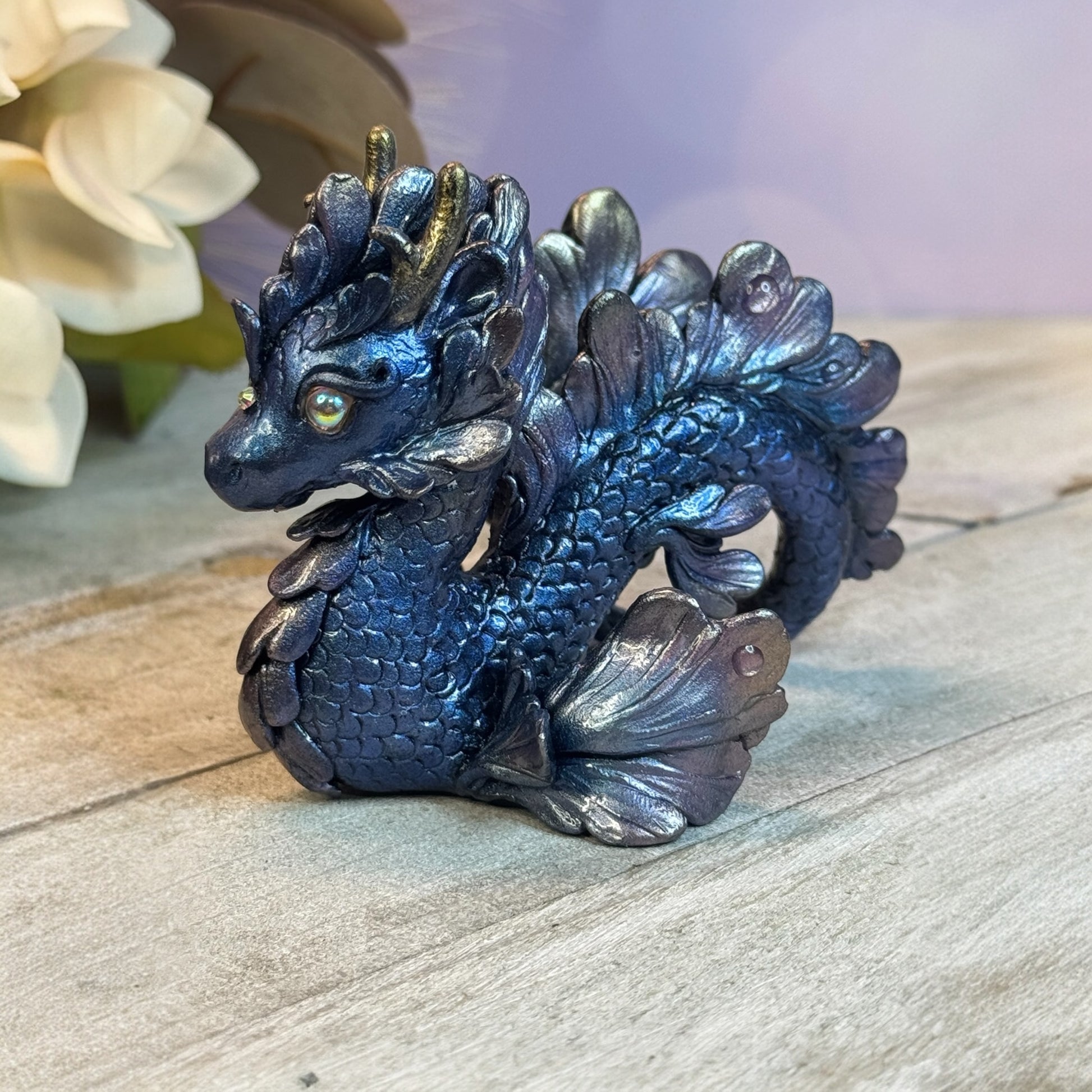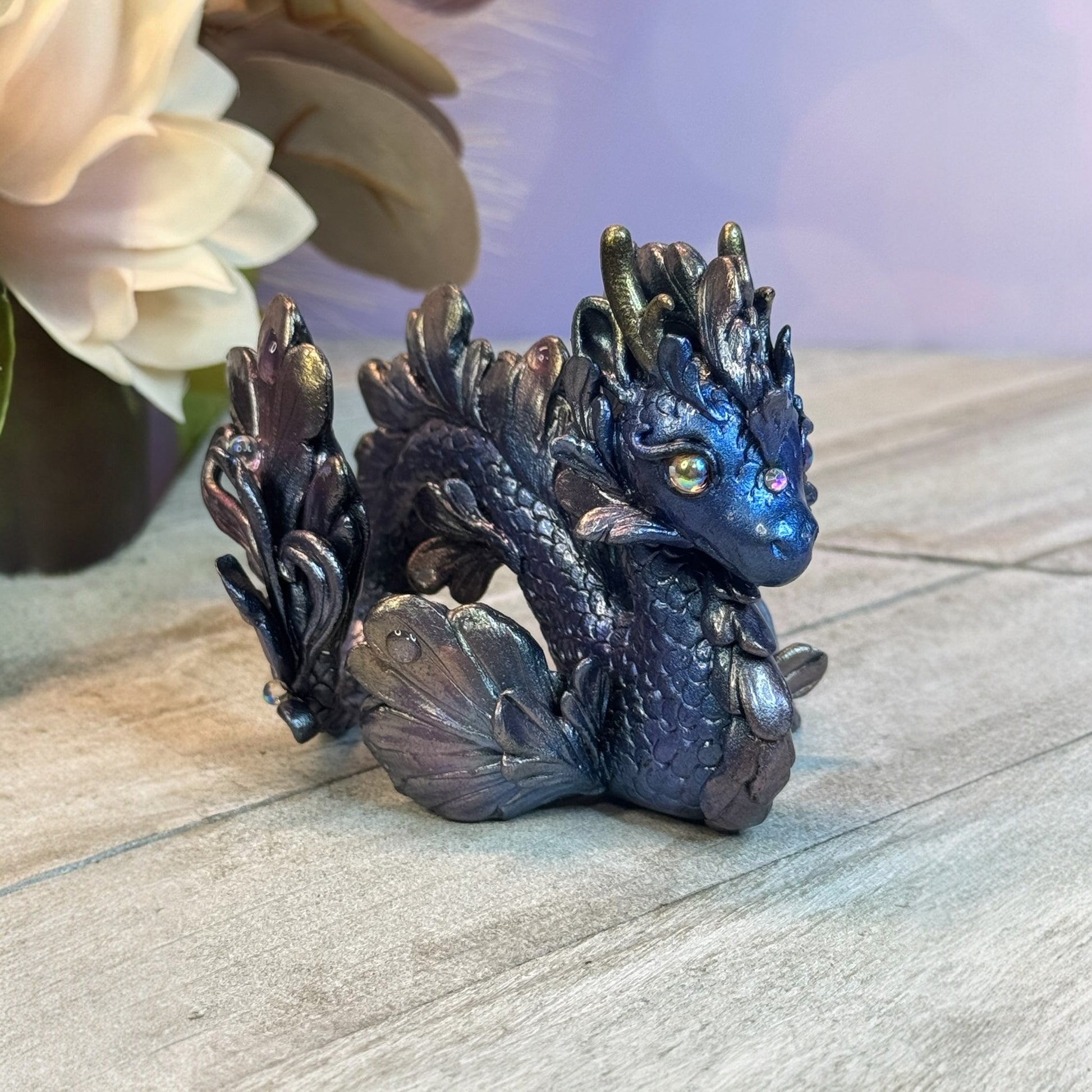 Introducing the Dark Blue Kelpie Dragon, a unique and whimsical creation made with preciosa czech ab crystal, cosclay polymer clay, and acrylic paint. Shimmery dark blue scales, silvery purple mane and tail fins make it a stand out piece. Add a touch of playfulness to your collection with this one-of-a-kind dragon!