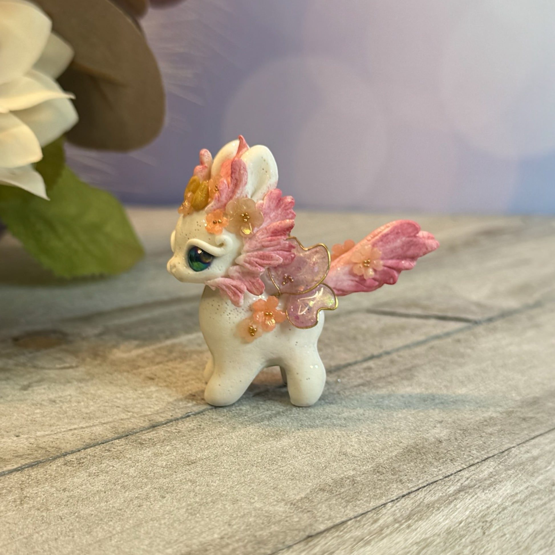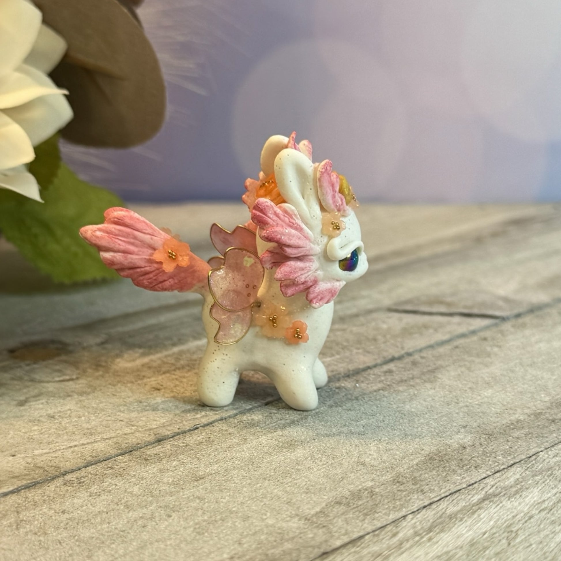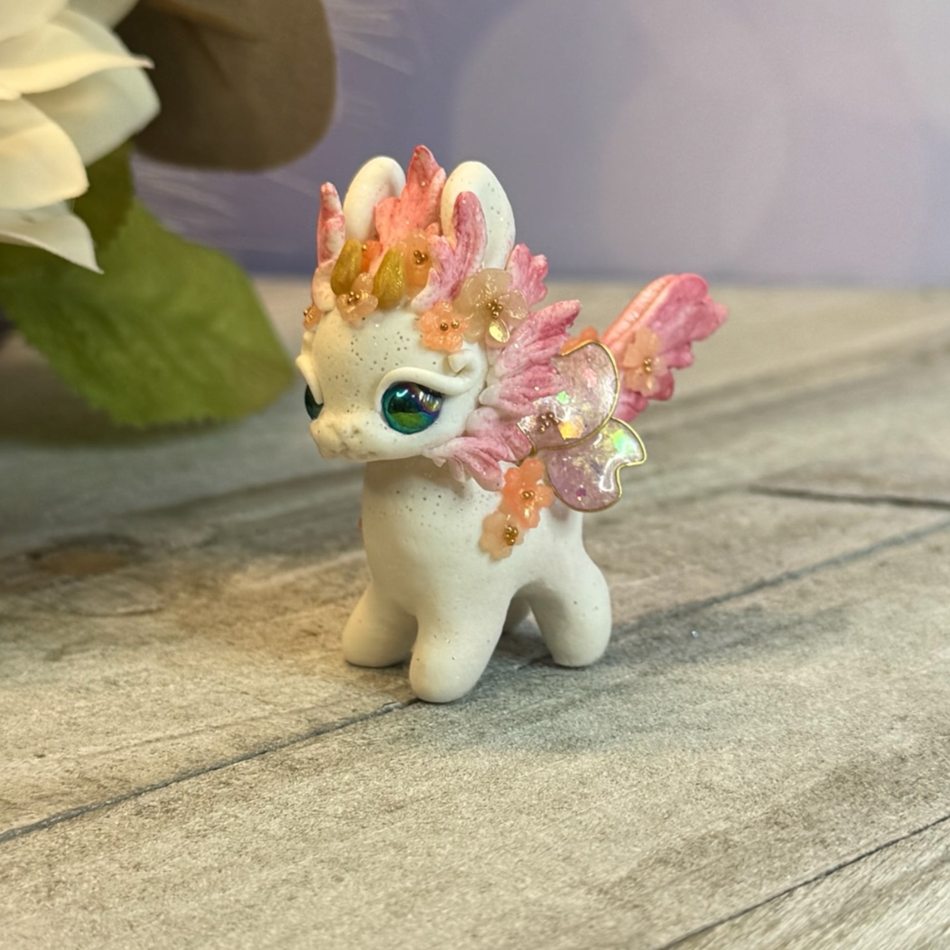 Meet the Dark Pink Bunnigon, a playful little creature handmade with love from premo polymer clay. Adorned with resin and wire cherry blossom wings, glass bead eyes, and gold seed beads, this whimsical desk pet doubles as a guardian for your workspace. It's a one-of-a-kind addition to your collection!