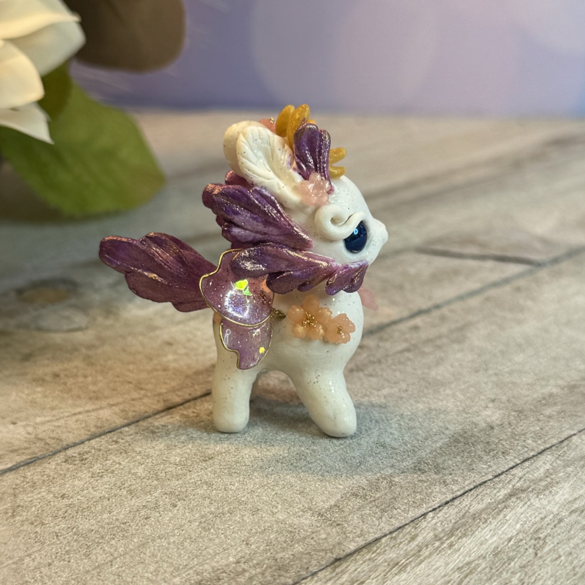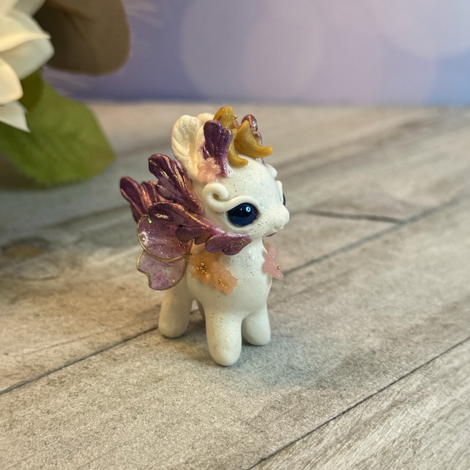 Meet the Dark Purple Shimmer Bunnigon, a playful little creature handmade with love from premo polymer clay. Adorned with resin and wire cherry blossom wings, glass bead eyes, and gold seed beads, this whimsical desk pet doubles as a guardian for your workspace. It's a one-of-a-kind addition to your collection!