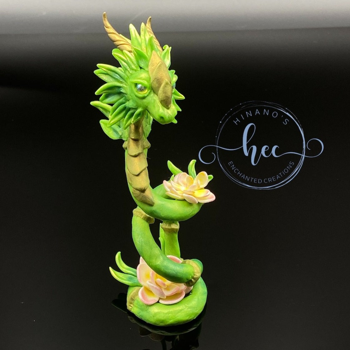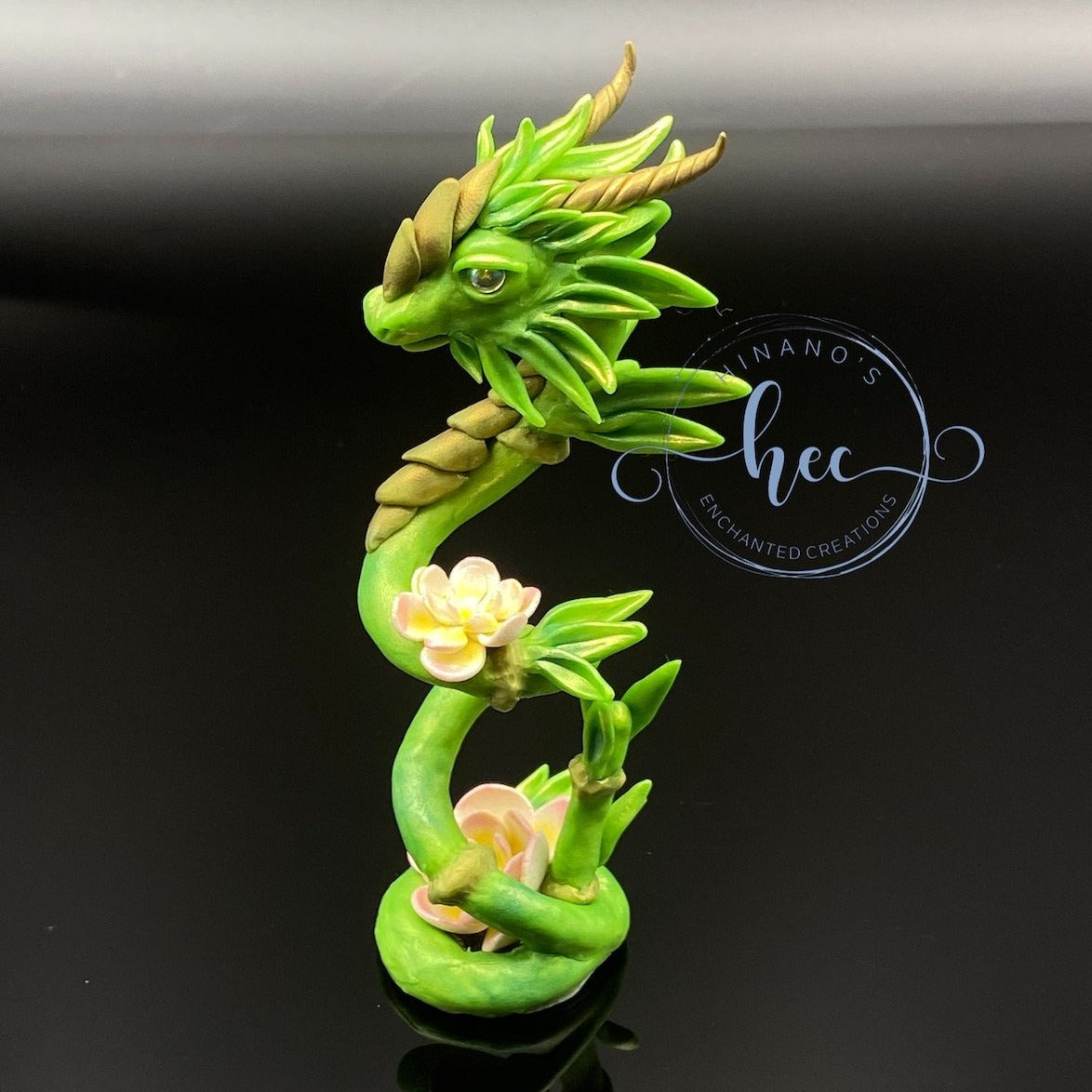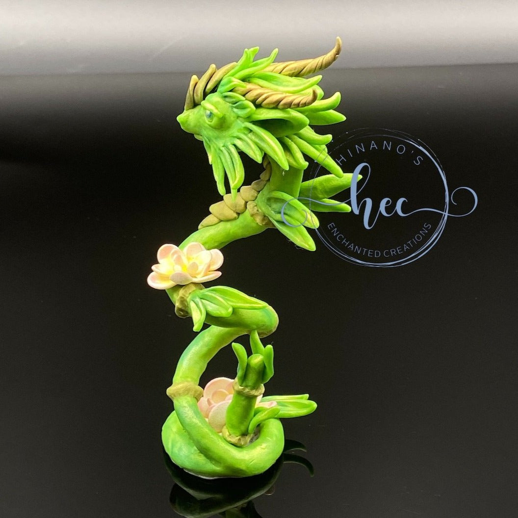 Lucky Emperor Bamboo Dragon. Not only does he give you luck, but he helps to guard your dreams! Sculpted in Sculpey Premo Polymer Clay with AB czech glass cabachons for eyes.