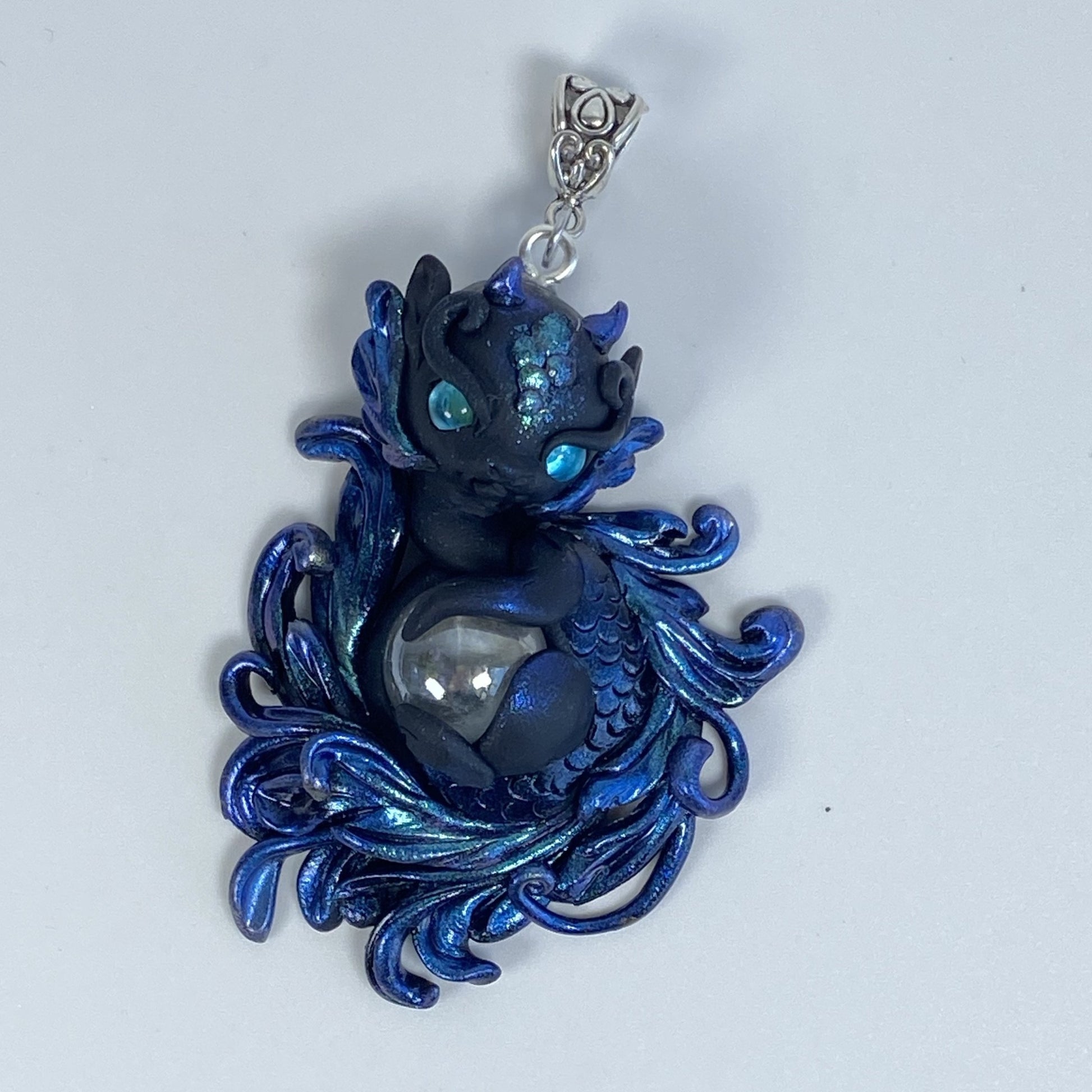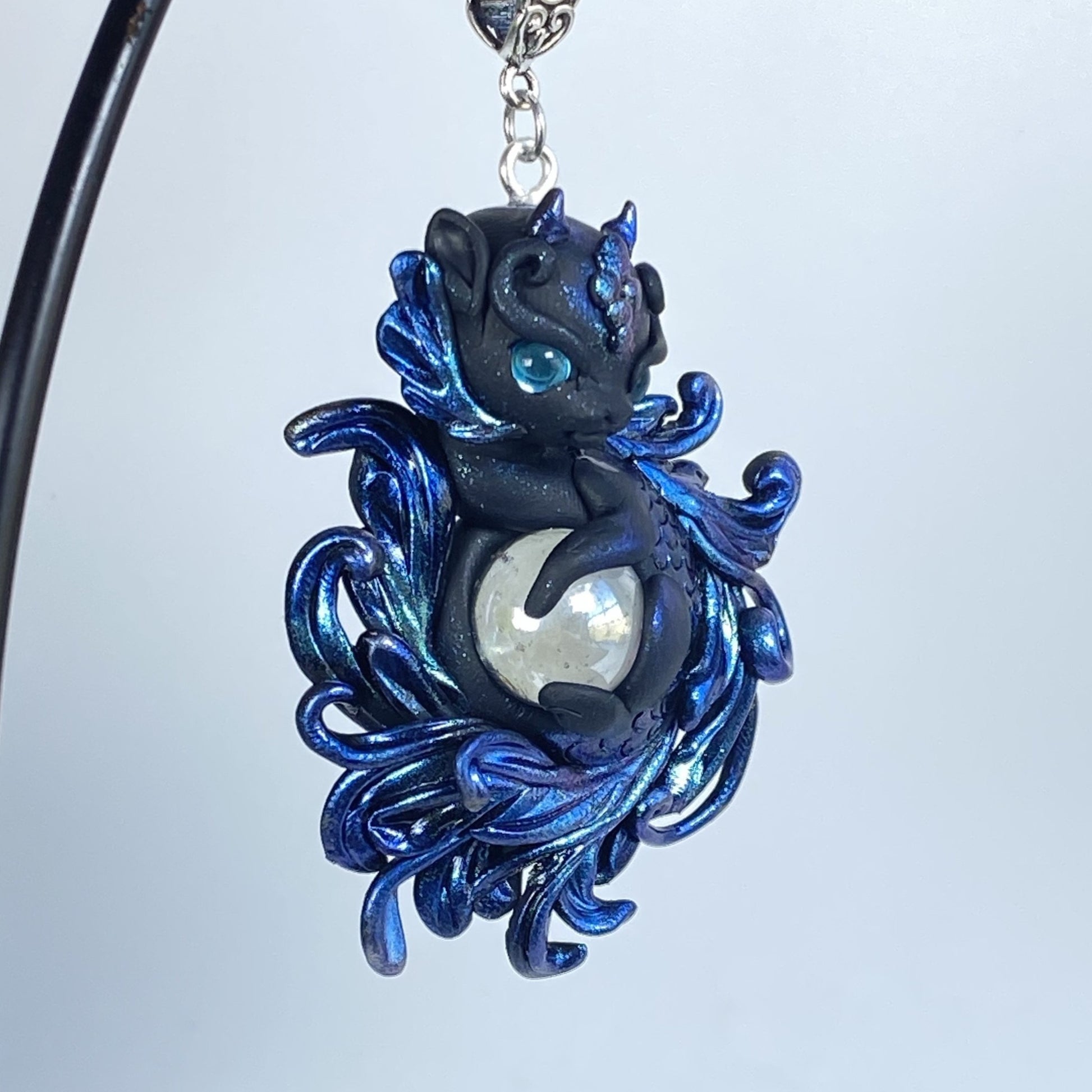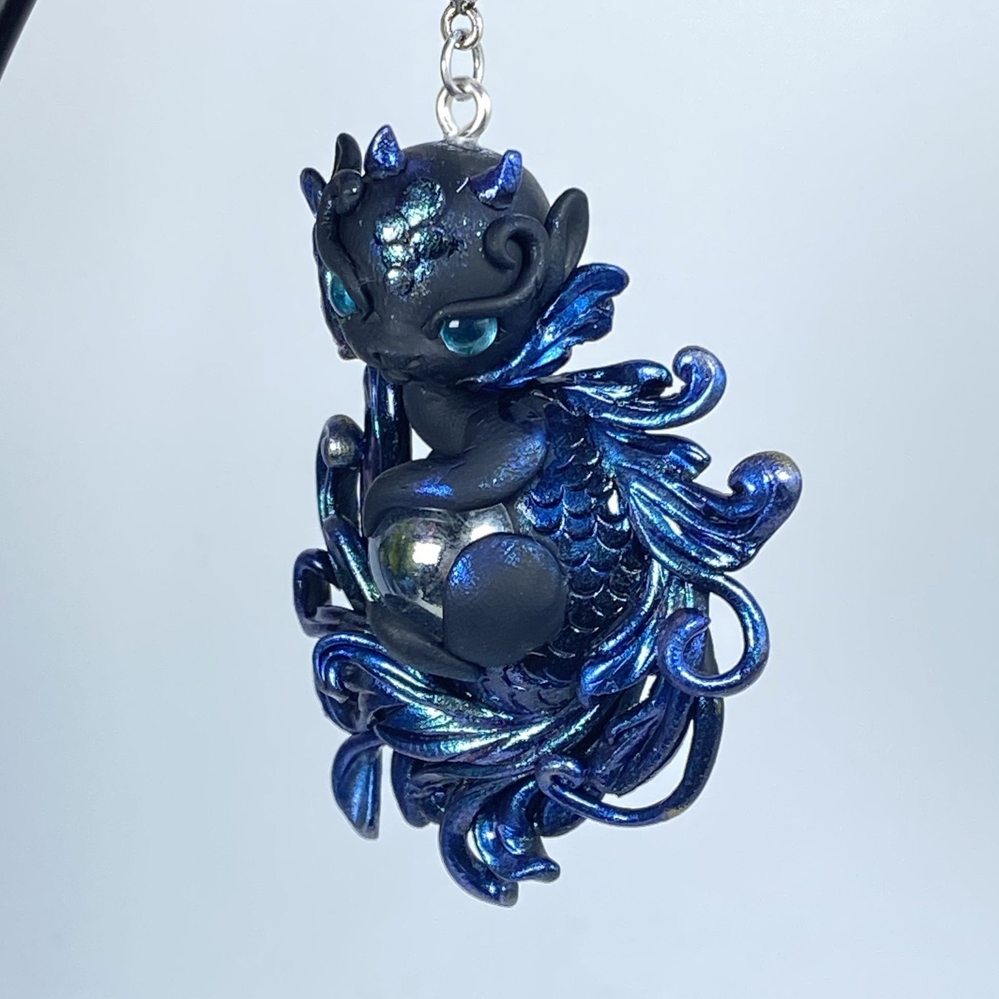 This pretty baby marble guardian has fancy tails and scales done in shimmering shades of blue. He is a little larger than the other baby marble dragons. Materials used include sculpey premo, pearl ex pigments, solar dust powders and blue crystal cabochon eyes.