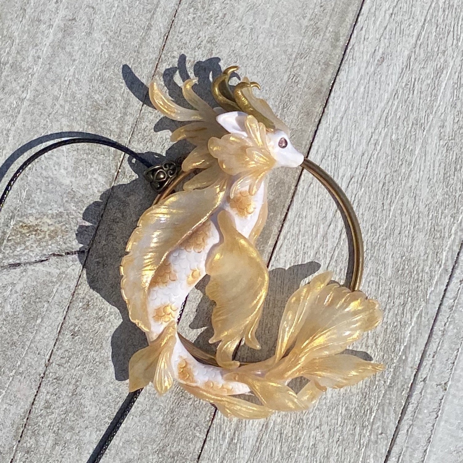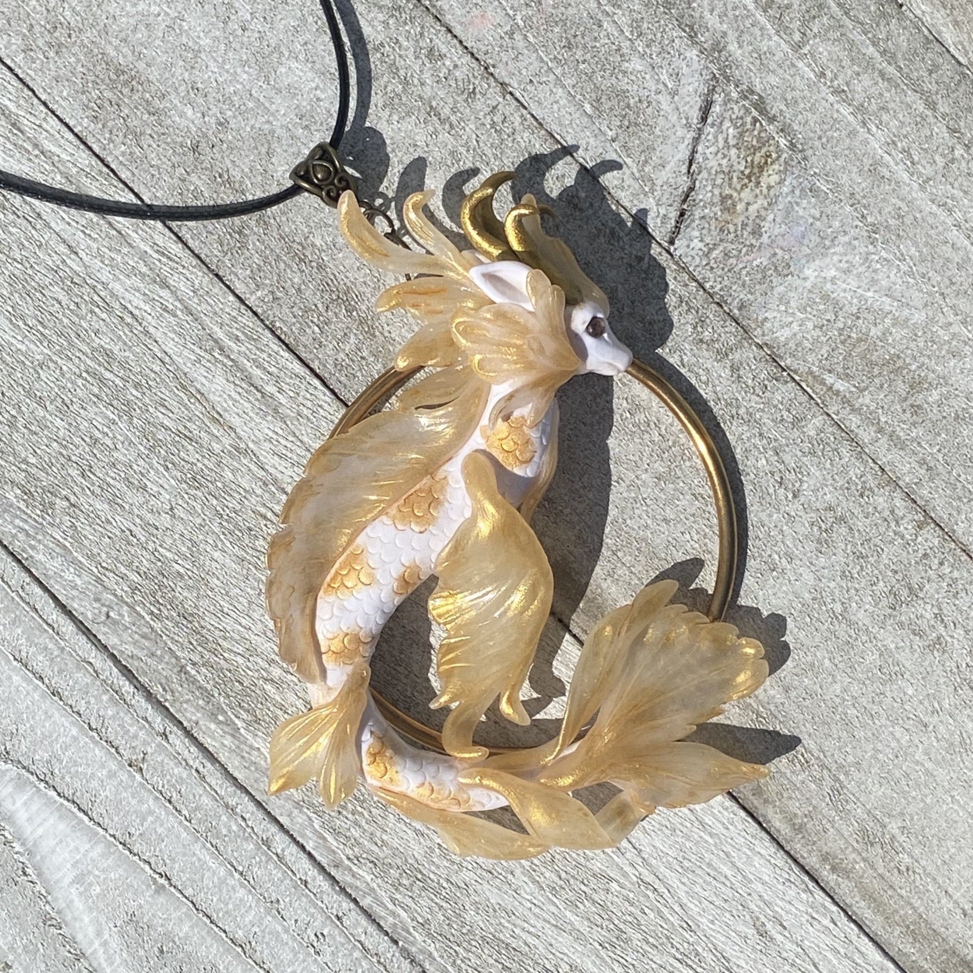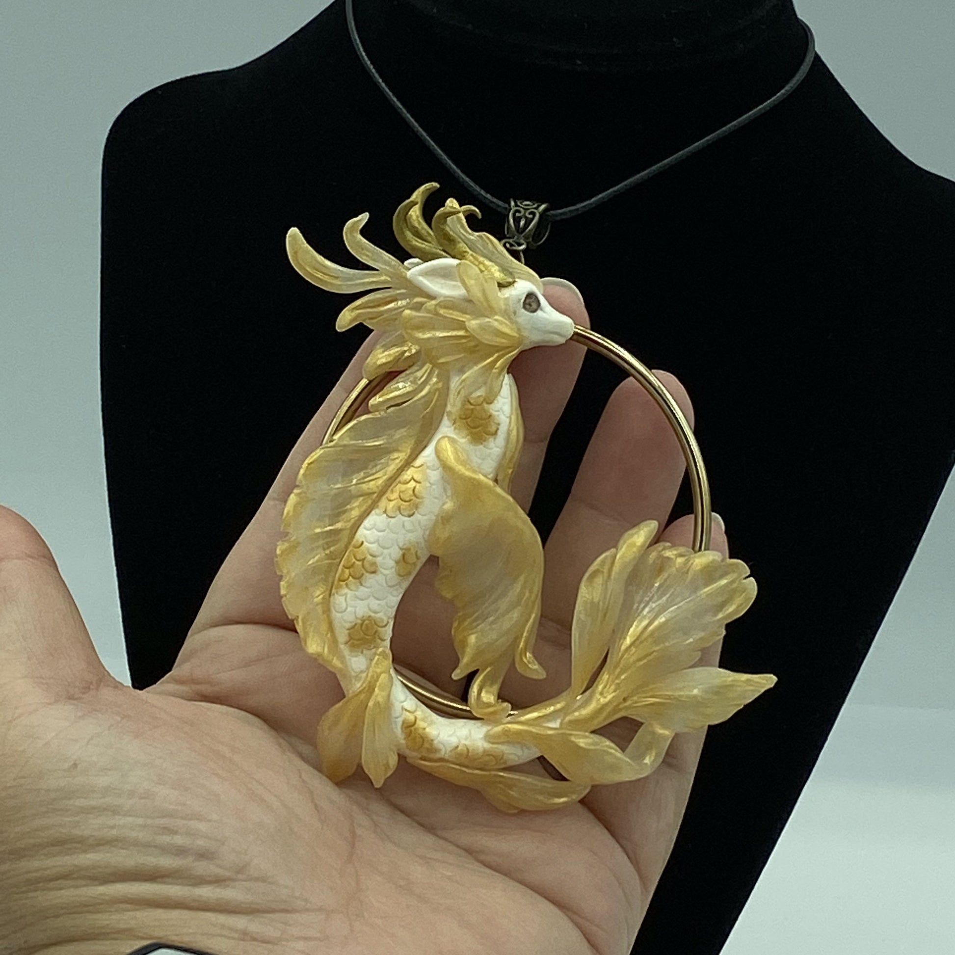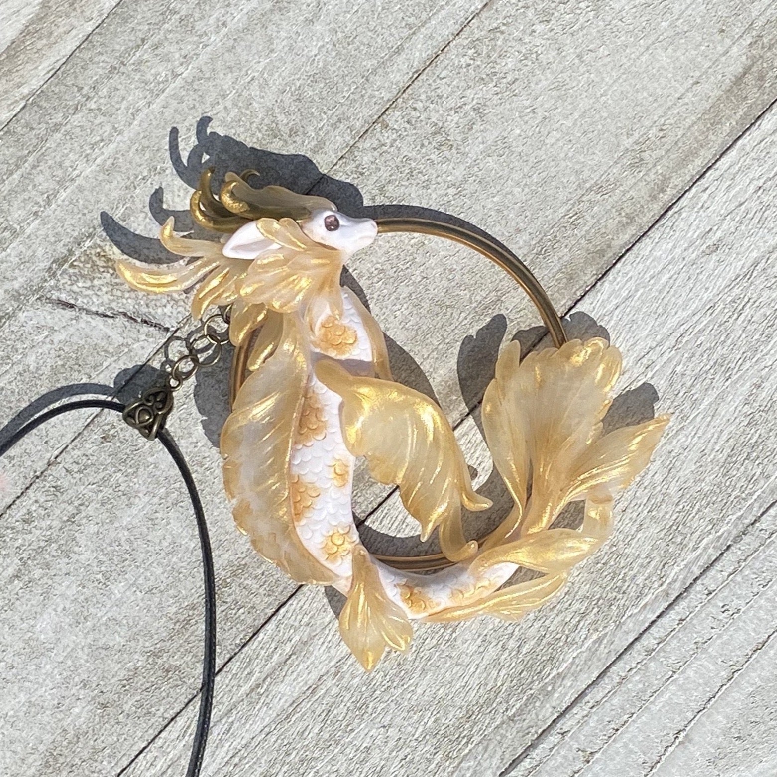 Magical white and gold Koi dragon with glass bead eyes is affixed to a golden ring. Sculpted by hand and made entirely out of Premo Polymer clay. Accented with mica pearl pigment powders. A pendant bail is attached and a leather cord is included.