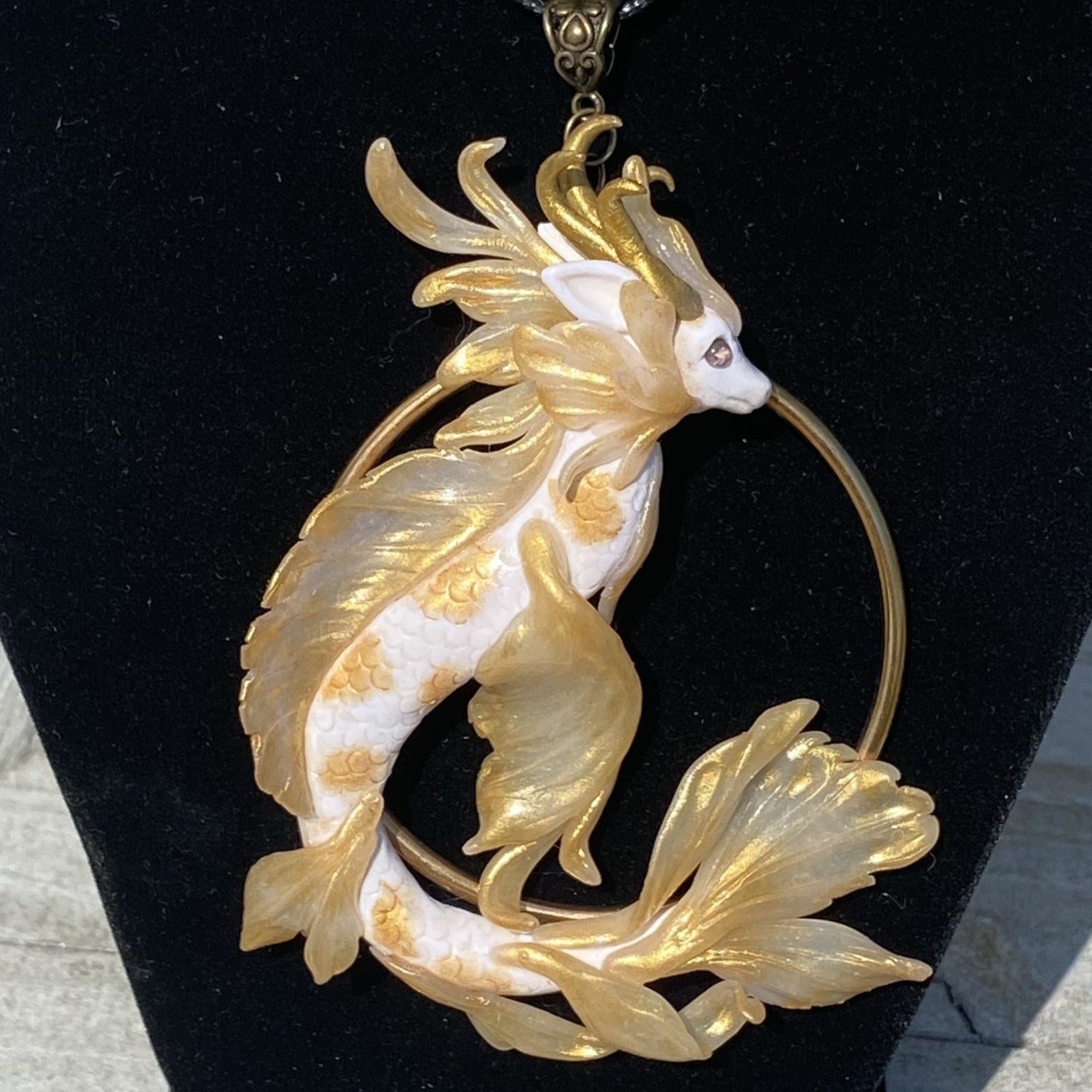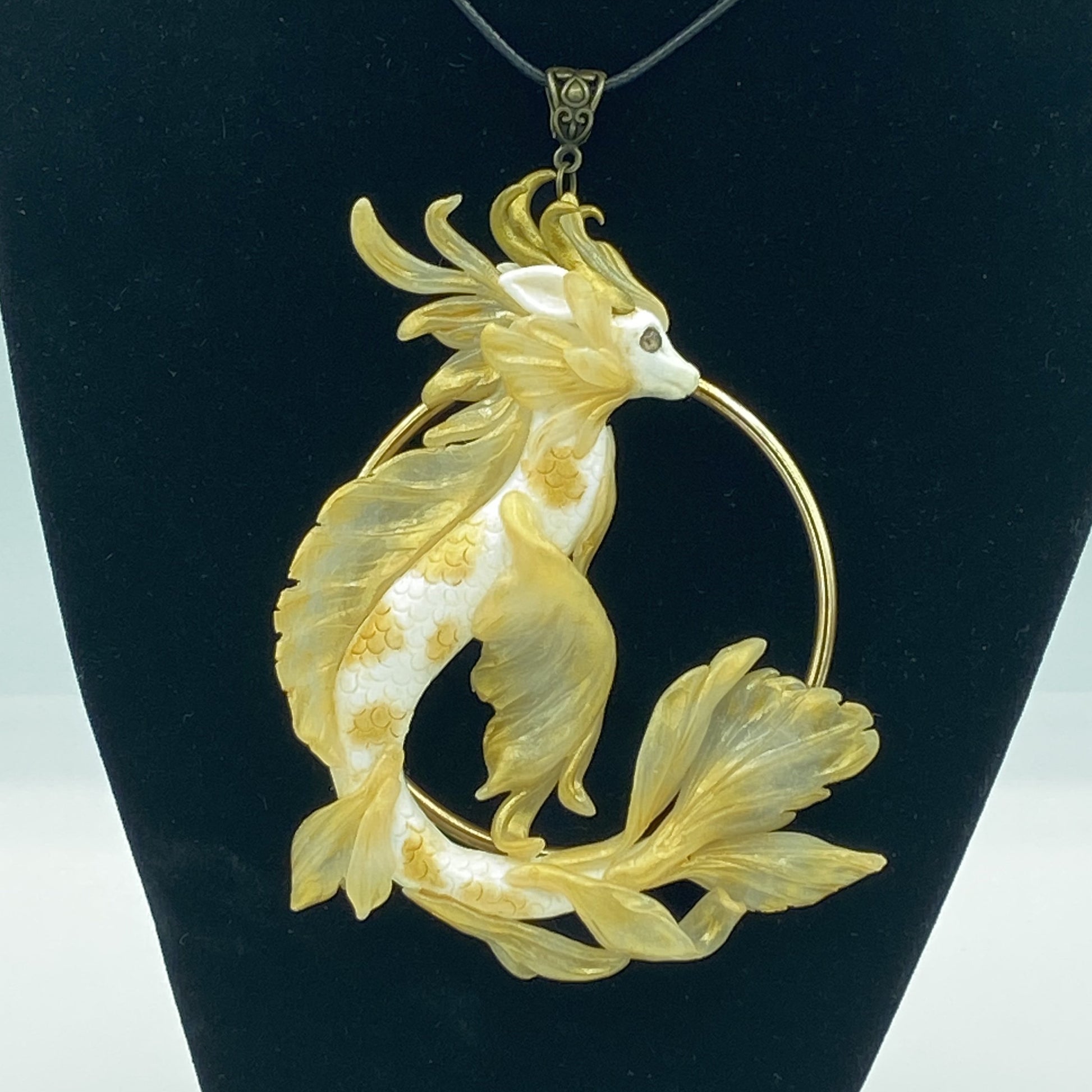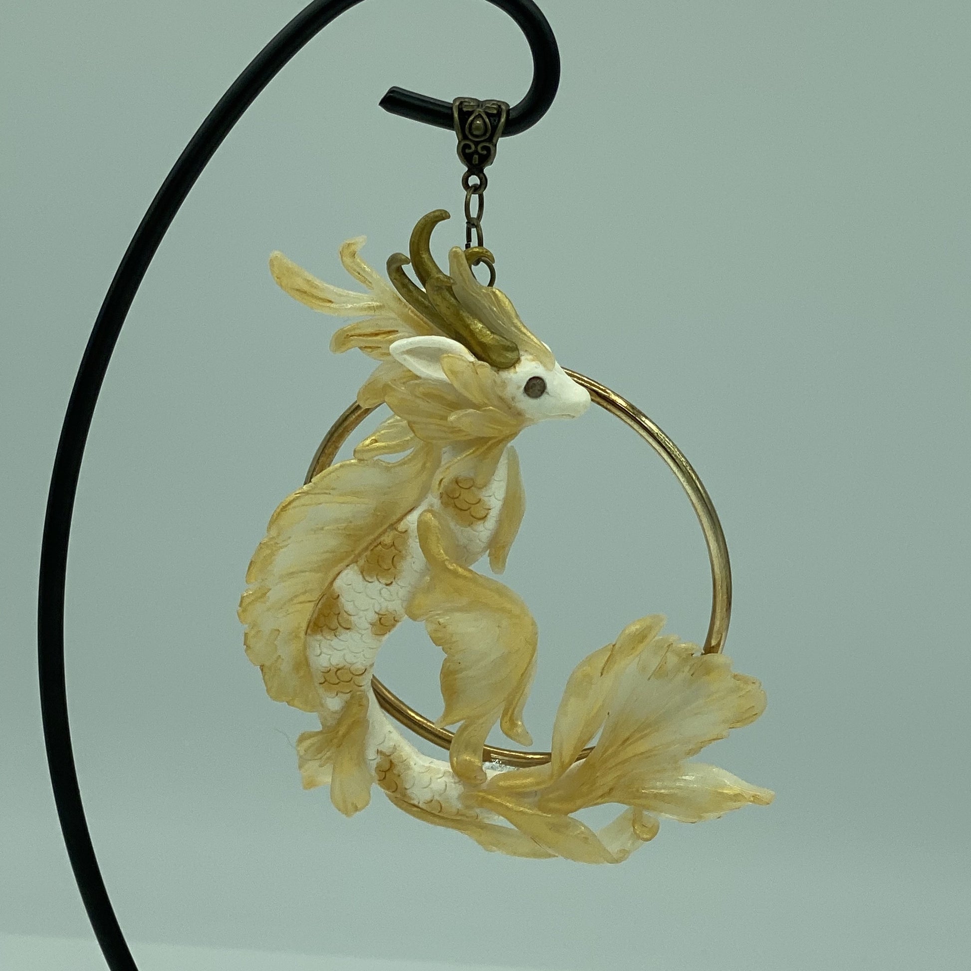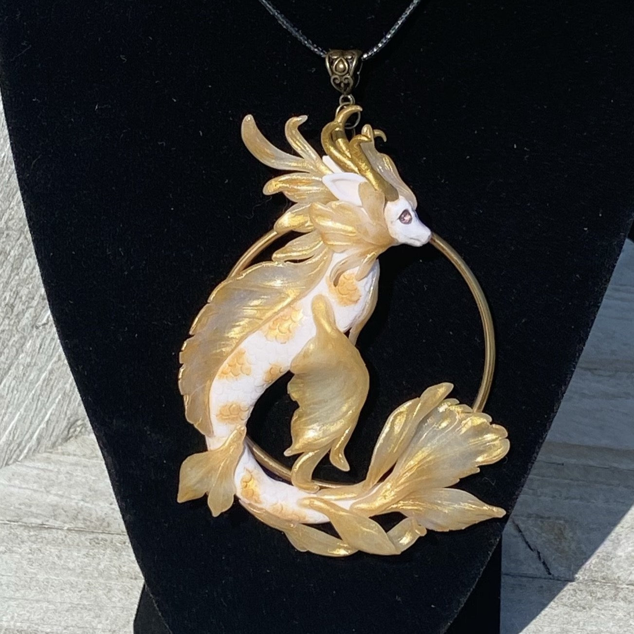 Magical white and gold Koi dragon with glass bead eyes is affixed to a golden ring. Sculpted by hand and made entirely out of Premo Polymer clay. Accented with mica pearl pigment powders. A pendant bail is attached and a leather cord is included.