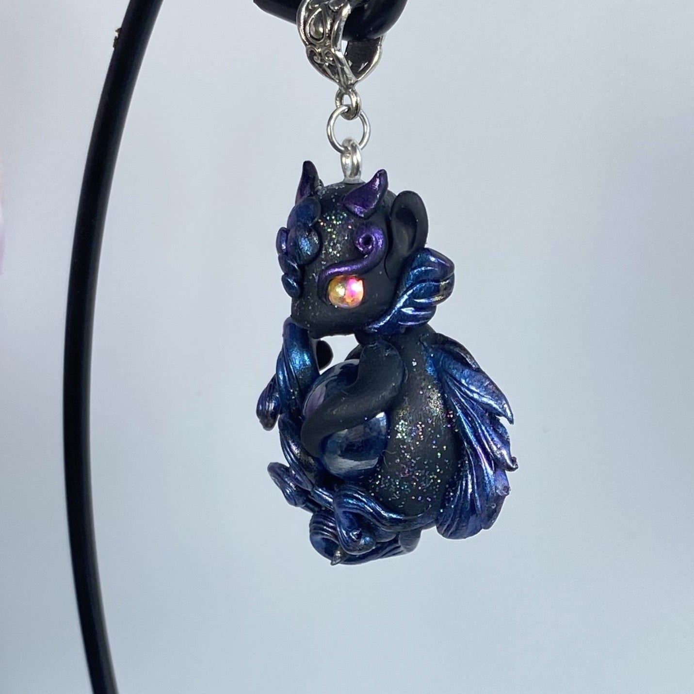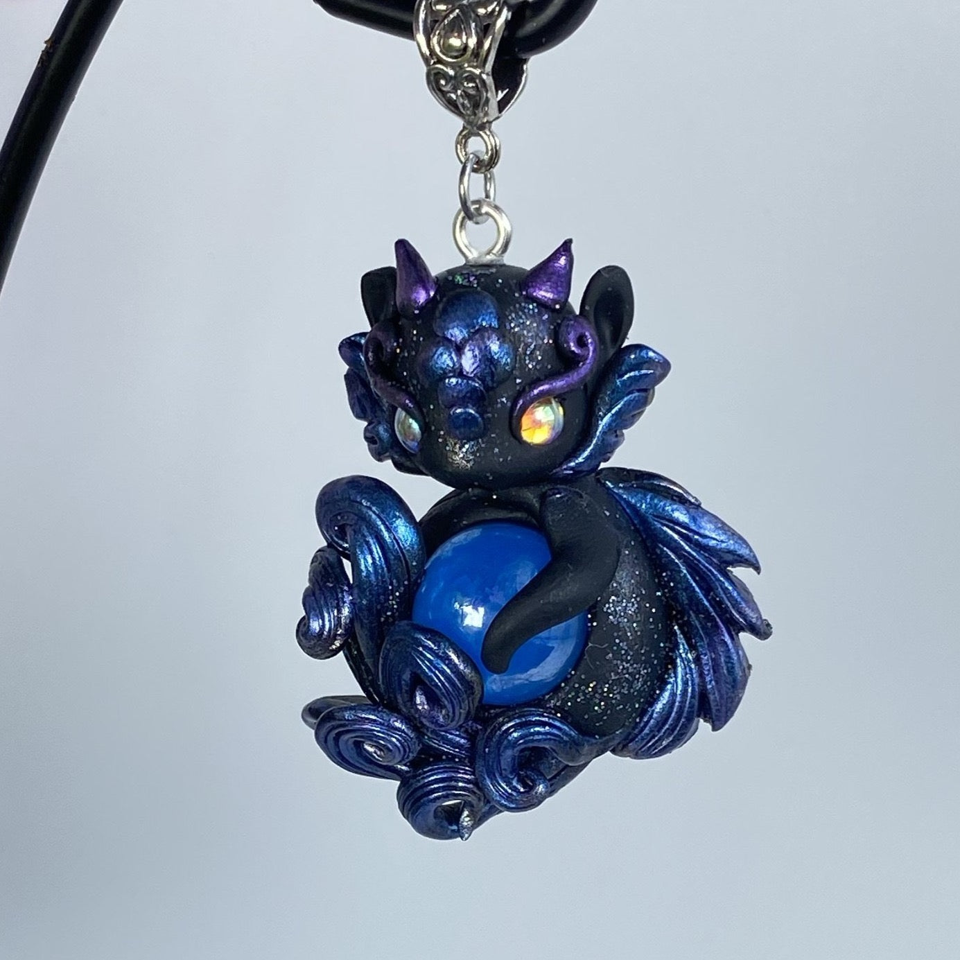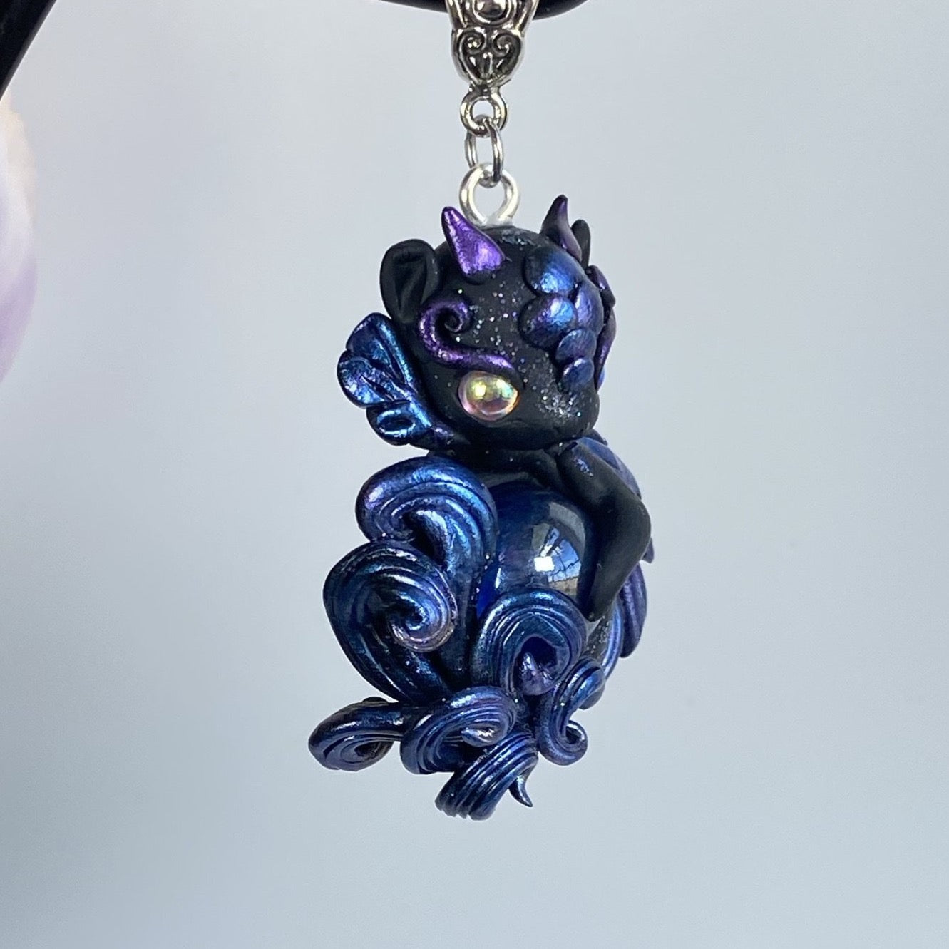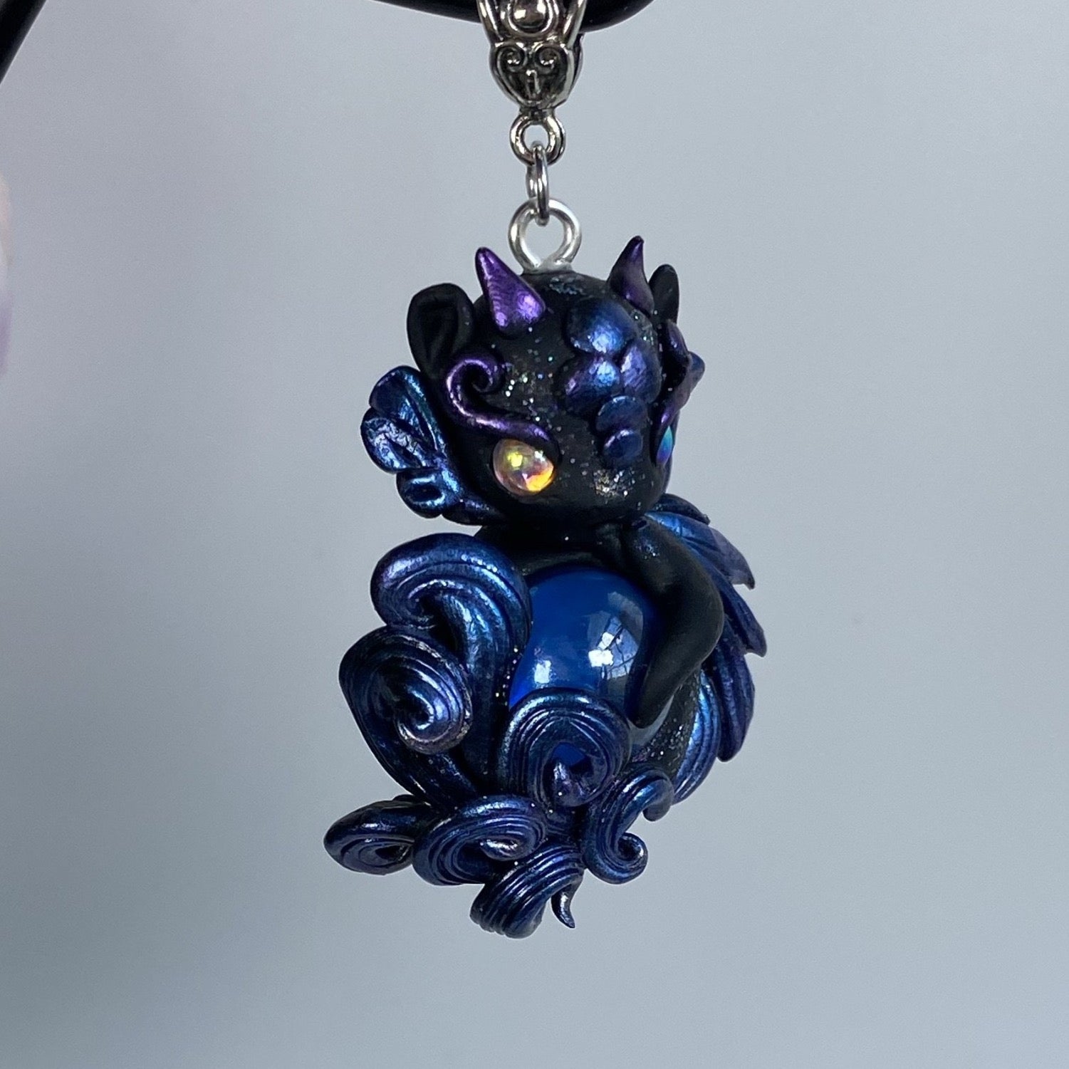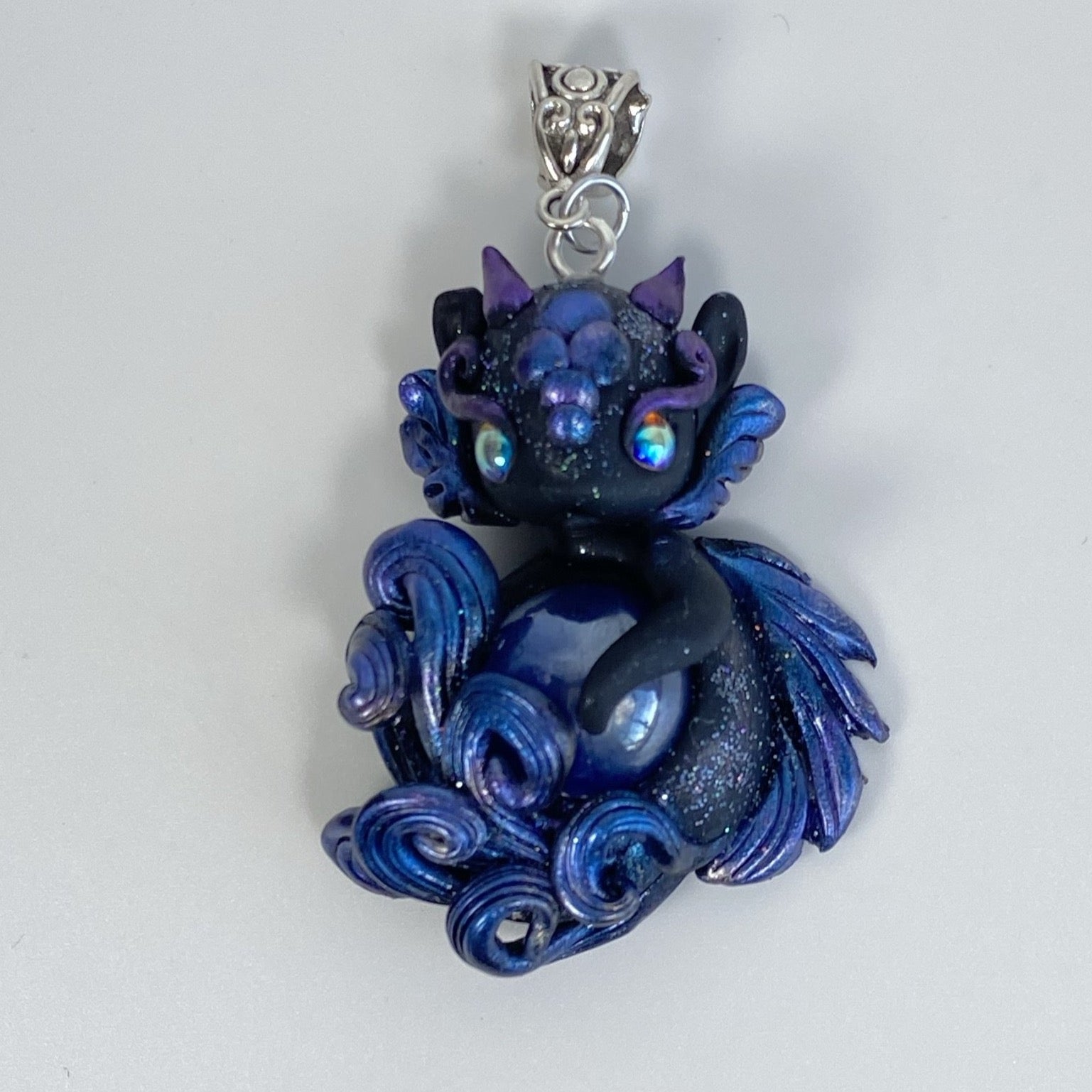 Purple and blue scaled dragon with marble. Materials used include sculpey premo, holographic glitter, chameleon pigments, ab crystal cabochons for eyes and glass marble. Leather necklace included.