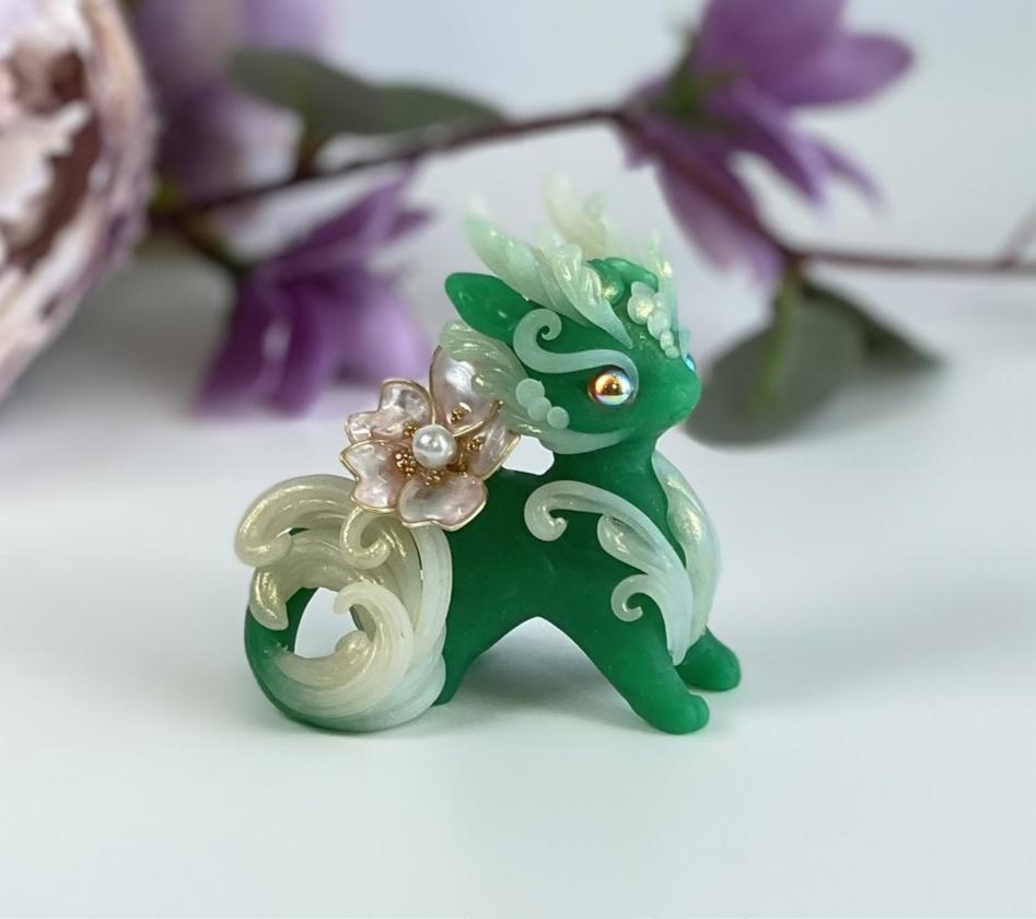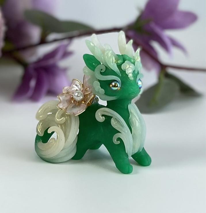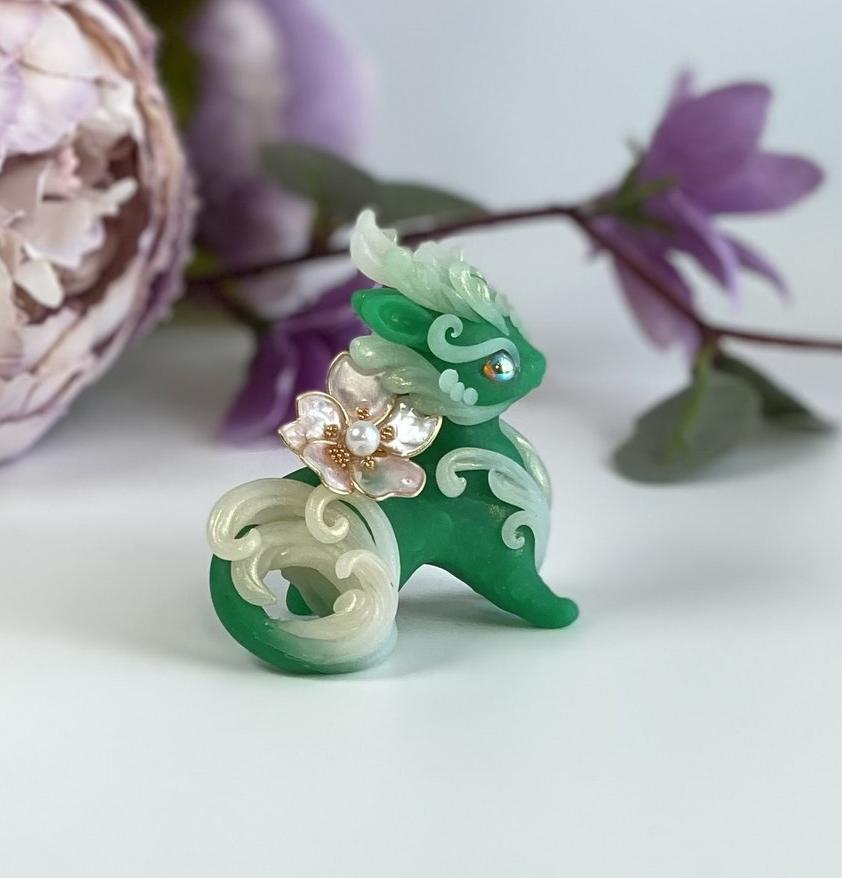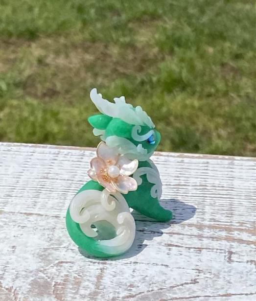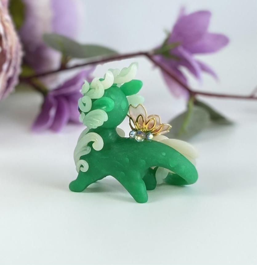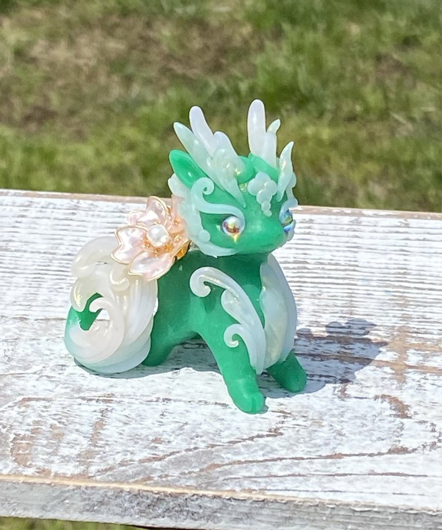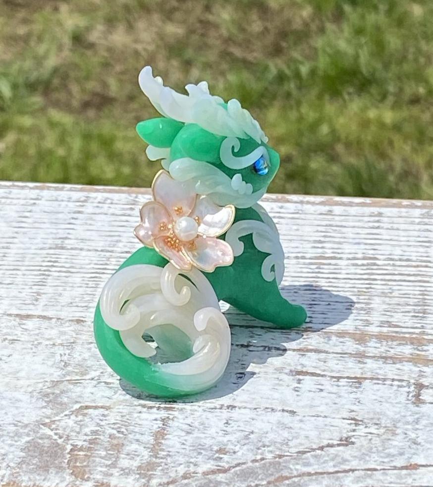 Pretty little spring dragon resembles dark green jade. Made out of fimo clay with mica powders and ab crystal cabochons for eyes. Resin flower resting on his back is also made by hand using wire, resin, paint, gold beads, glass pearl and bubble glass beads underneath to resemble dew.