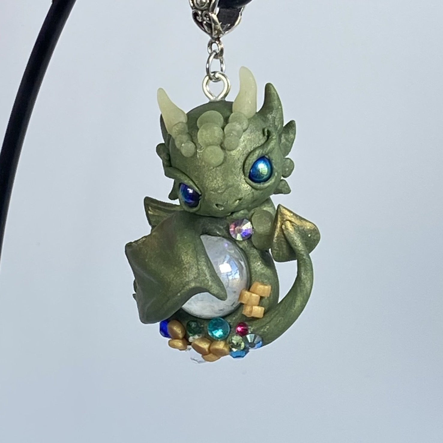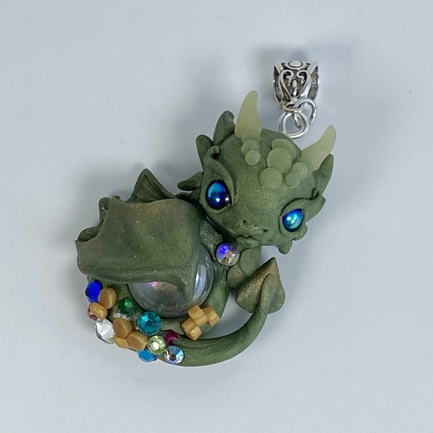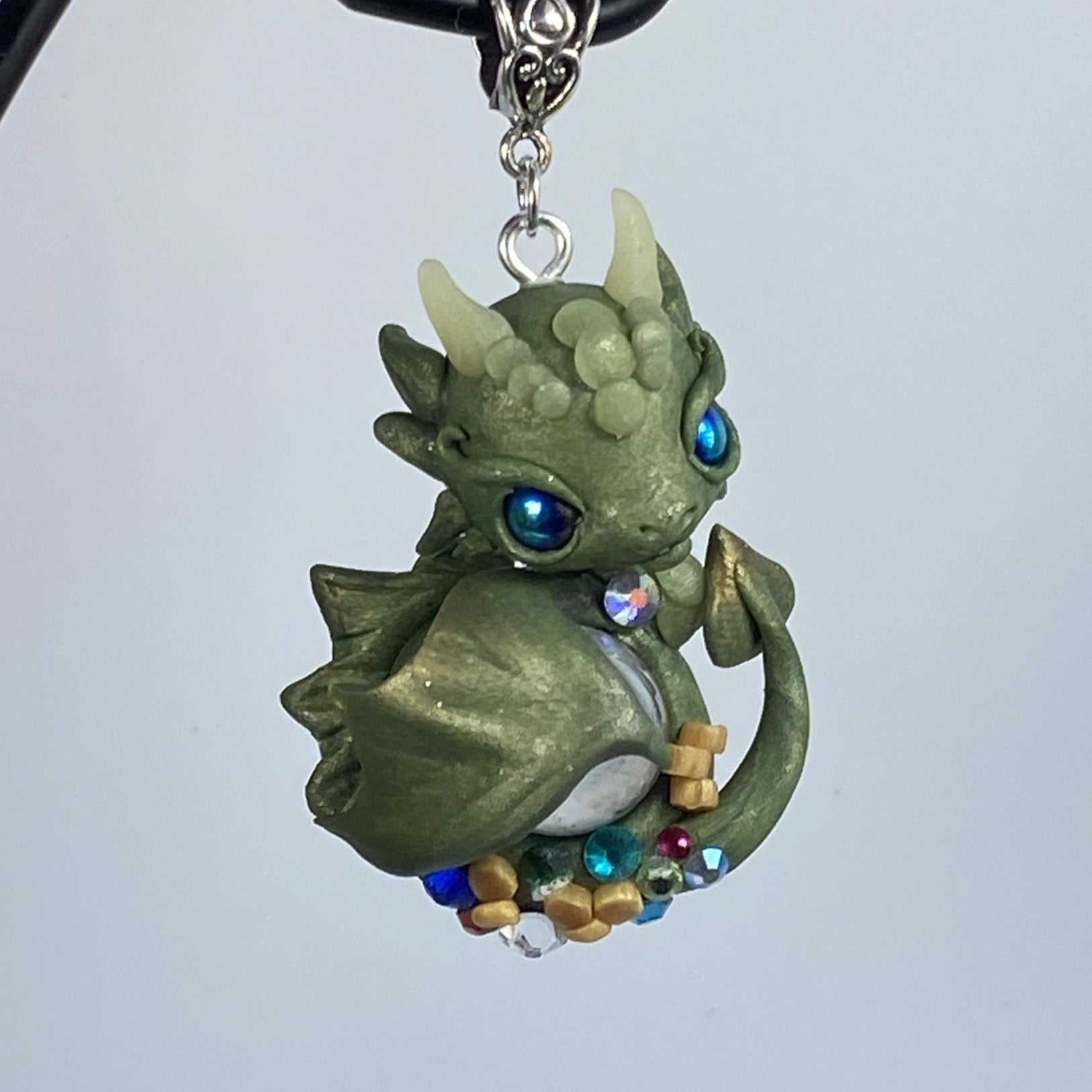This little marble Guardian also sits on her hoard of treasure. Materials used include sculpey premo clay, pearl ex pigments, genuine Swarovski crystals, rhinestones, ab crystal cabochons for eyes. Leather necklace included.