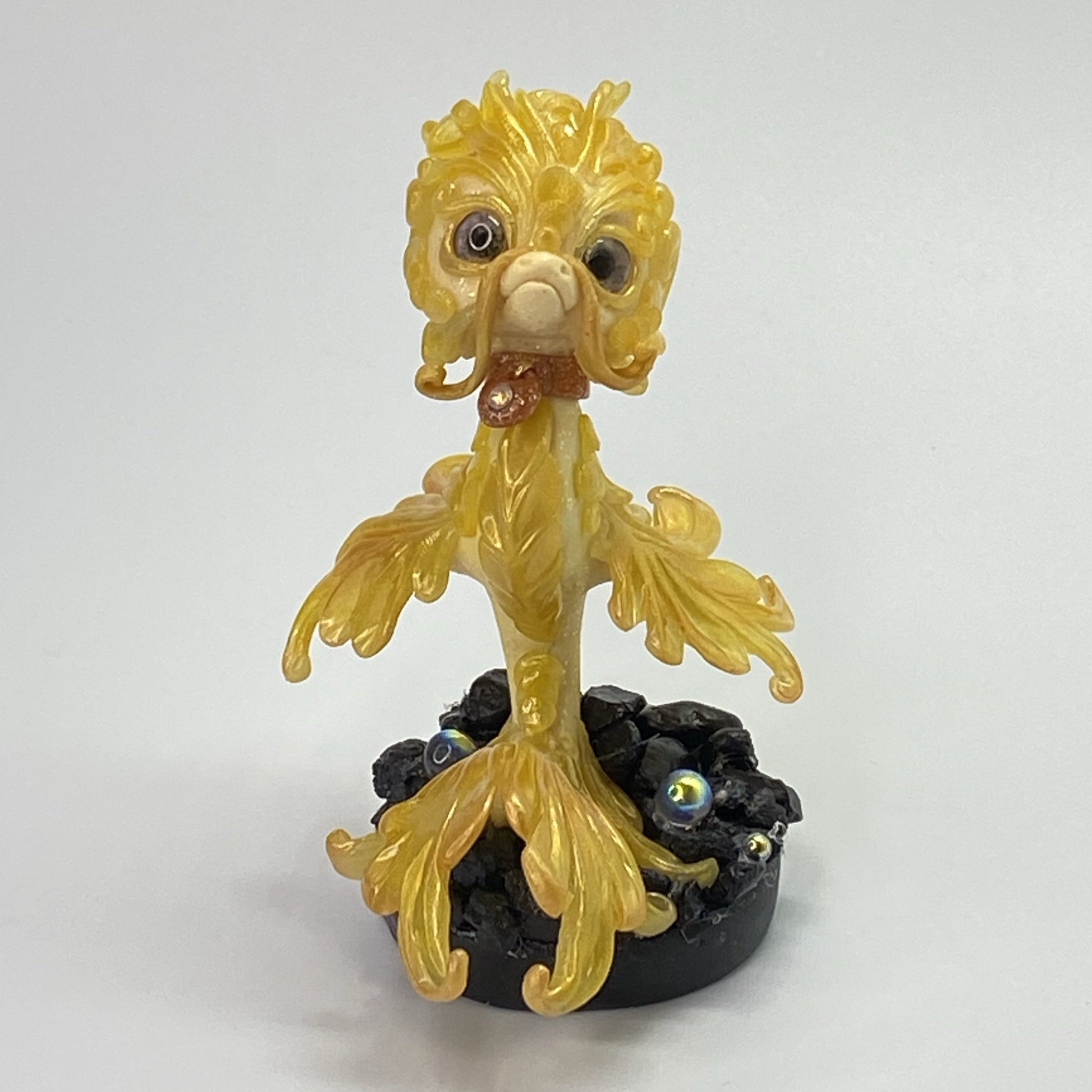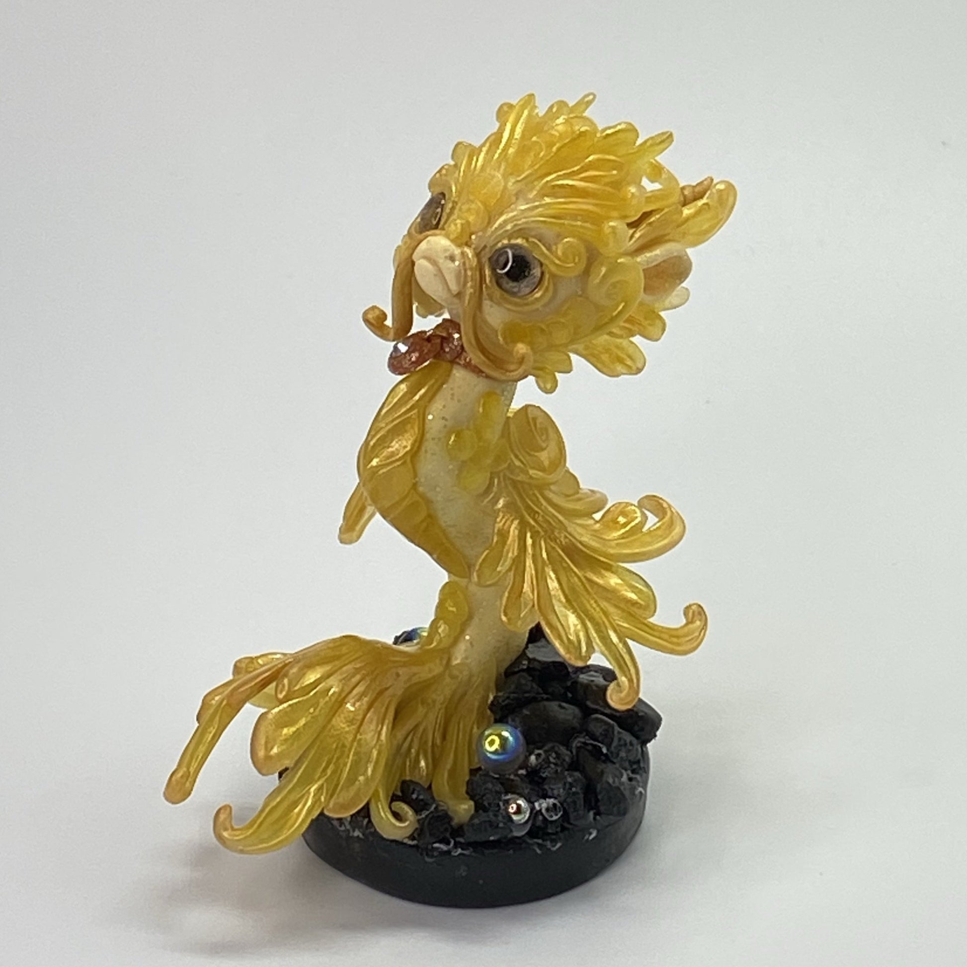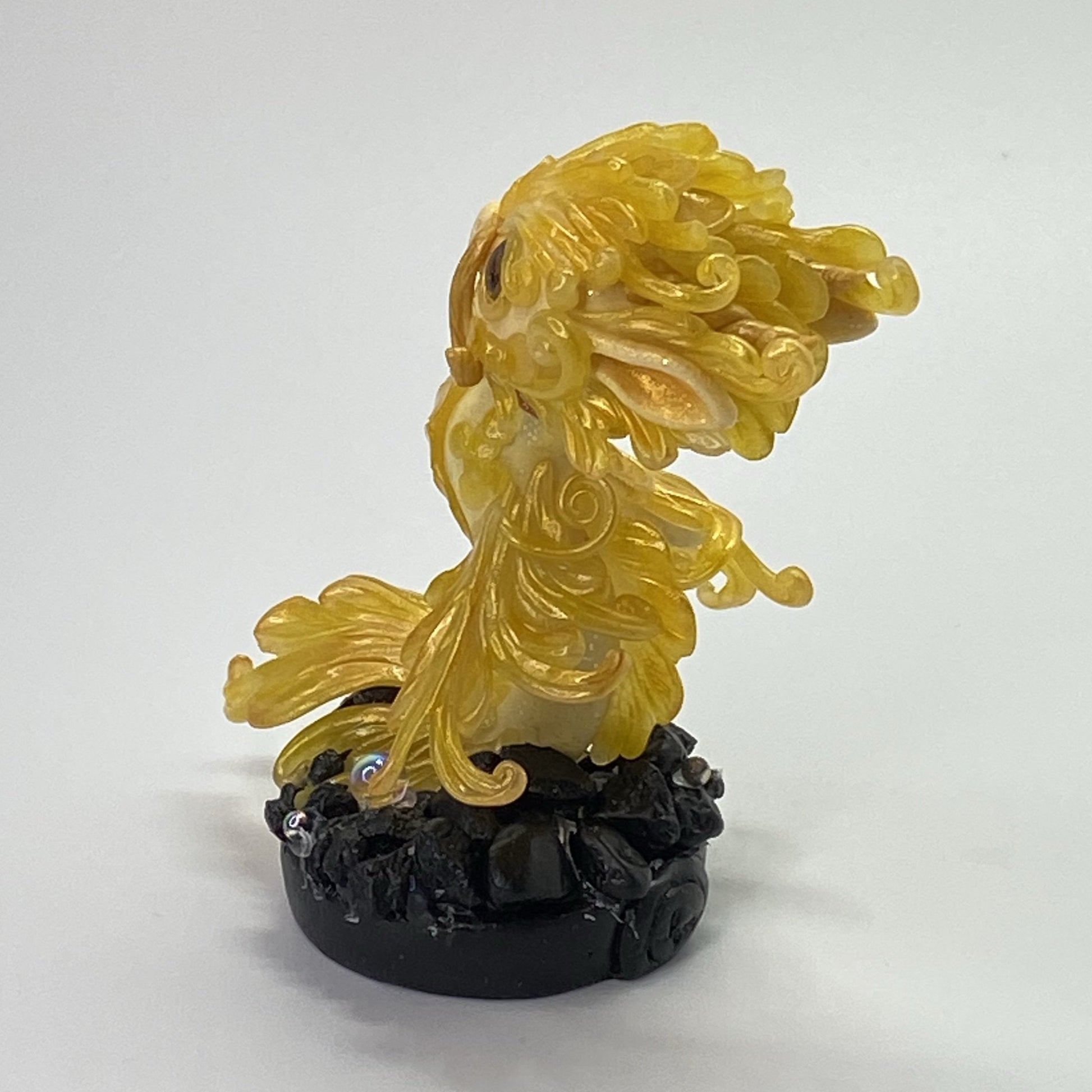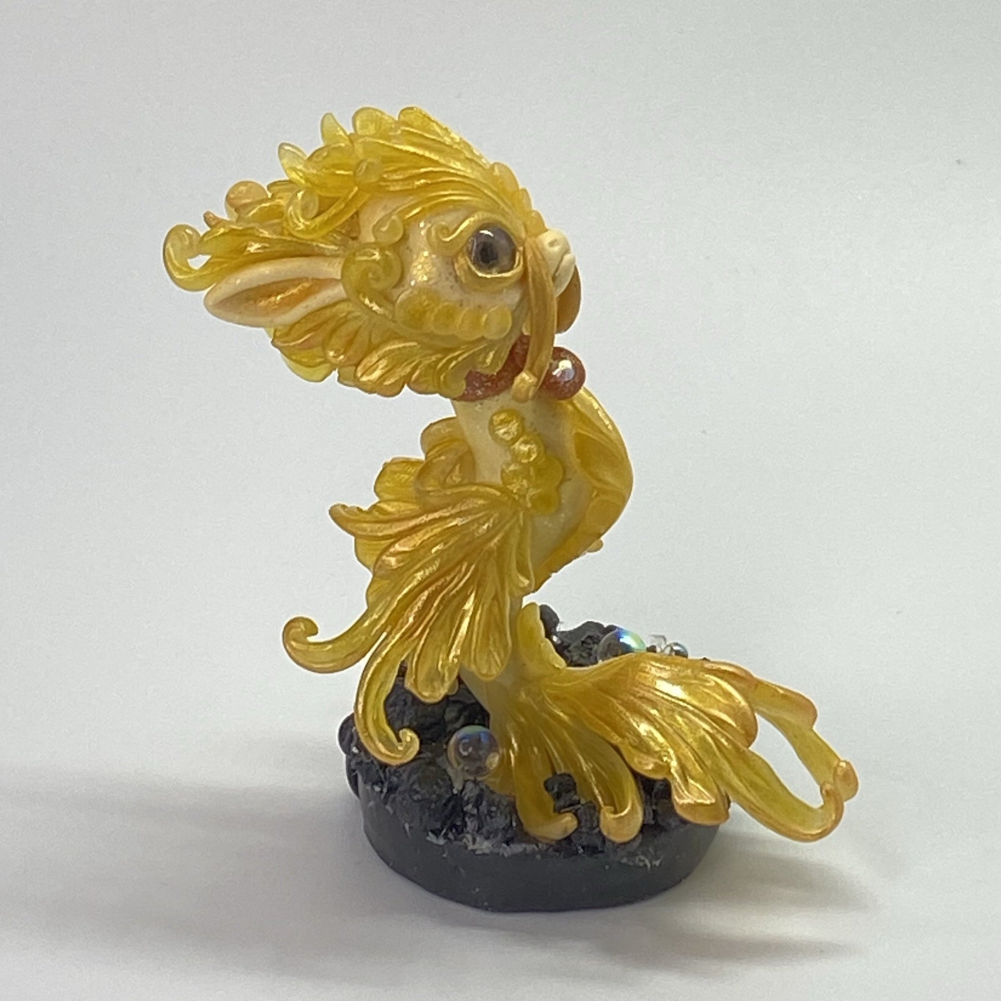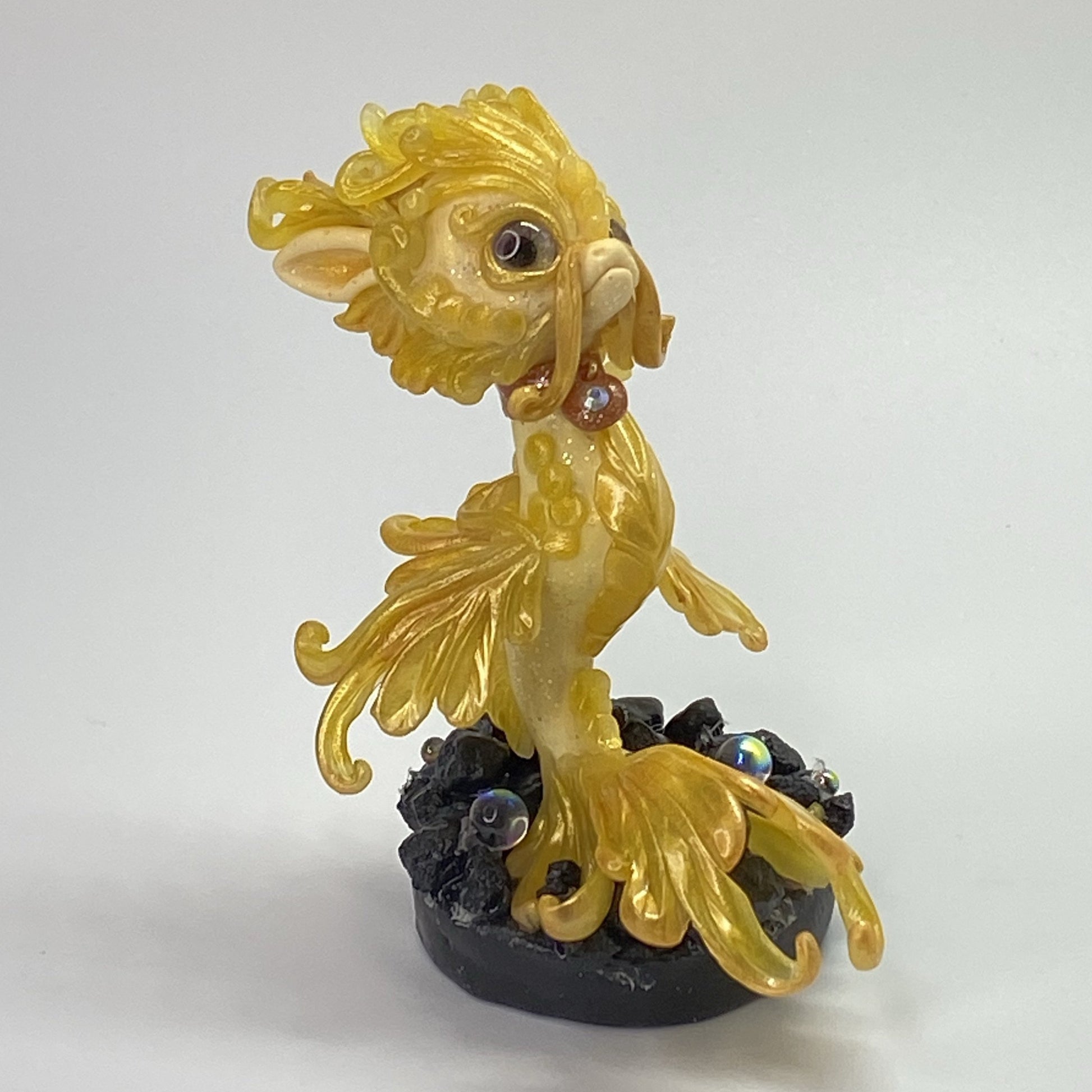 Who knew grumpy could look so cute? This grumpy Goldfish Dragon sits perched atop black rocks, daring anyone to get closer! His little color features a genuine swarovski crystal pendant. Made out of Sculpey Polymer Clay and accented with pearl ex mica powders.