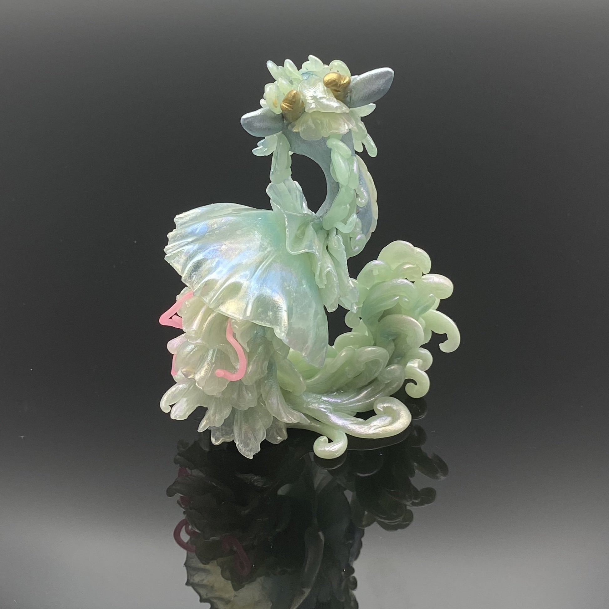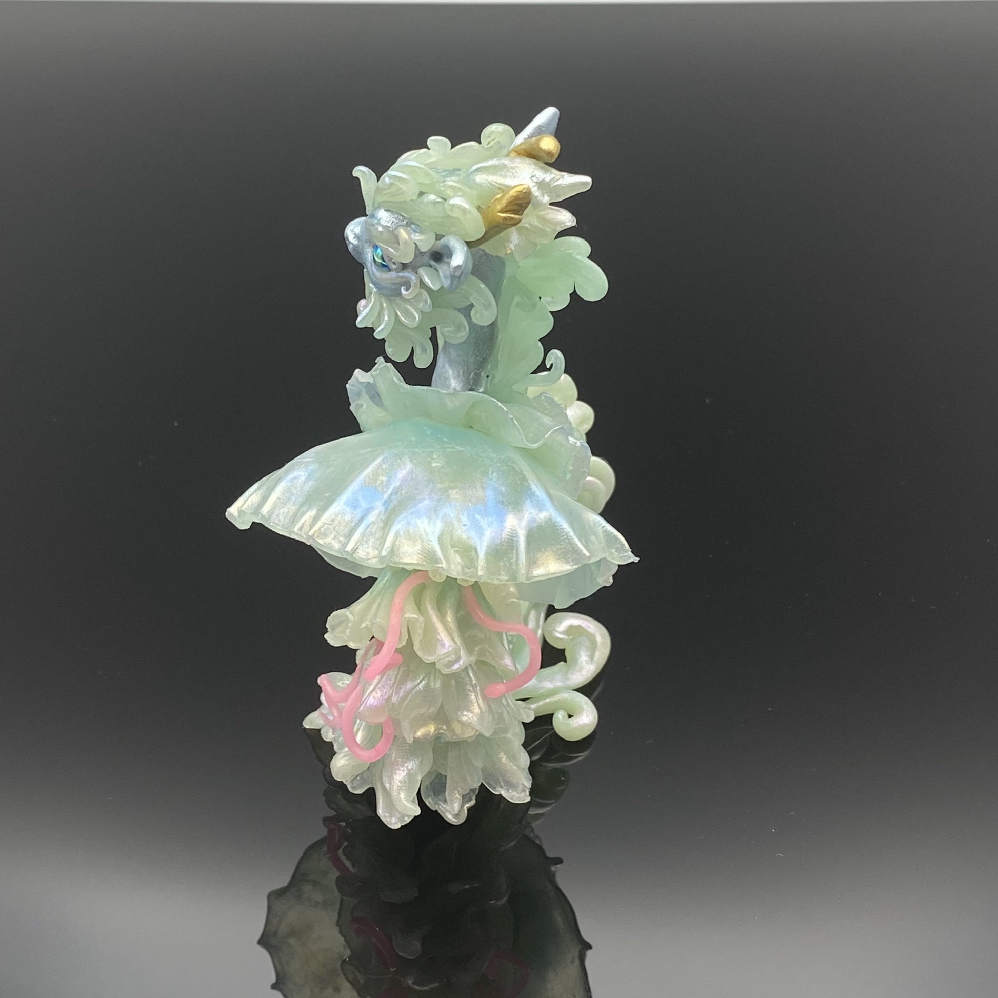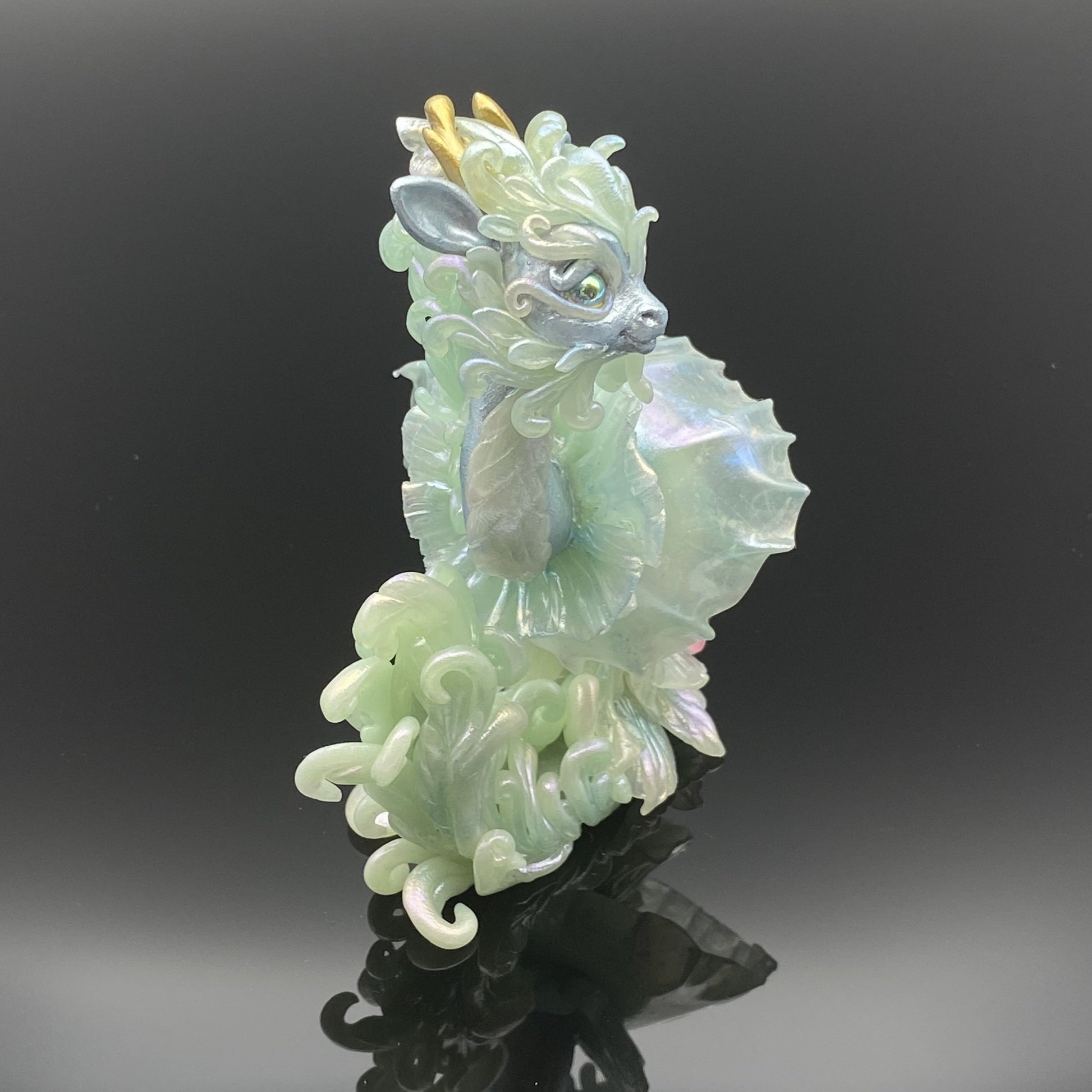 Silver blue jellyfish dragon hybrid! Her translucent tentacles, skirt and fins resemble ocean glass in hues of sky blue and pearly pink. She has AB Czech glass cabochon for eyes that appear to change color when moved. One of a kind creation sculpted in two types of polymer clay, Cosclay and Sculpey Premo. Accented with pearlescent powders.