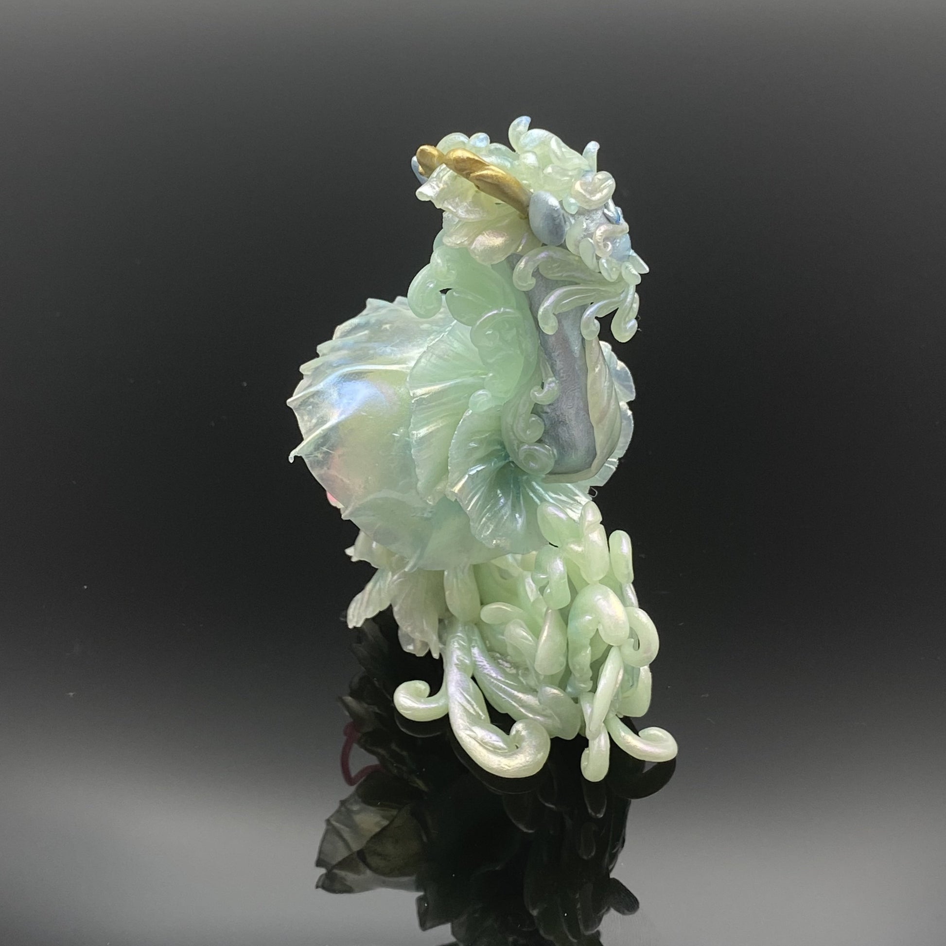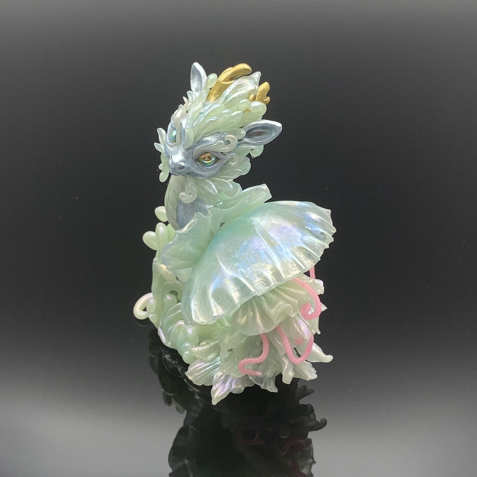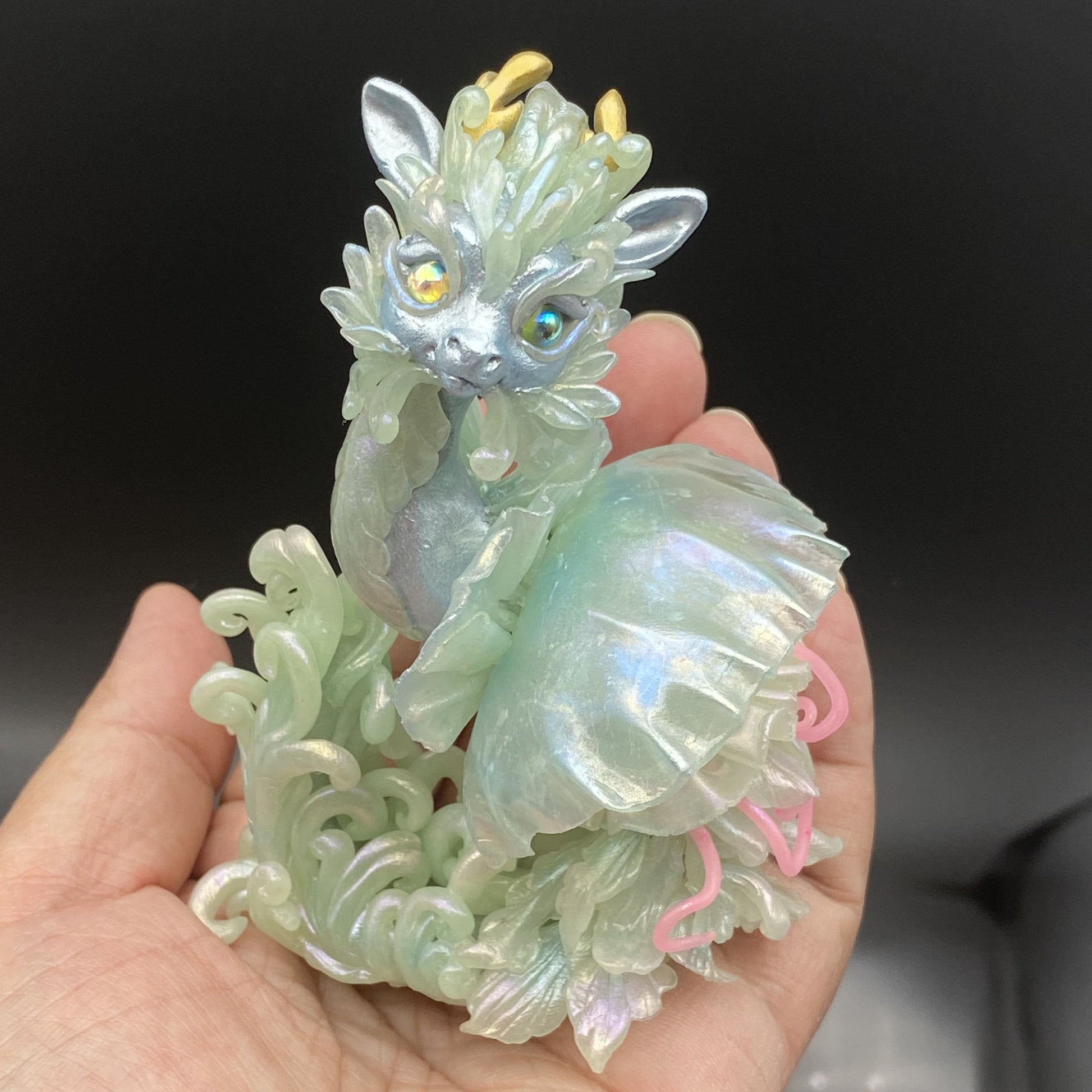 Silver blue jellyfish dragon hybrid! Her translucent tentacles, skirt and fins resemble ocean glass in hues of sky blue and pearly pink. She has AB Czech glass cabochon for eyes that appear to change color when moved. One of a kind creation sculpted in two types of polymer clay, Cosclay and Sculpey Premo. Accented with pearlescent powders.