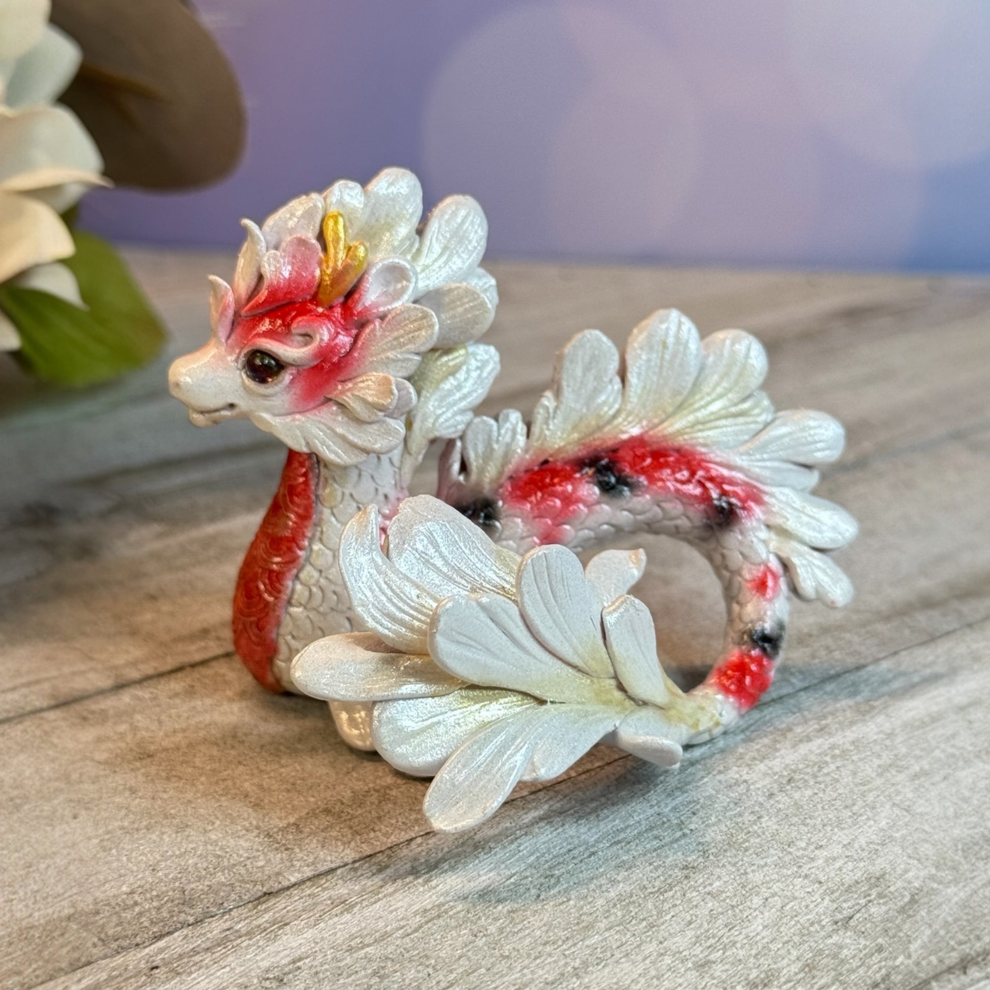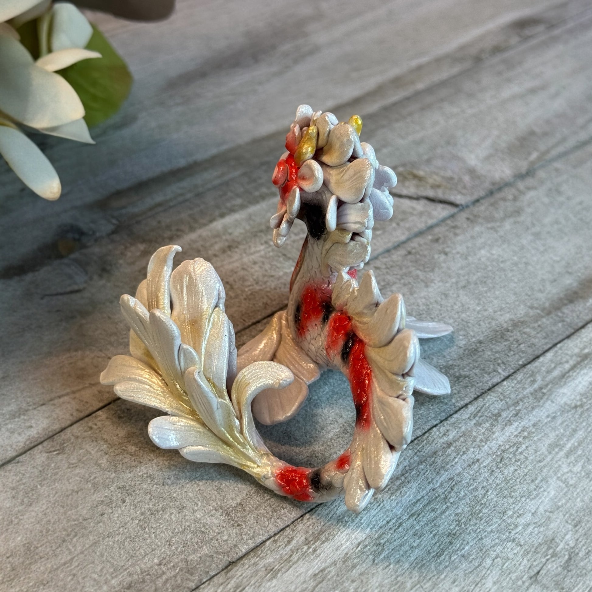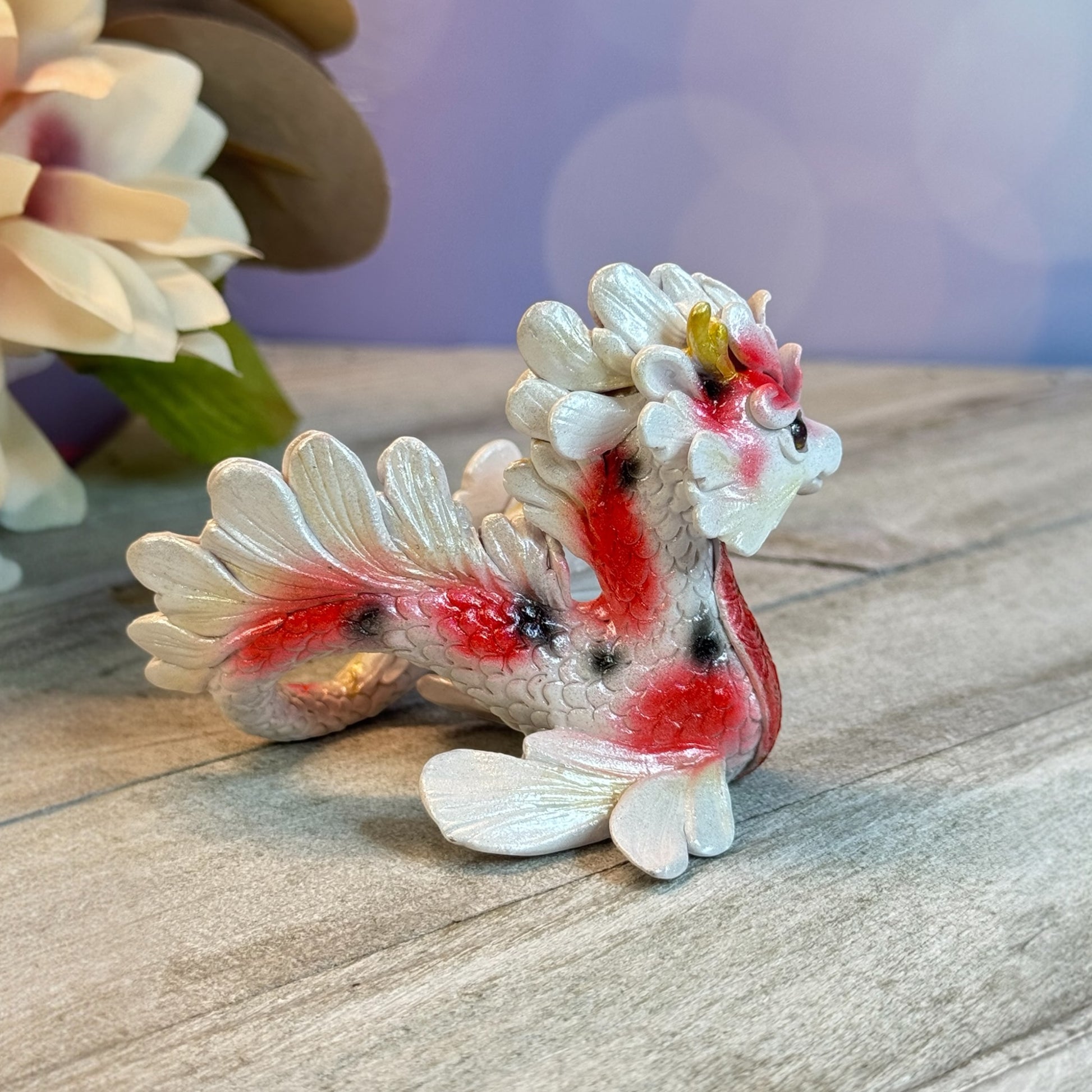 Introducing the Koi Kelpie Dragon, a unique and whimsical creation made with preciosa czech ab crystal, cosclay polymer clay, and acrylic paint. Its white body with red and black spots and golden horns make it a standout piece. Add a touch of playfulness to your collection with this one-of-a-kind dragon!