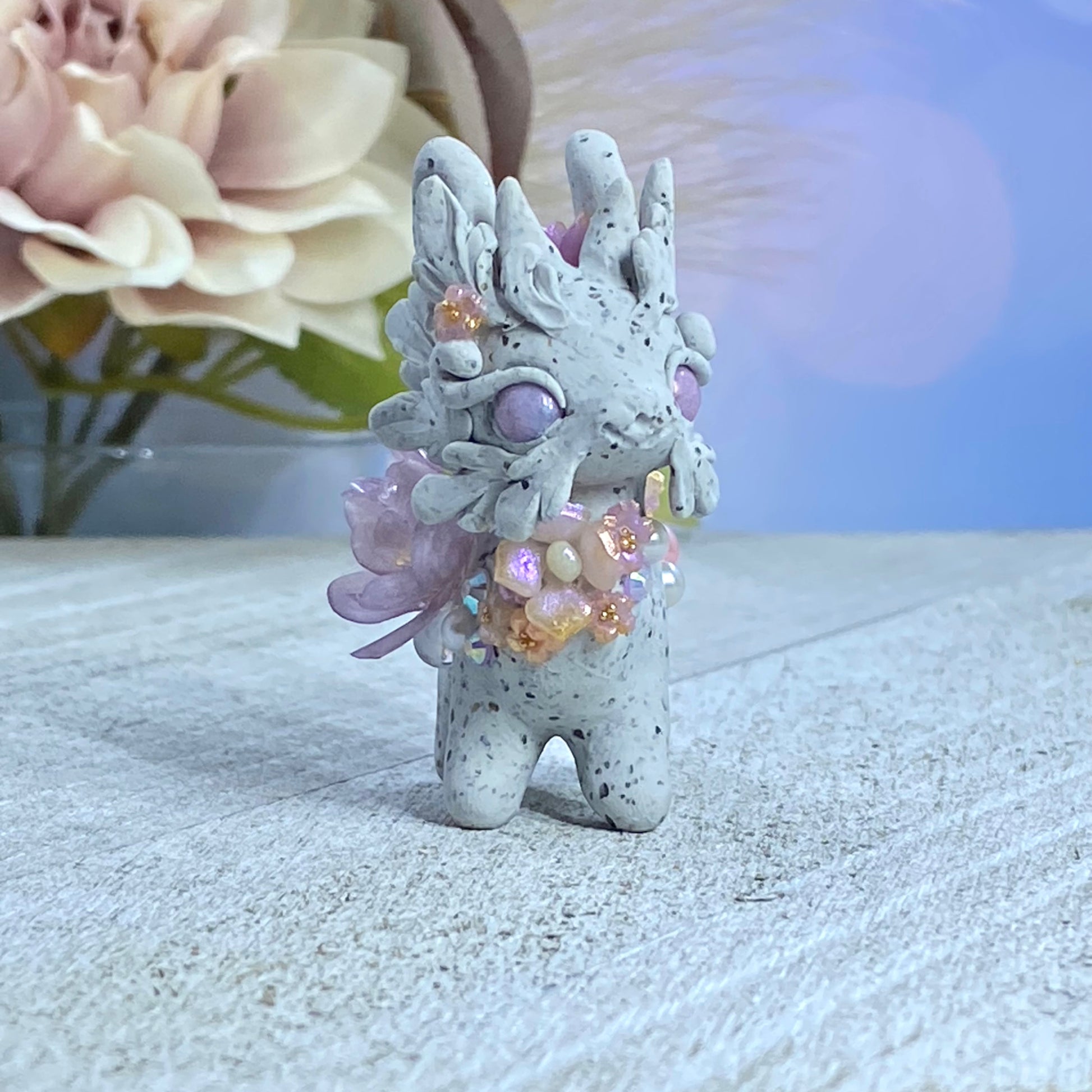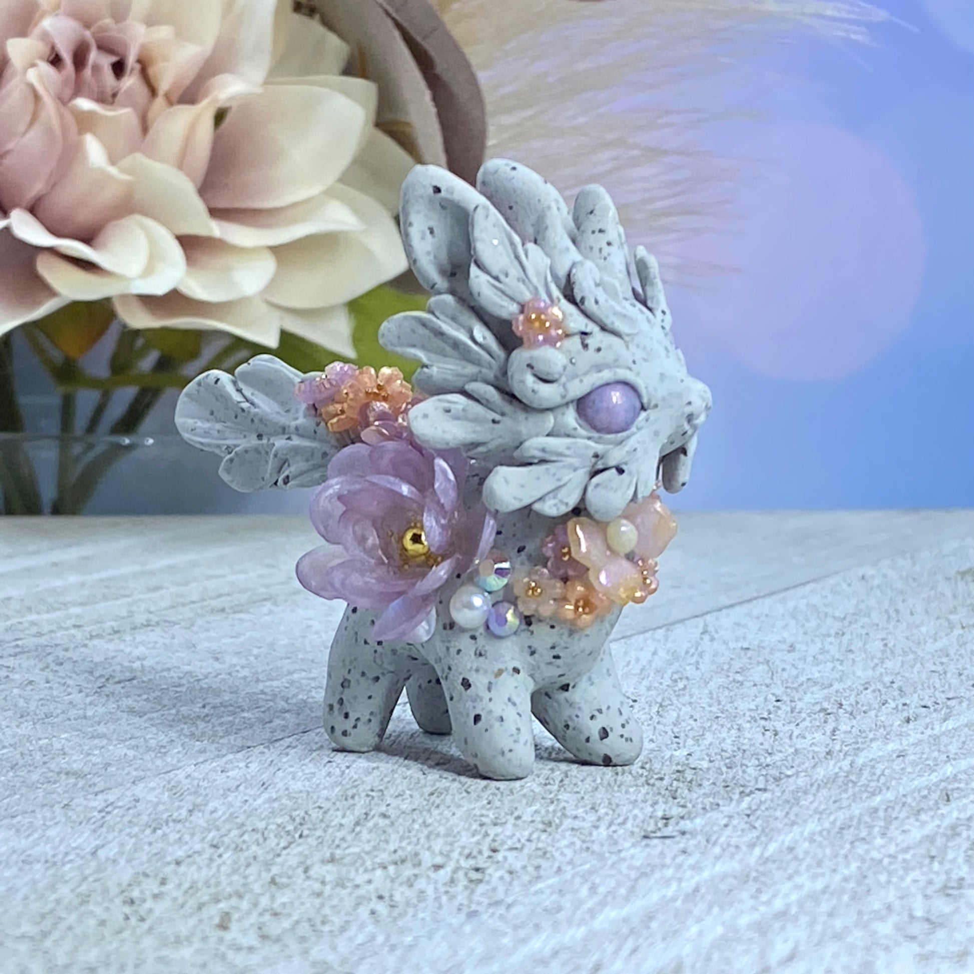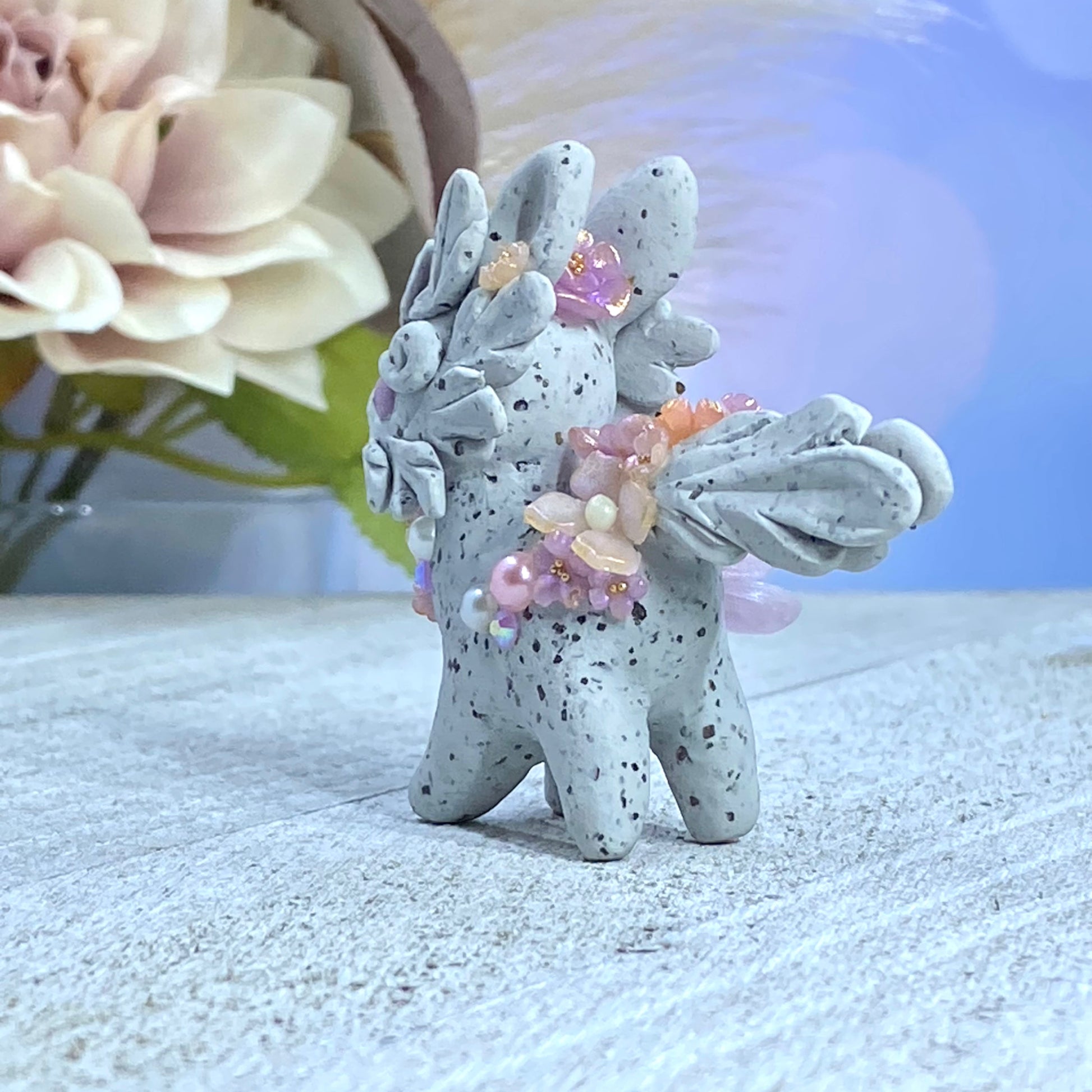 This Lavender and Pink Stone Bunnigon is an elegant and exquisite piece of art. Crafted with polymer clay, pearl pigment powders and resin, it is adorned with flowers, succulents, Swarovski crystals and gold seed beads. For an extra touch of beauty, it includes a delicate resin flower sculpted petal by petal using UV resin located on the left side of its body.