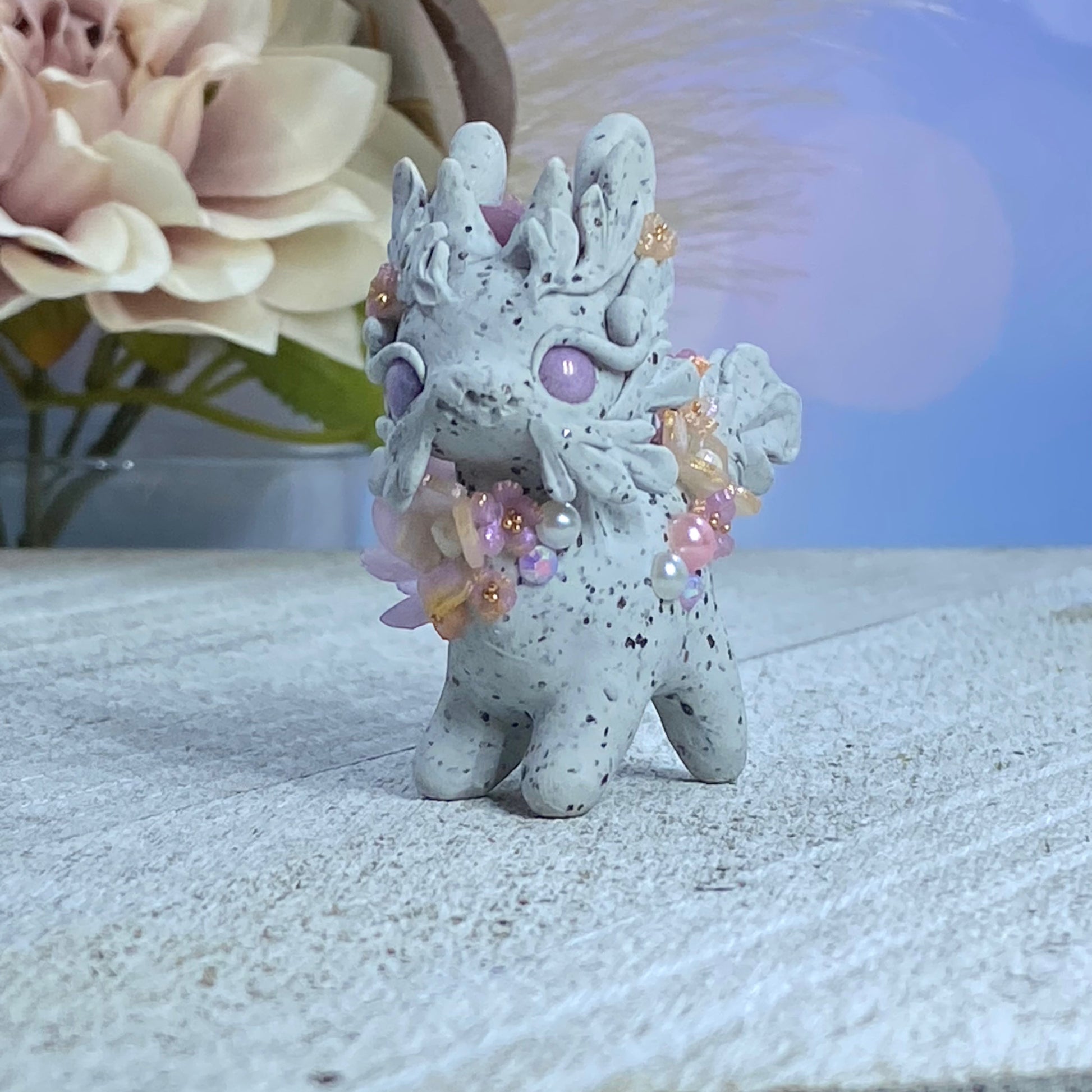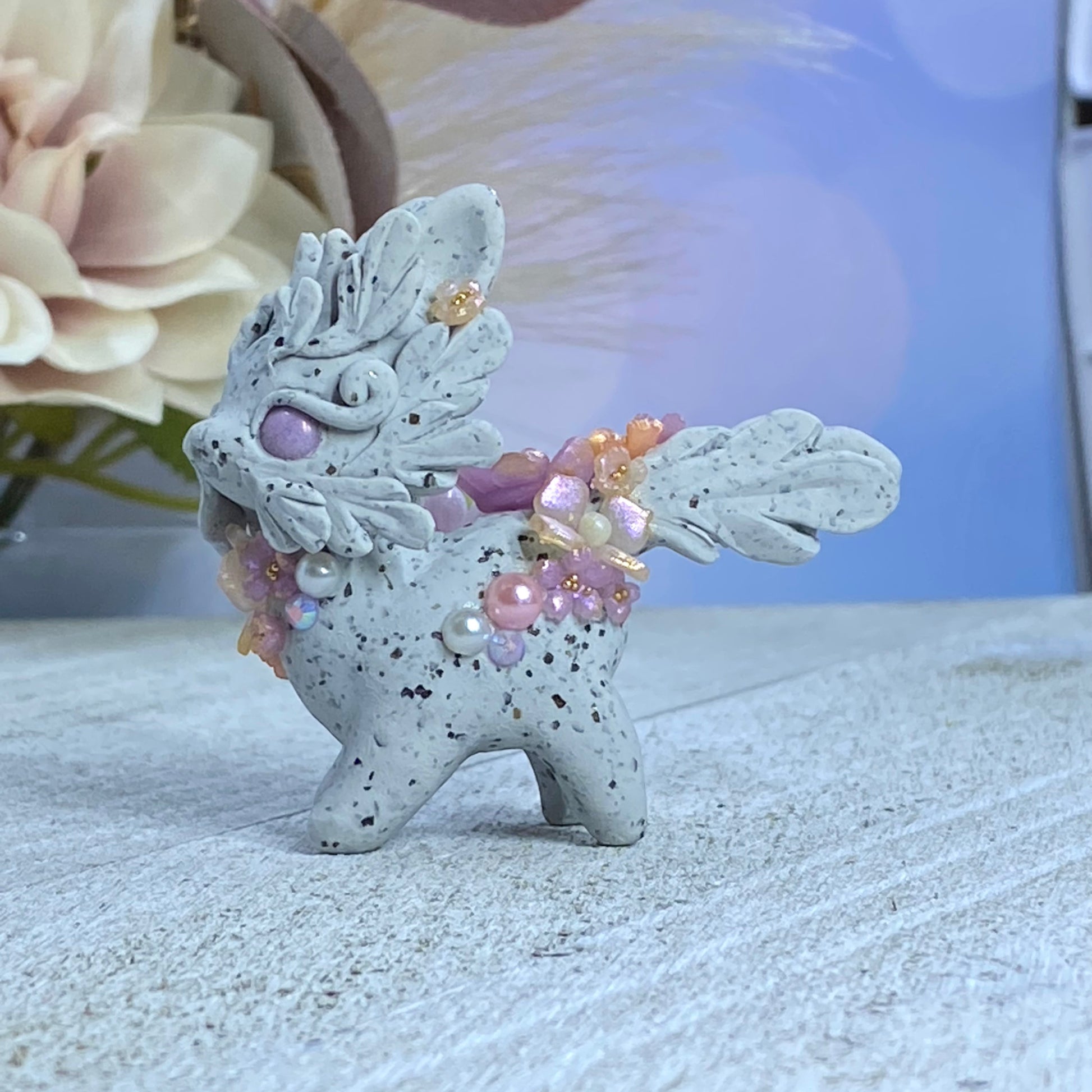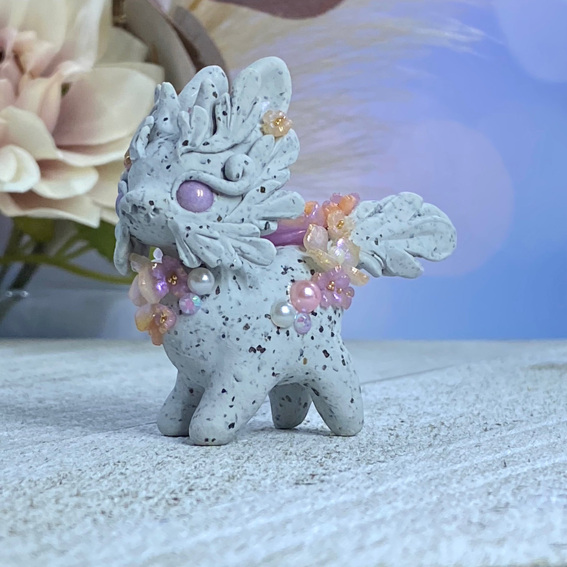 This Lavender and Pink Stone Bunnigon is an elegant and exquisite piece of art. Crafted with polymer clay, pearl pigment powders and resin, it is adorned with flowers, succulents, Swarovski crystals and gold seed beads. For an extra touch of beauty, it includes a delicate resin flower sculpted petal by petal using UV resin located on the left side of its body.