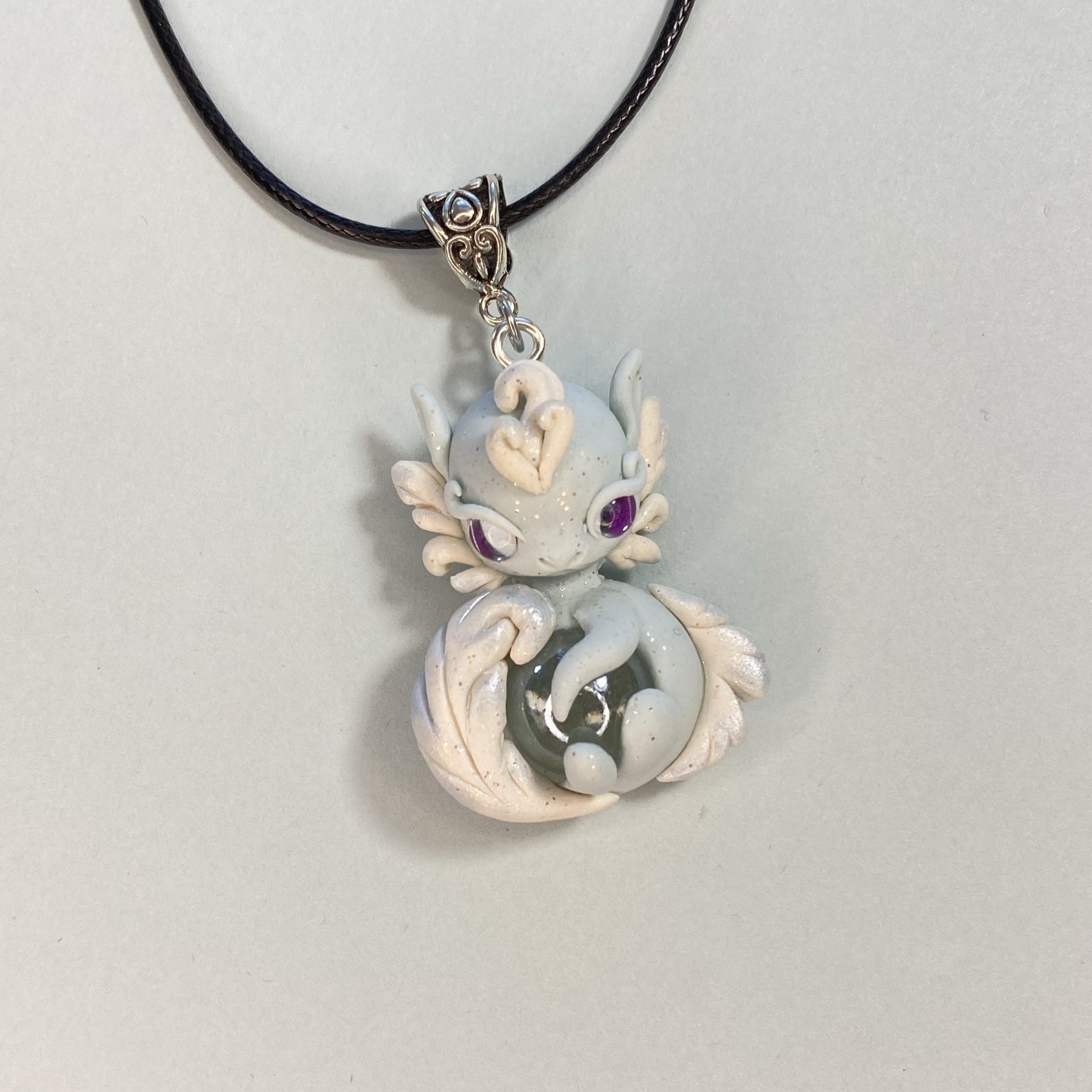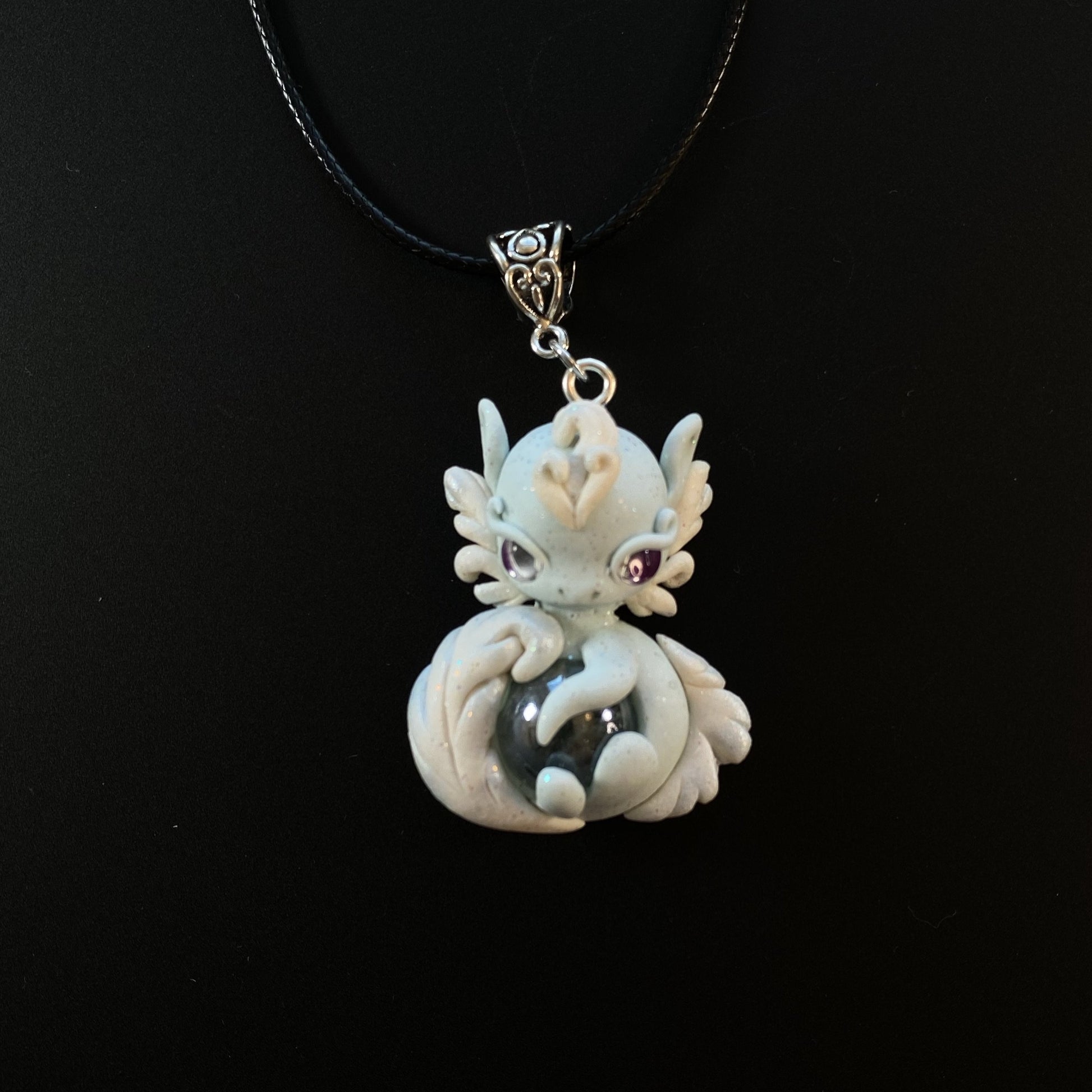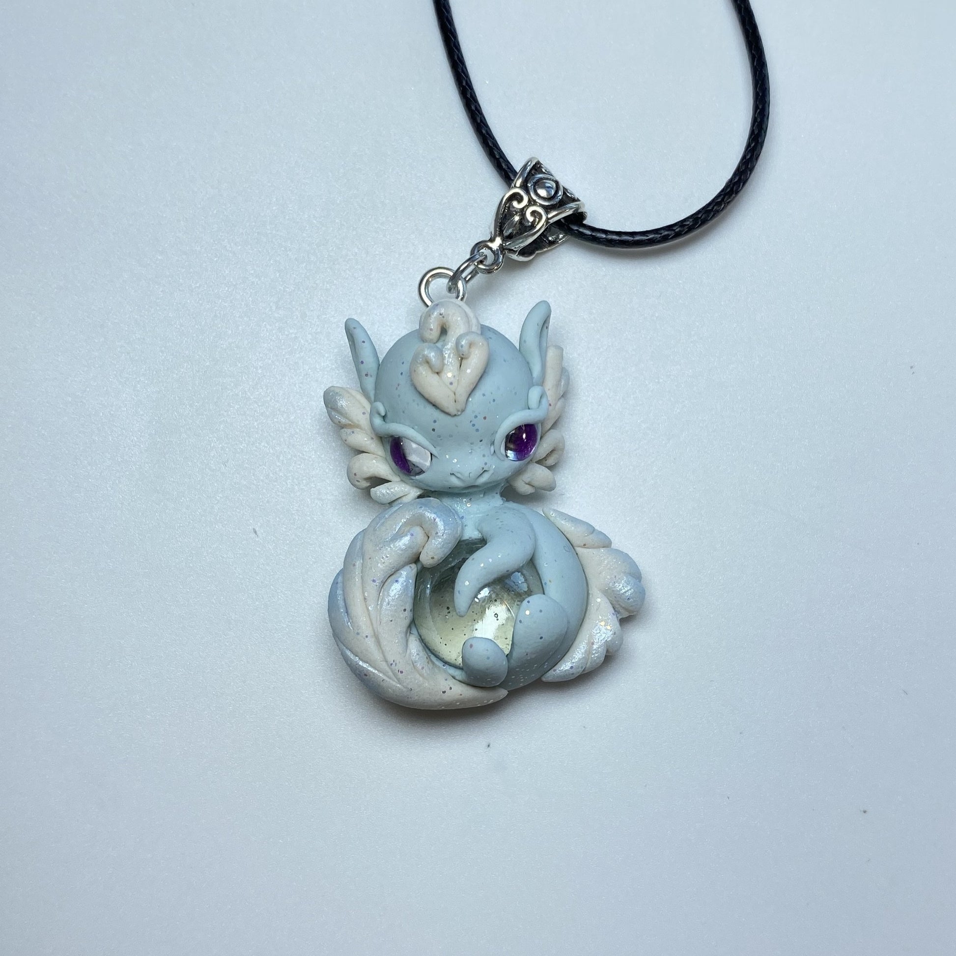This little blue and white Dragon is protectively clutching his glass marble. His eyes glow in the dark when exposed to uv light or bright lights for a period of time. Materials used include sculpey premo frost white glitter clay and turquoise, pastel pearl pigment powders, glow powder, uv resin and glass cabochon for eyes. Leather necklace is included.
