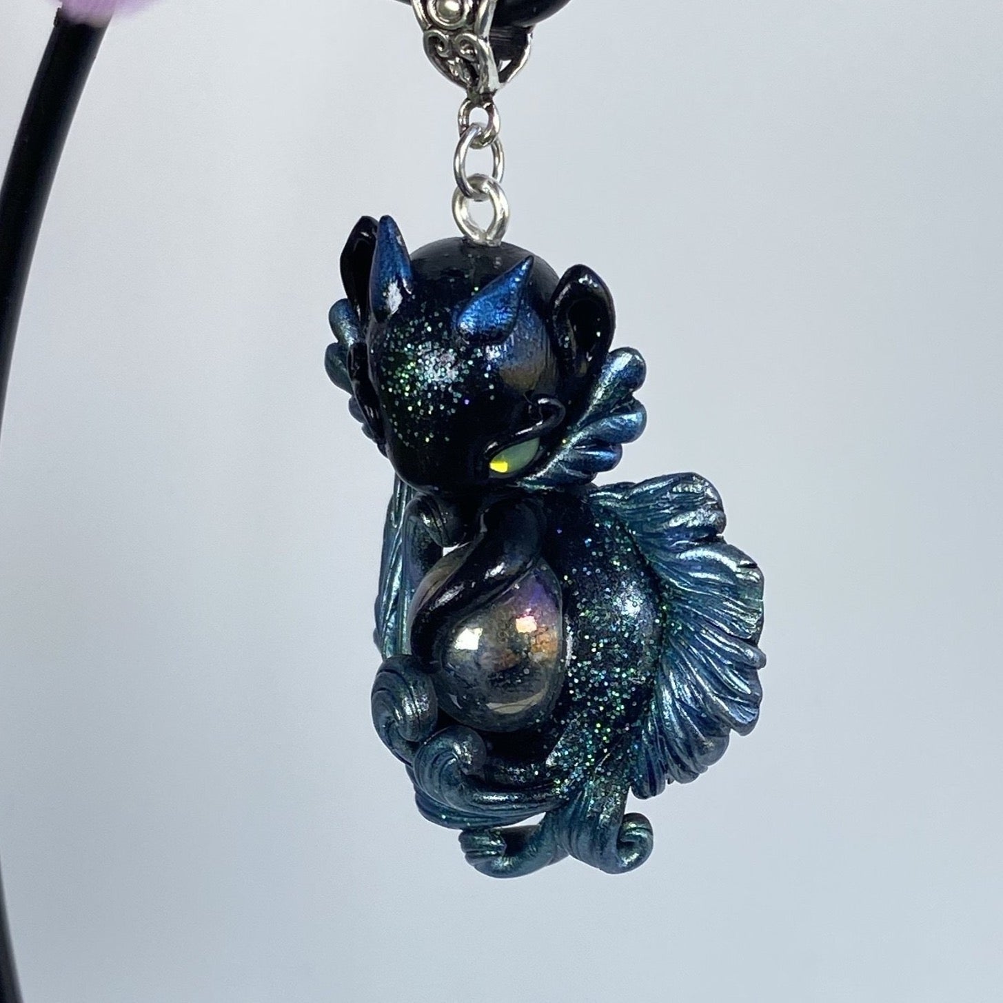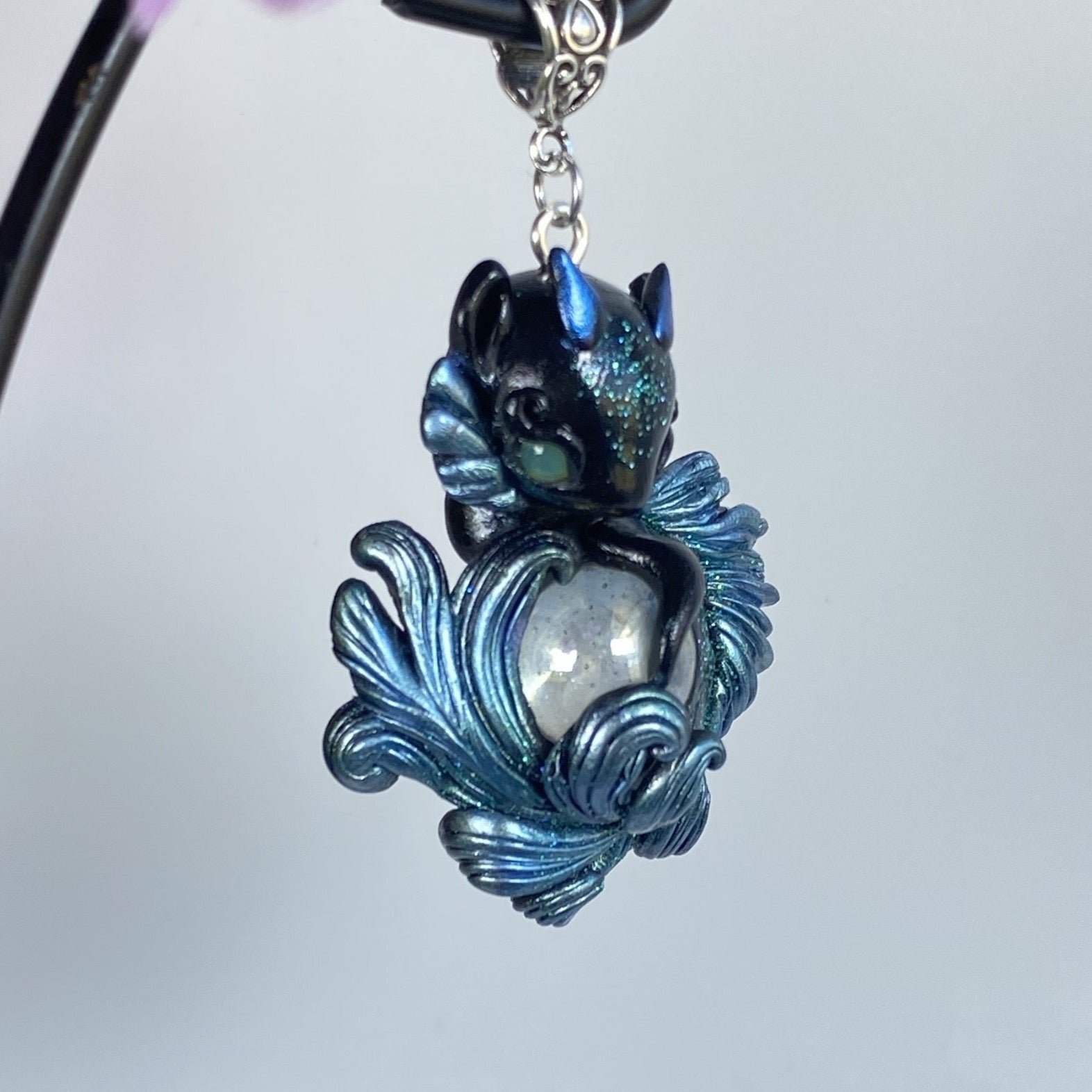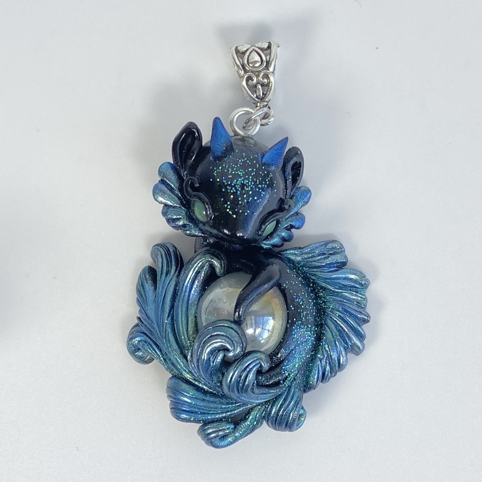 This black dragon's mane beta like tail is shaded with shades of light green and silver. Sparkling glitter for scales. Materials used include sculpey premo, holographic glitter, powdered pearl pigments and ab crystal cabochons for eyes. Leather necklace is included.