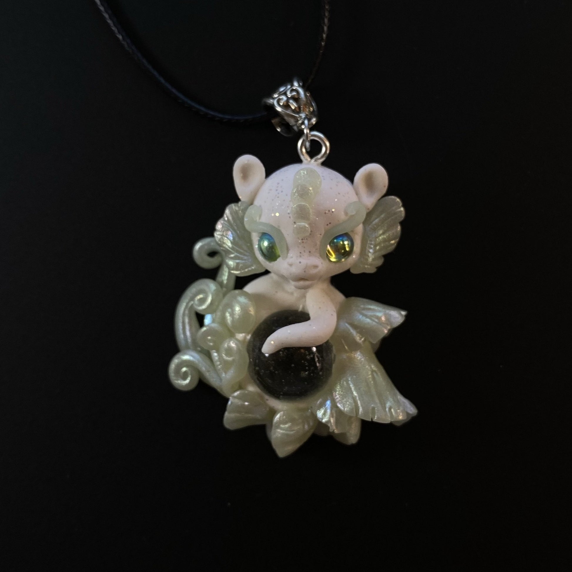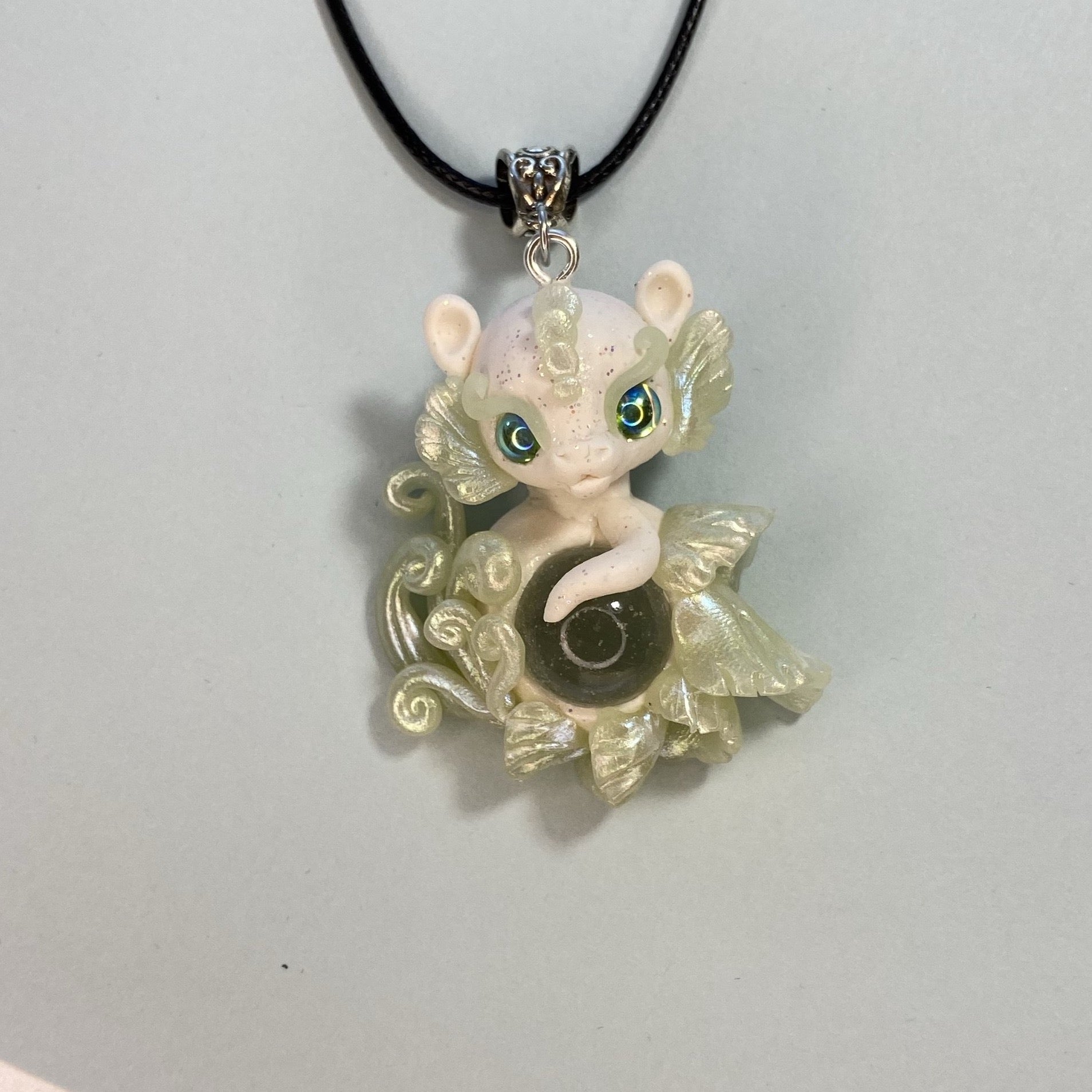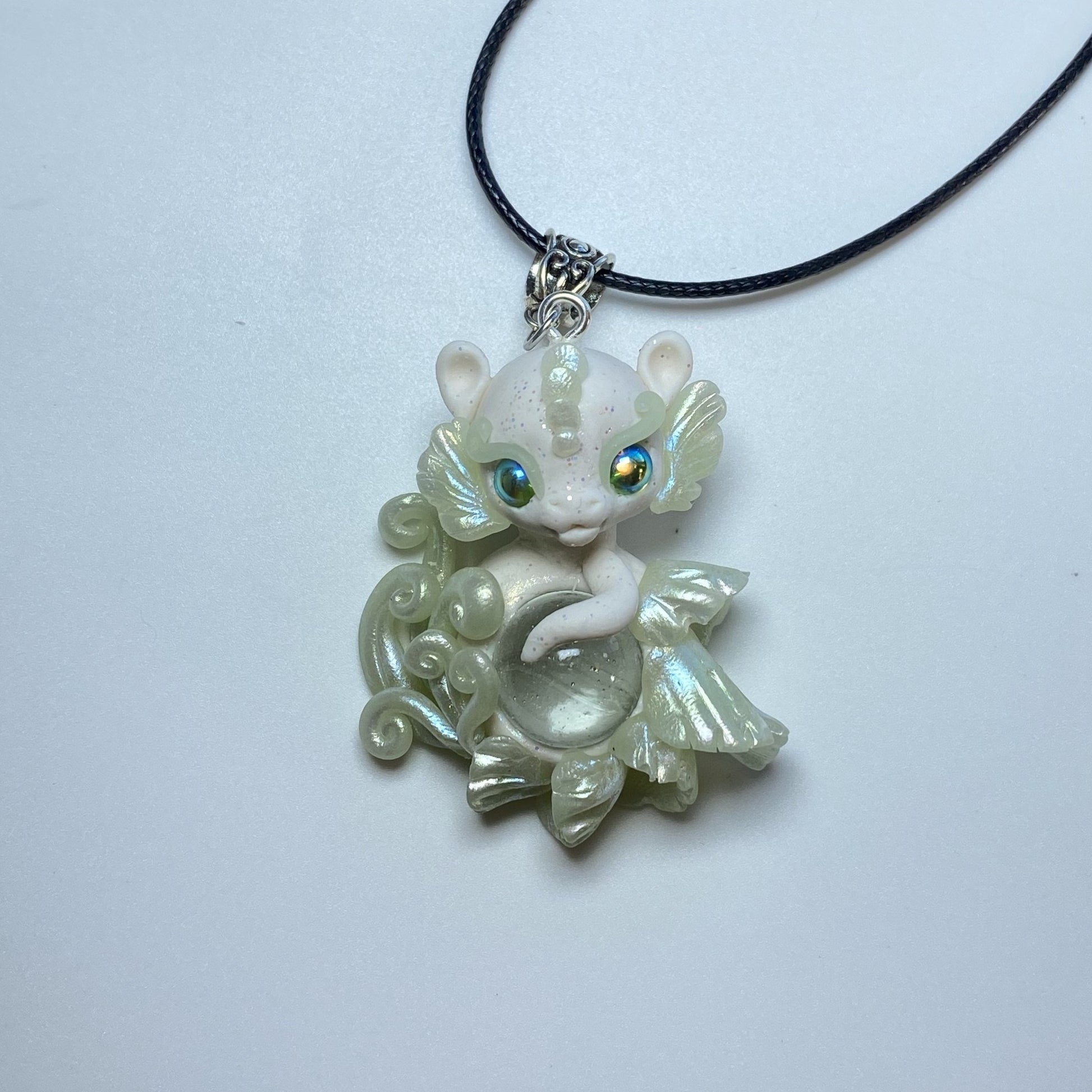 This little Dragon Jelly is guarding her marble. She is white with light green tentacles and jellyfish skirt. Materials used include sculpey premo frost white glitter clay and translucent, pearl ex powder pigments and ab green crystal cabochon eyes. Leather necklace is included.