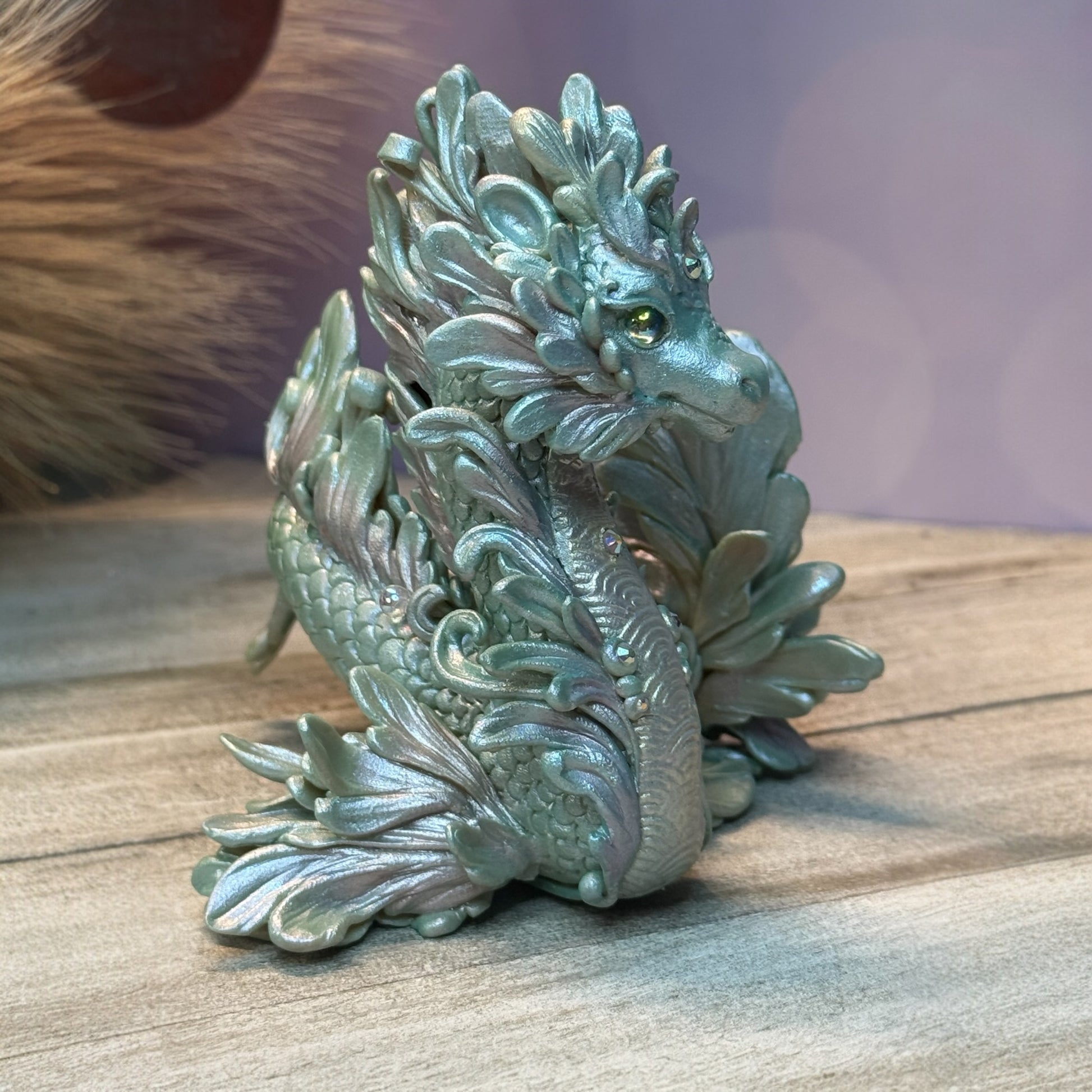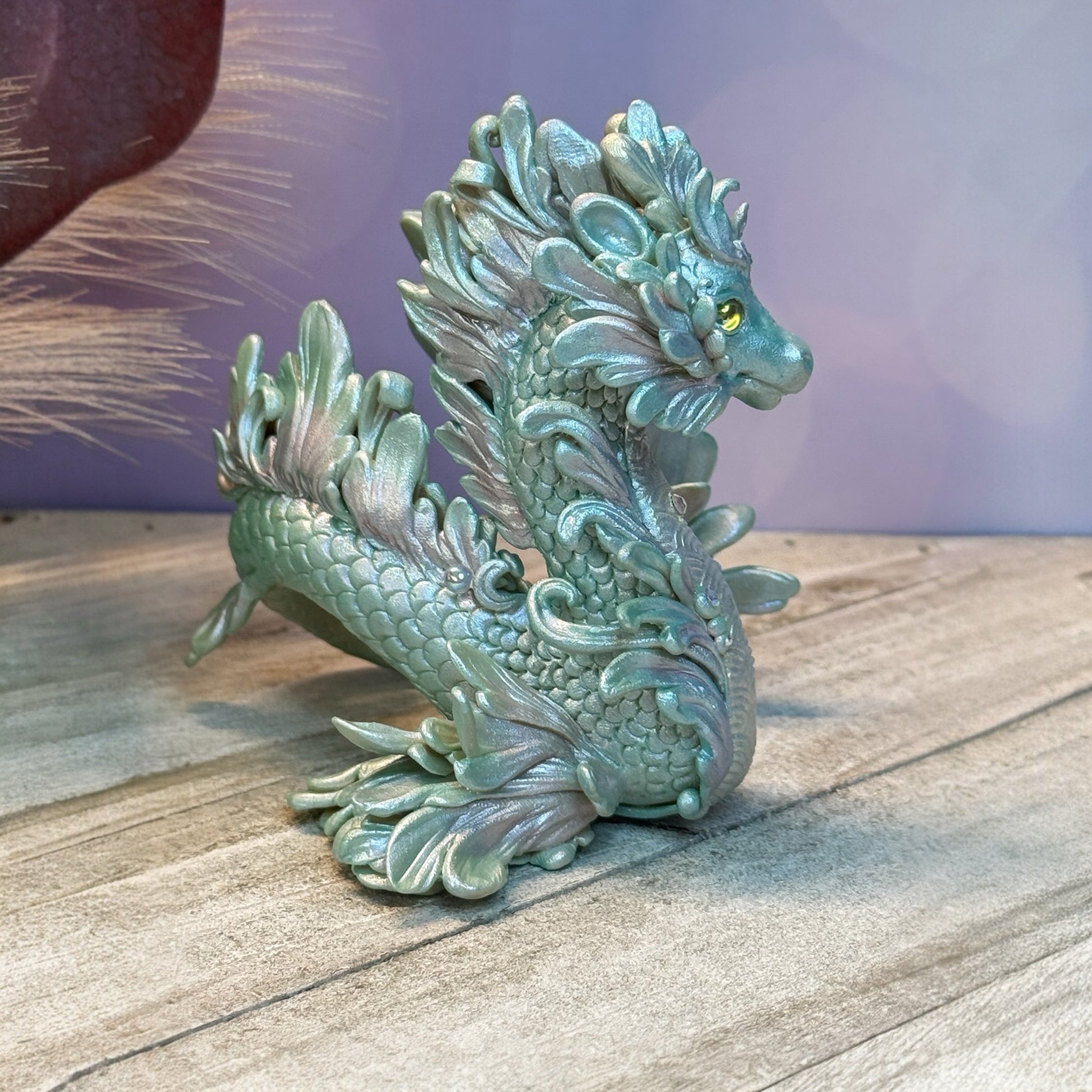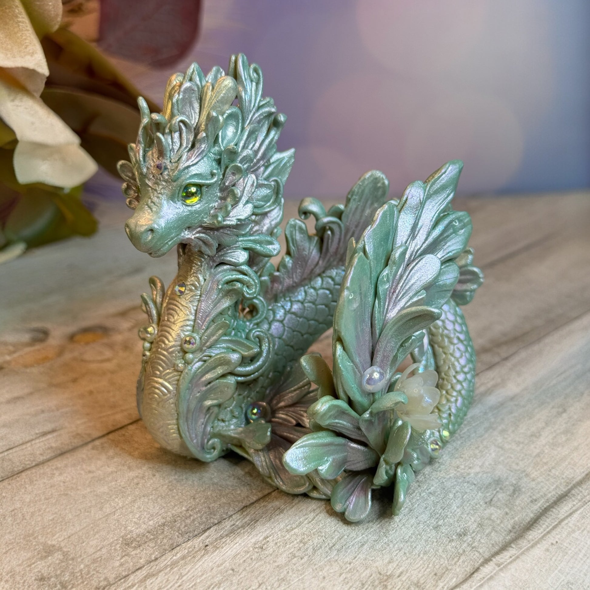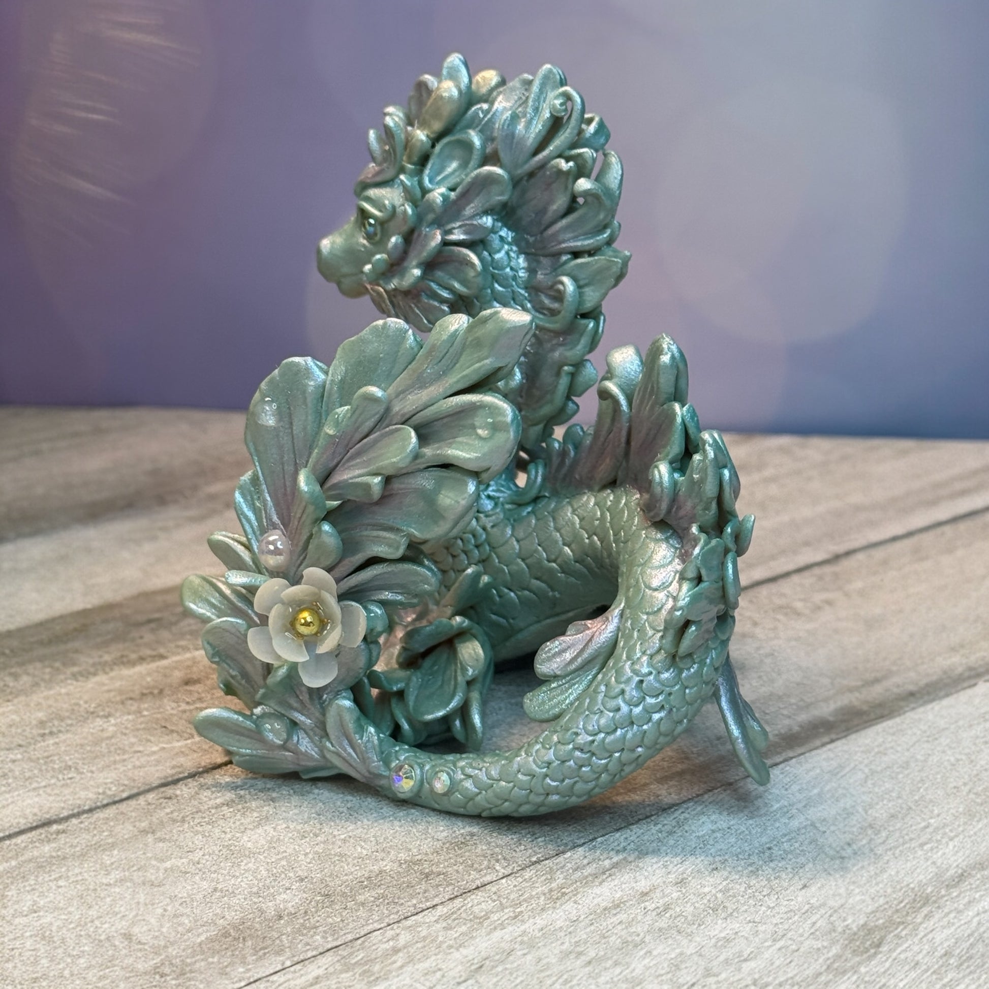 Introducing the Magestic Pearl Green and Pink Kelpie Dragon! This dazzling shimmery dragon features vibrant mint green and pink colors, along with a hand-sculpted resin flower on its tail fin. Made with high-quality materials including cosclay polymer clay, genuine Swarovski crystals, ab glass beads, preciosa crystal cabochons for eyes, and faux pearl cabochon, this dragon is sure to add a touch of elegance to any collection.
