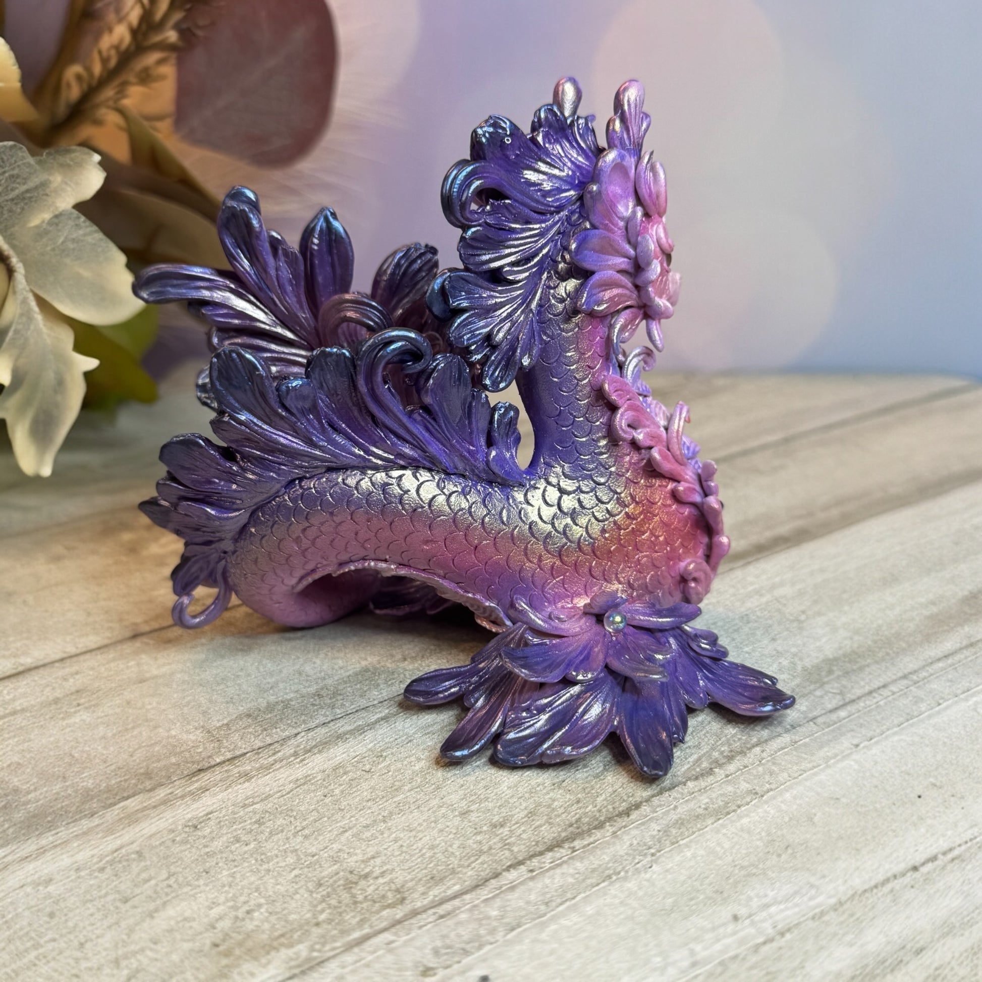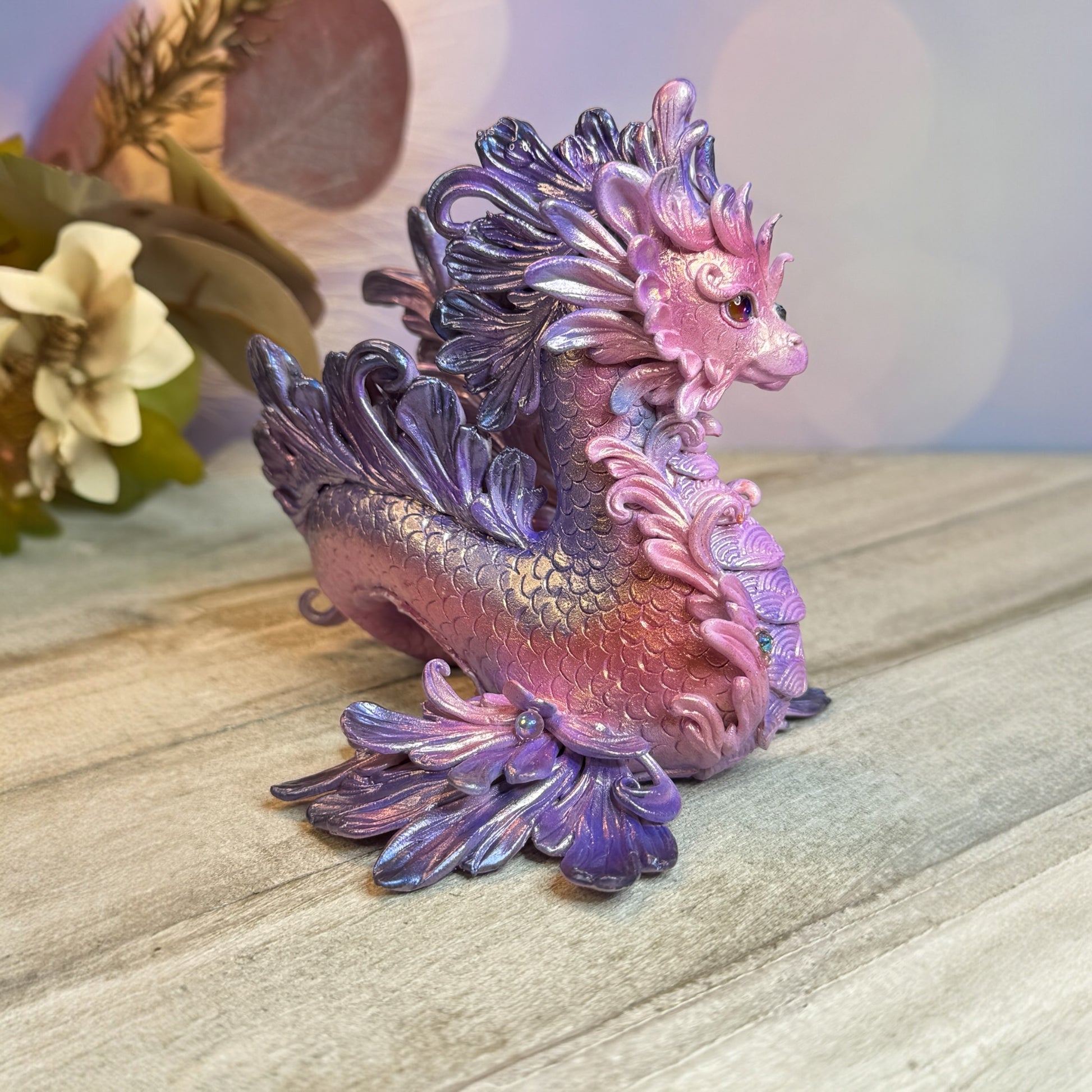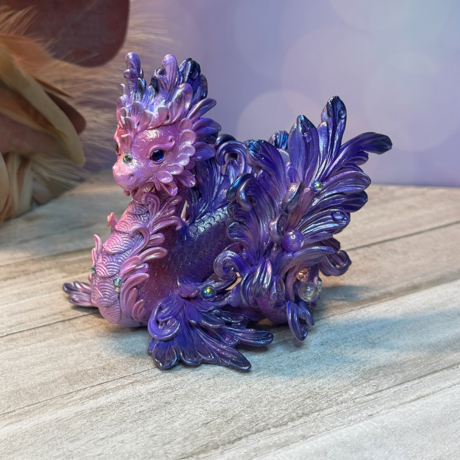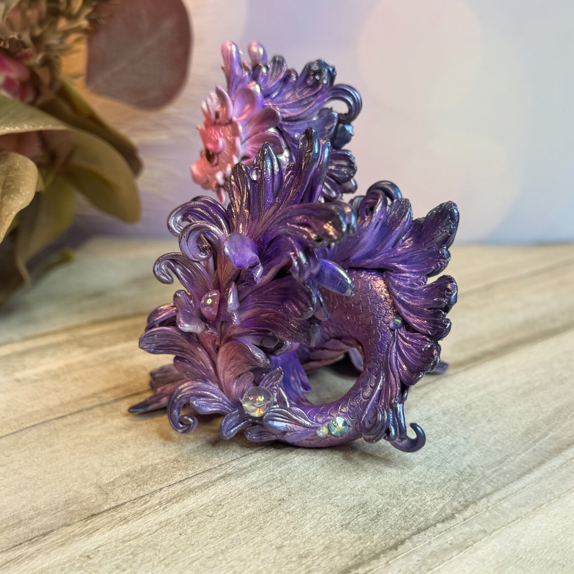 Introducing the Magestic Sunset Purple and Pink Kelpie Dragon! This dazzling shimmery dragon features vibrant pink and purple hues to imitate the sky changing after the sun sets. Made with high-quality materials including cosclay polymer clay, genuine Swarovski crystals, ab glass beads, preciosa crystal cabochons for eyes, and faux pearl cabochon, this dragon is sure to add a touch of elegance to any collection.