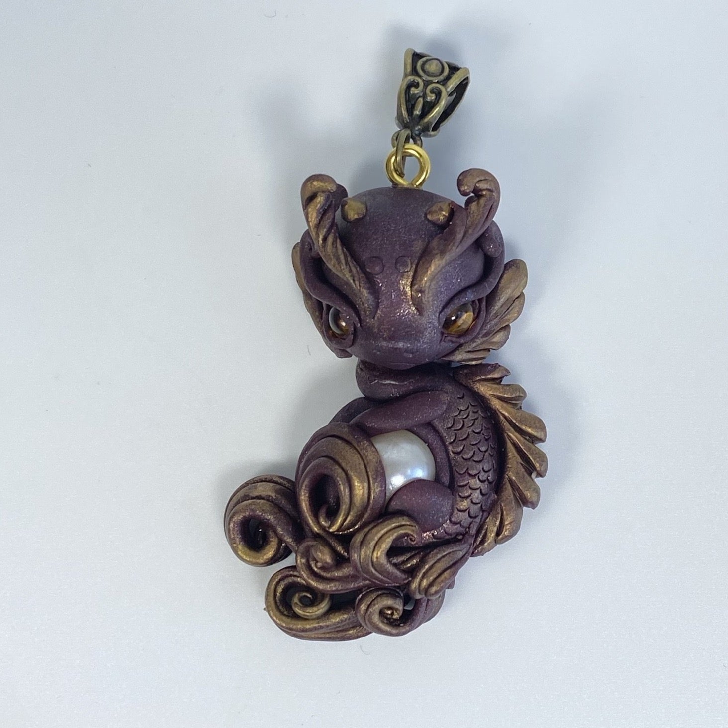 This apple head Dragon In dark maroon hues has a tail that resembles moving clouds. Materials used include sculpey premo, glass pearl, crystal cabochon for eyes and pigment powders. Leather necklace is included.