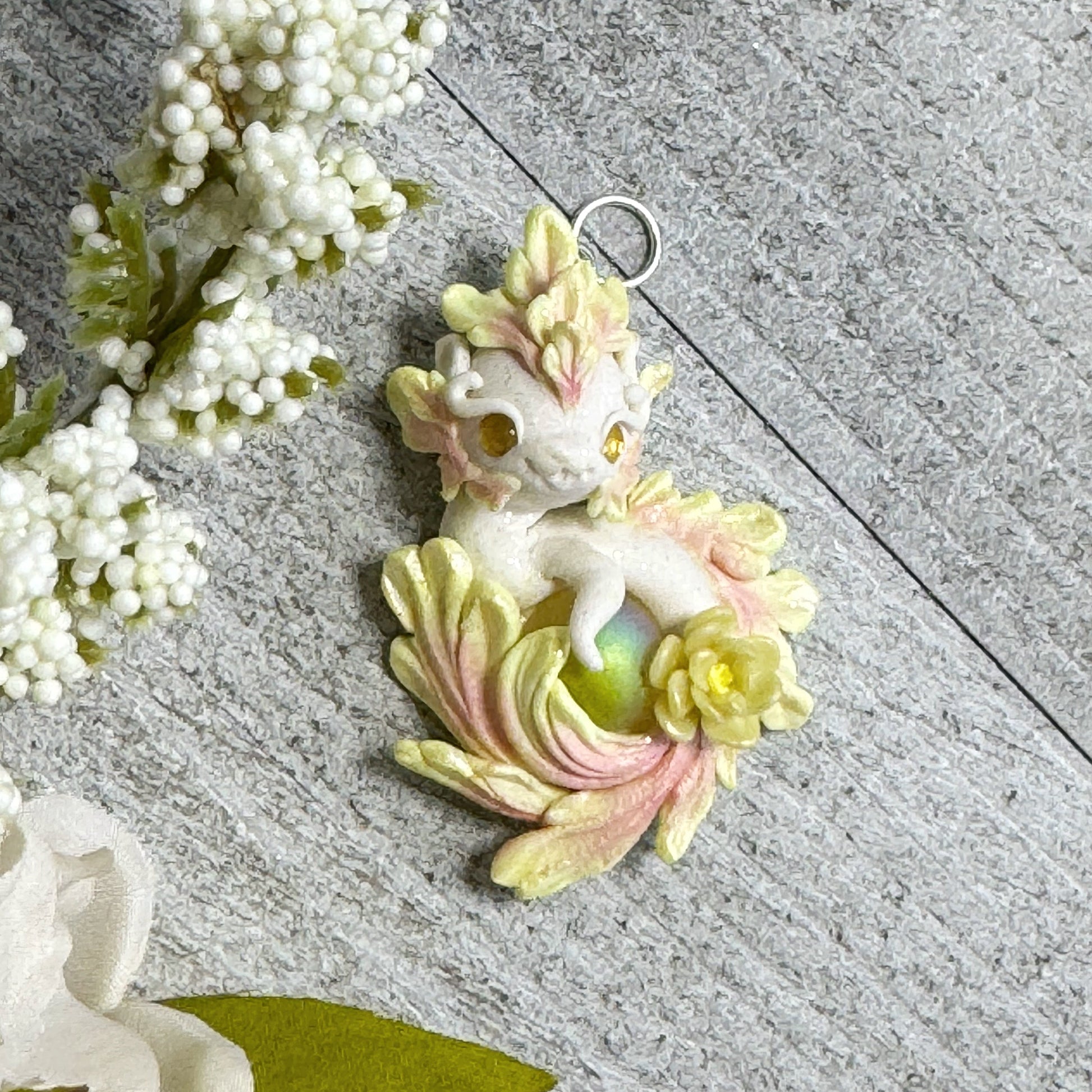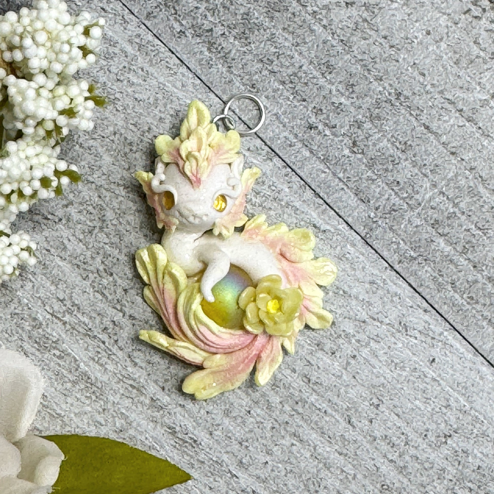 Add a splash of sunshine with the Medium Yellow and Pink Baby Dragon Pendant! Handmade from polymer clay, this playful dragon sparkles with glass cabochon and marble accents, enhanced by vibrant pigment powders and delicate gold seed beads. It comes ready to wear on an 18" leather cord necklace, making it a unique, one-of-a-kind accessory that brings a cheerful, magical touch to any outfit.