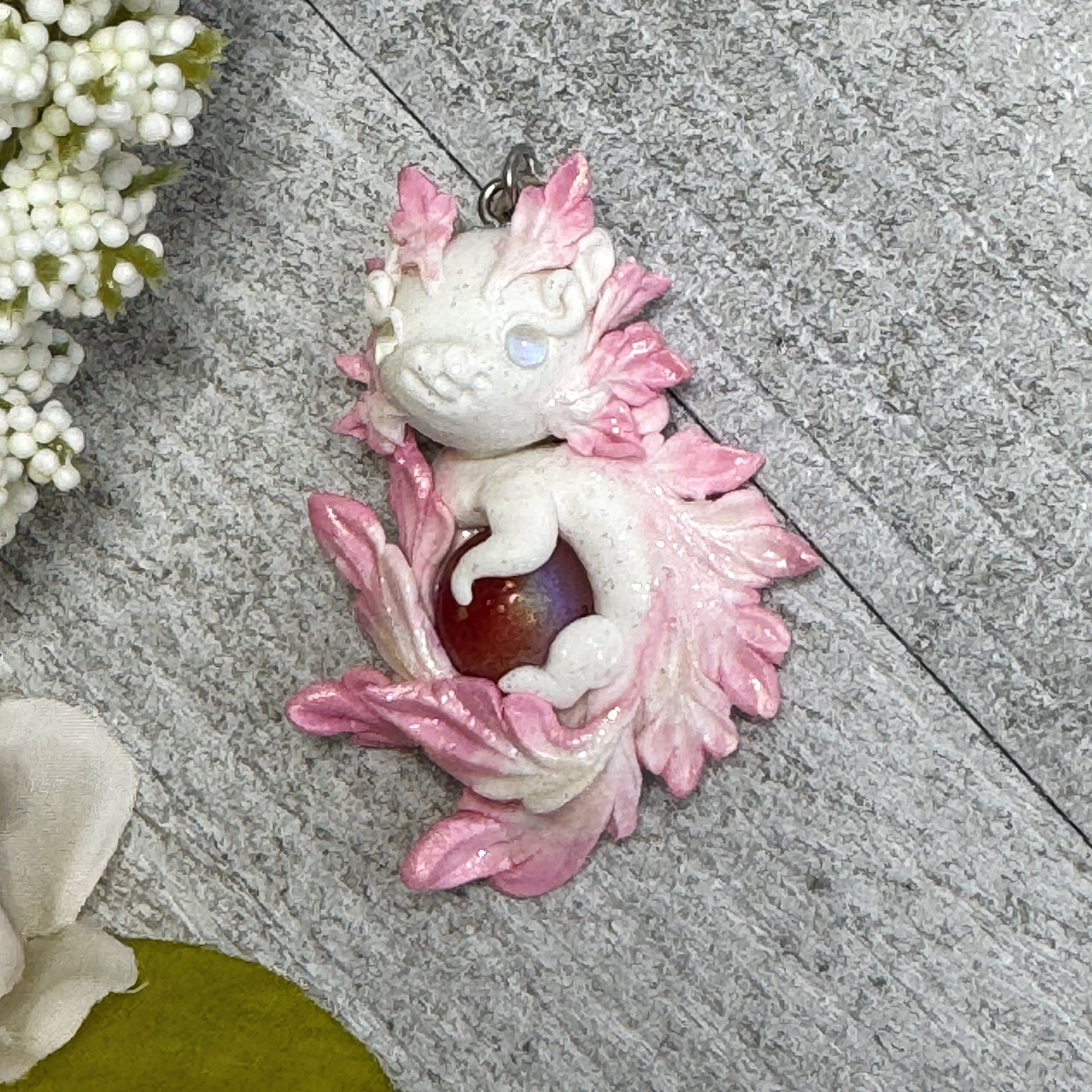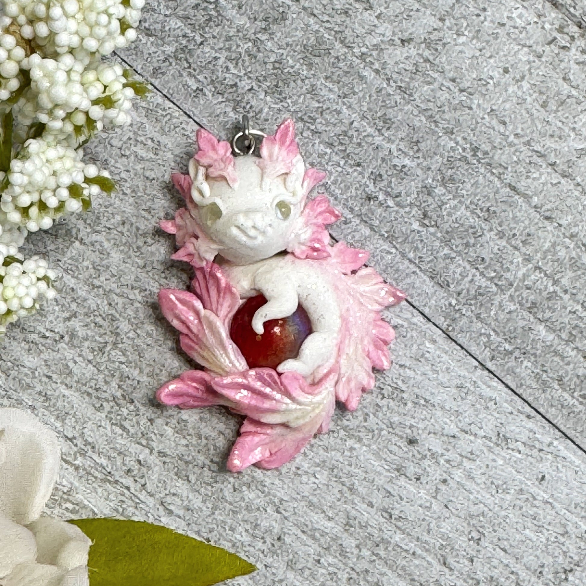 This Medium White and Bright Pink Baby Dragon Pendant is a playful blend of charm and sparkle. Crafted from polymer clay with shimmering glass cabochon and marble accents, it glows with vibrant pigment powders and delicate gold seed beads. Ready to wear on an 18" leather cord necklace, this one-of-a-kind dragon adds a fun and magical touch to any outfit, perfect for those who love unique, whimsical accessories.