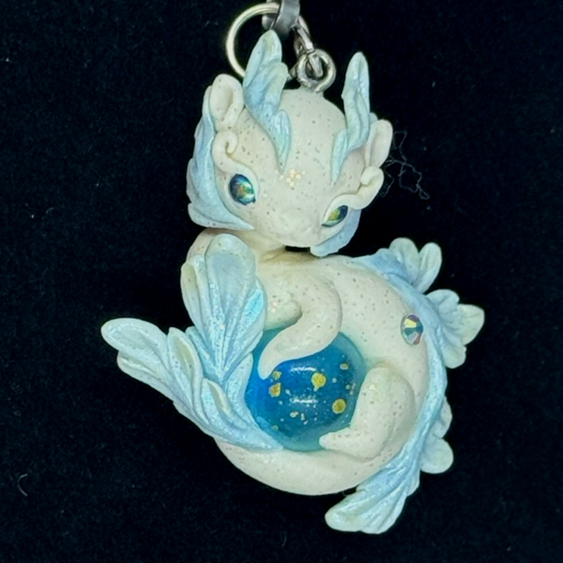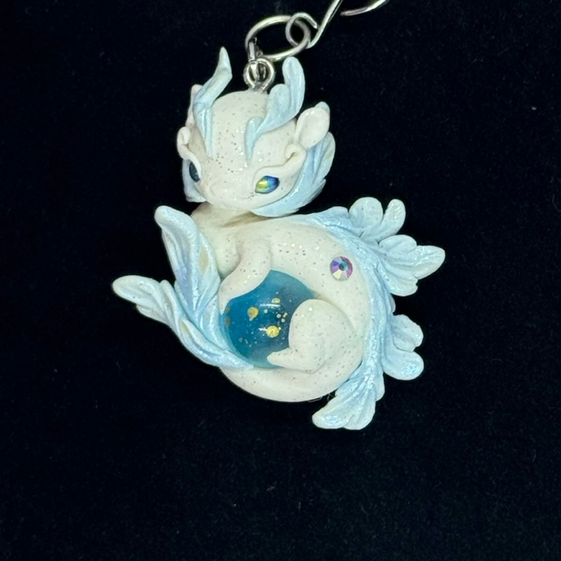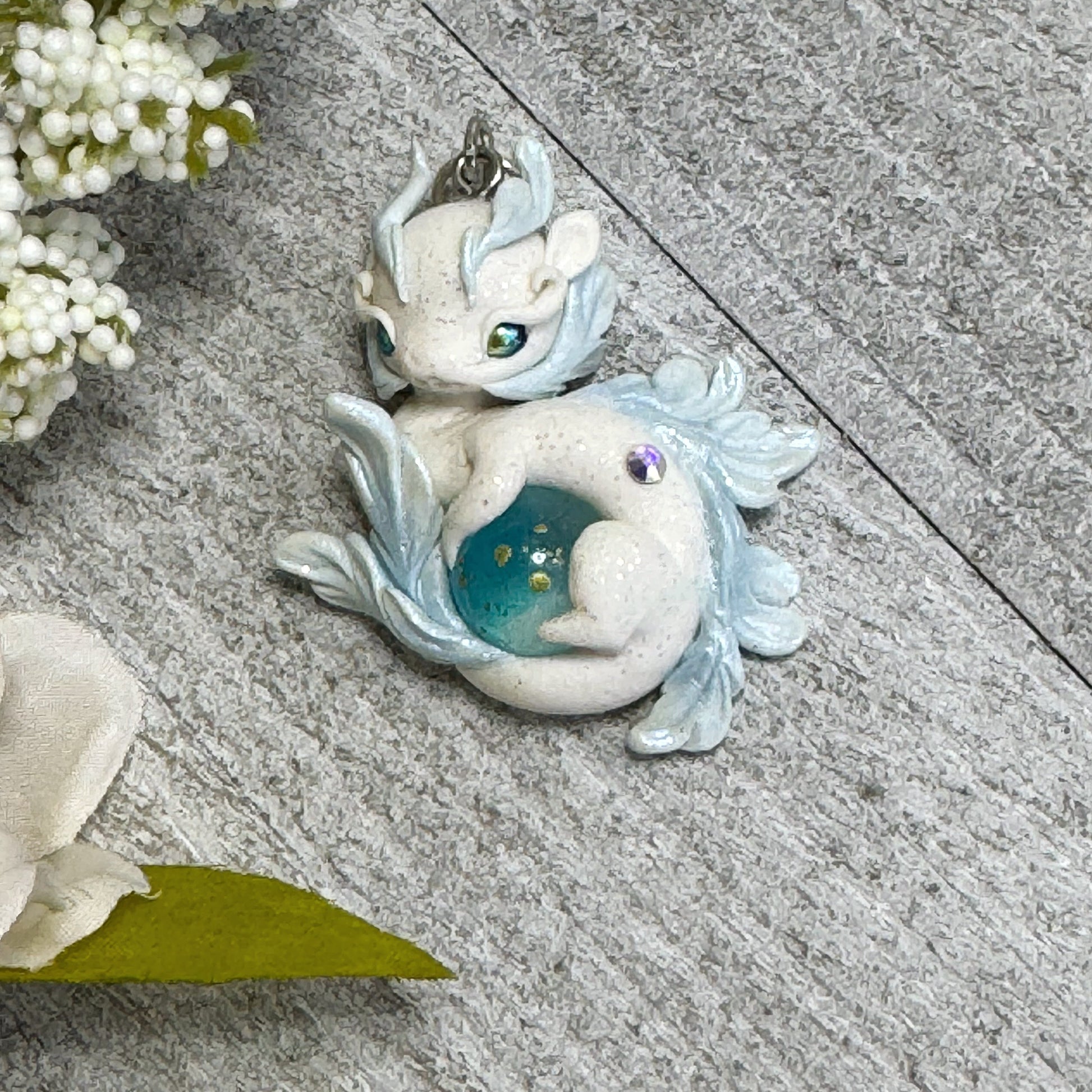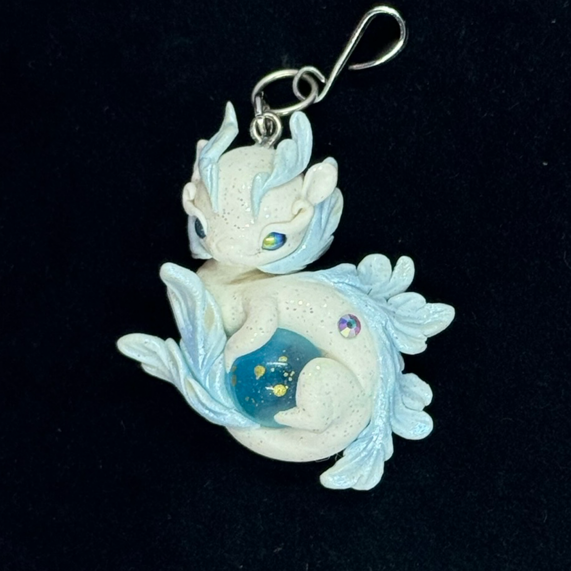 This Mini White and Ice Blue Baby Dragon Pendant is a charming little treasure crafted from polymer clay, featuring sparkling glass cabochon and marble accents. Enhanced with shimmering pigment powders and delicate gold seed beads, it glows with icy magic. Ready to wear on an 18" leather cord necklace, this one-of-a-kind piece adds a playful, enchanting touch to any outfit. Perfect for those who love a dash of fantasy in their everyday style!