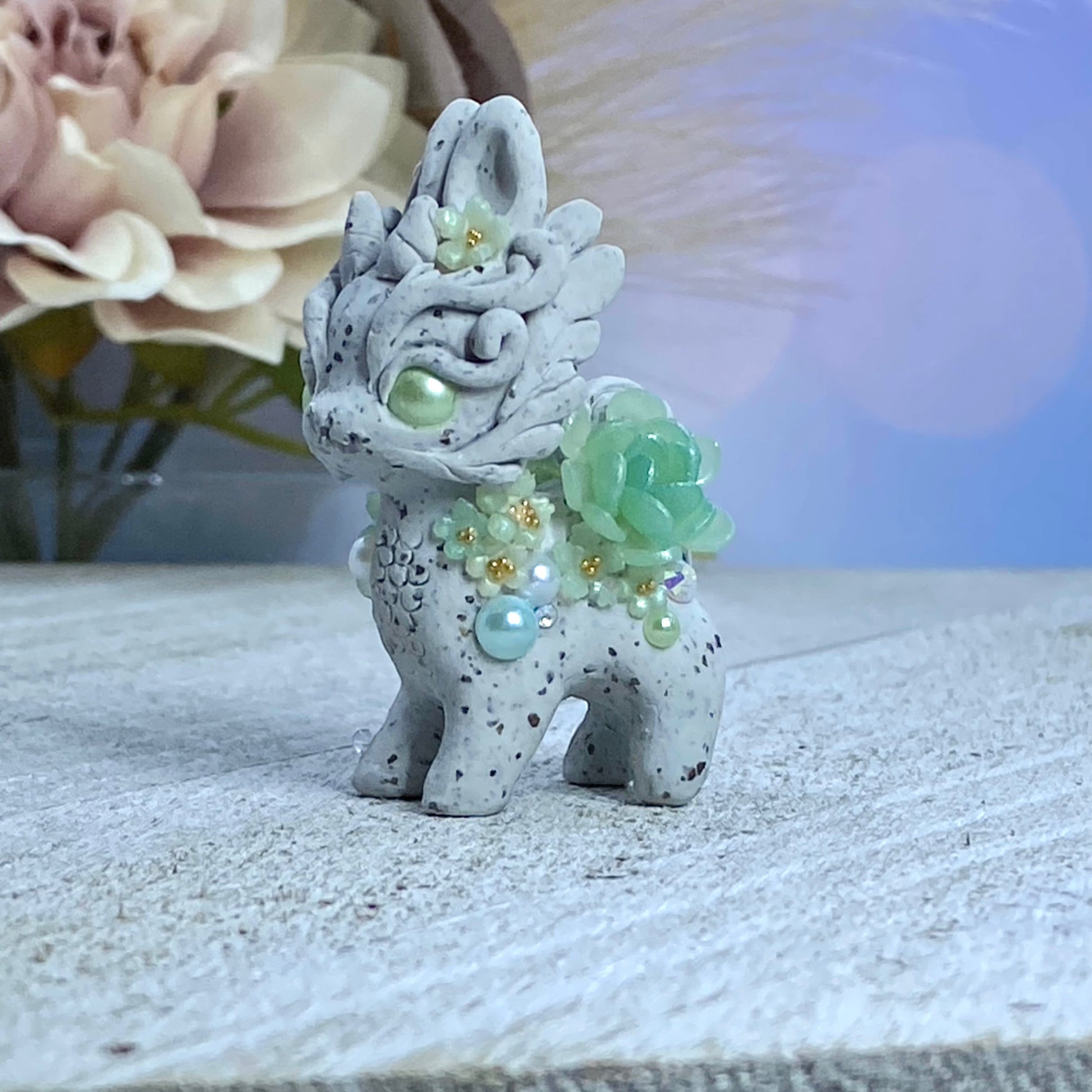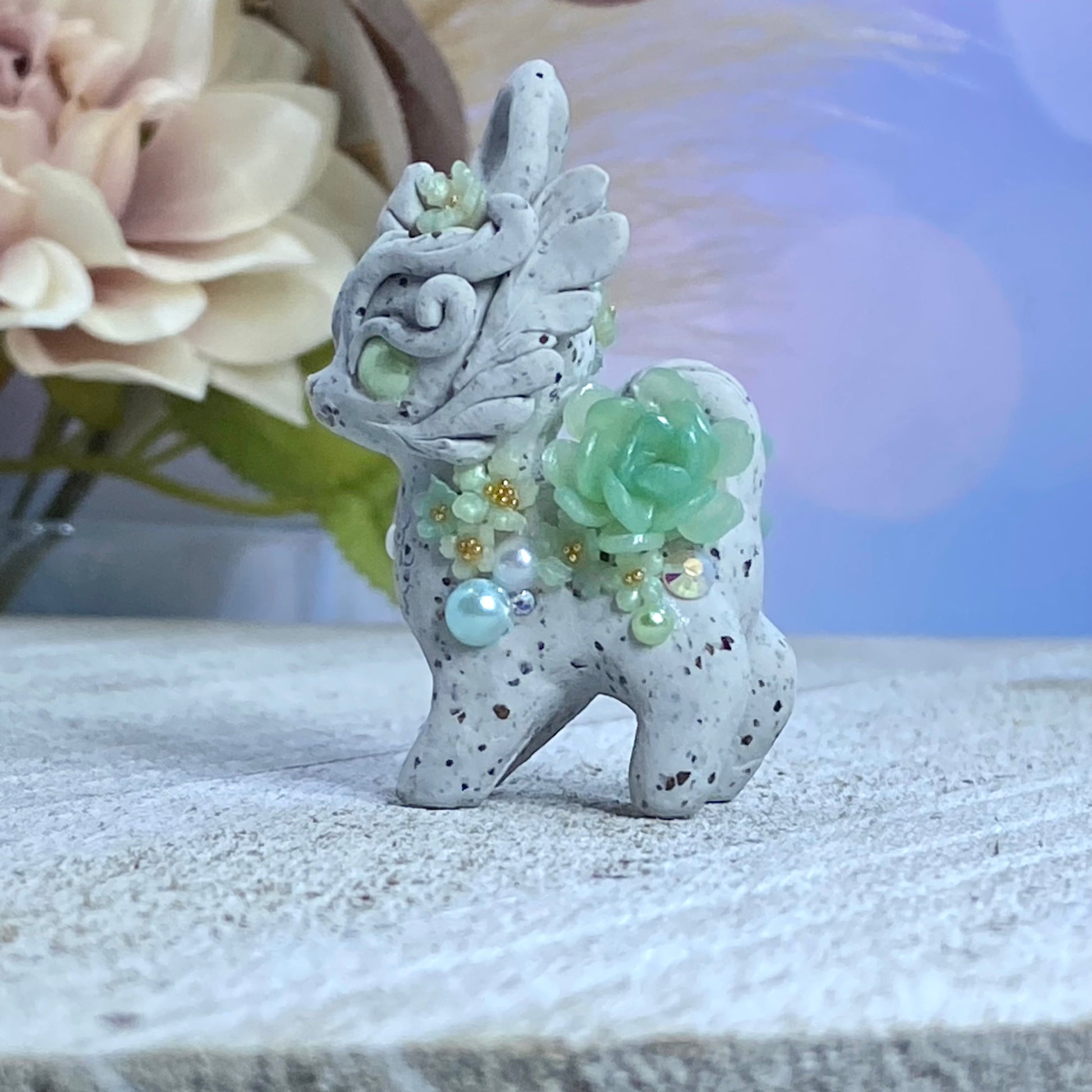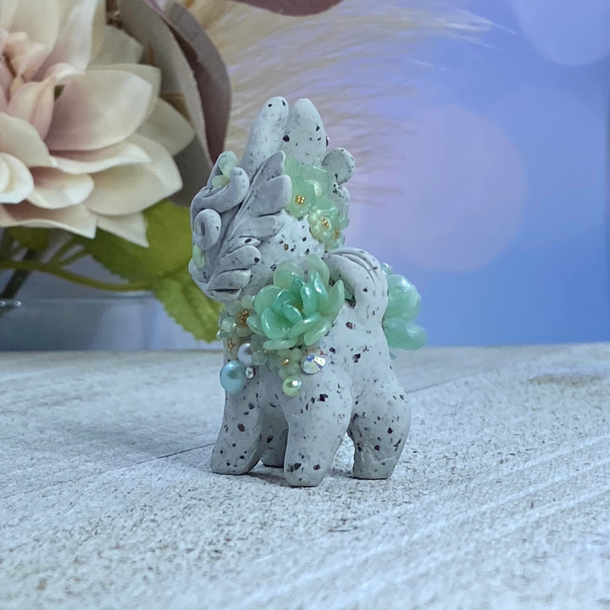 This Mint Green Stone Succulent is a unique work of art, with fine detailing handcrafted with materials like polymer clay and resin. This beauty is adorned with faux pearls, Pearl pigment powders, Swarovski crystals, and gold beed seeds, with a delicate resin flower sculpted petal by petal using UV resin located on the right side of body.