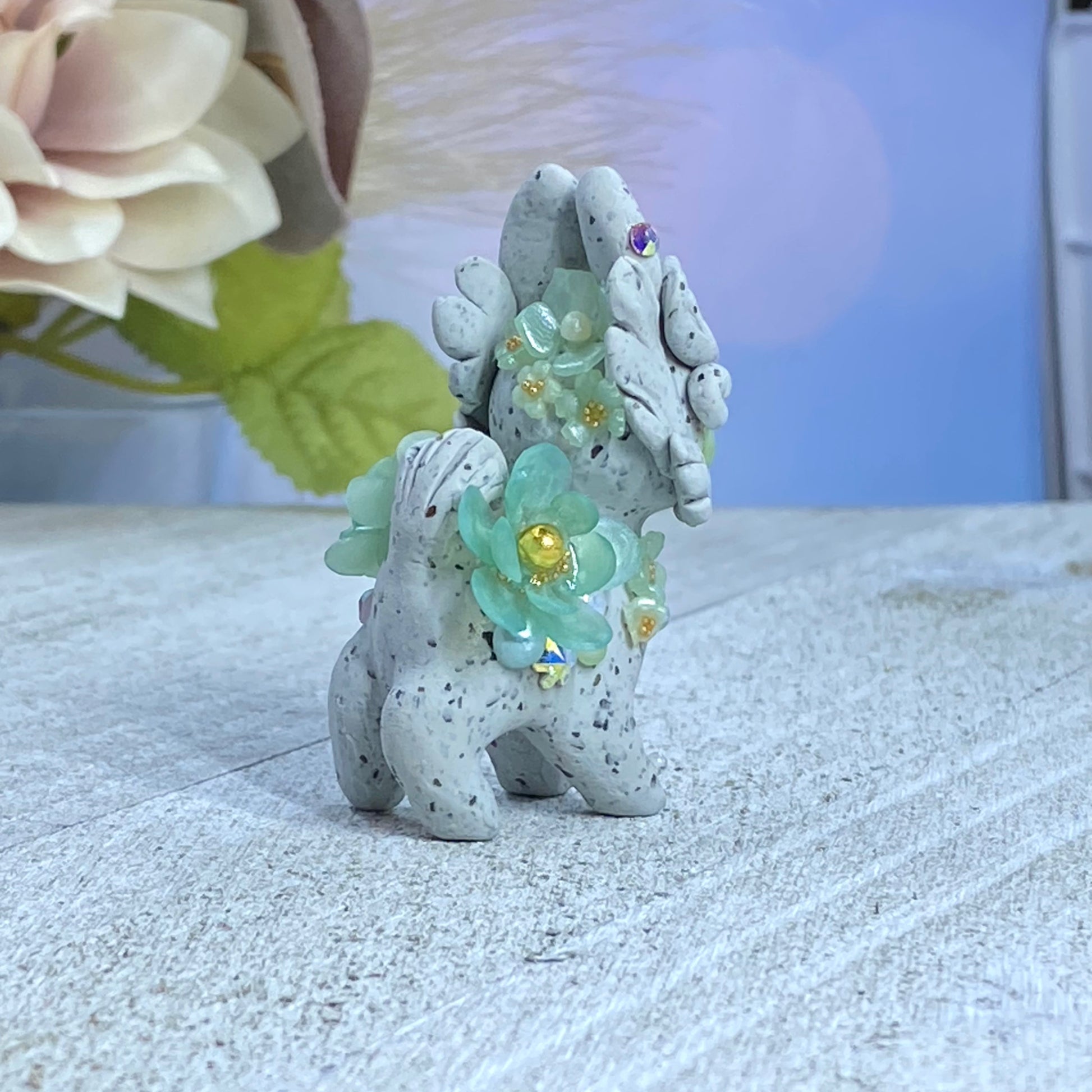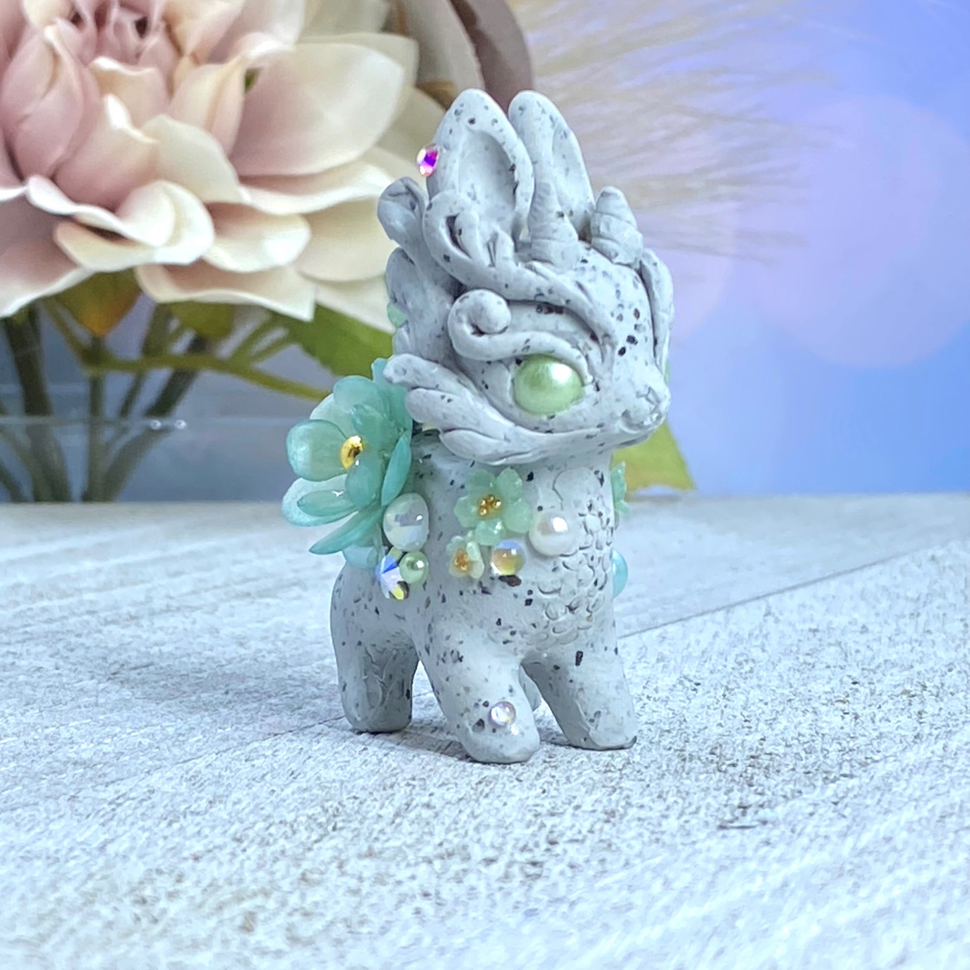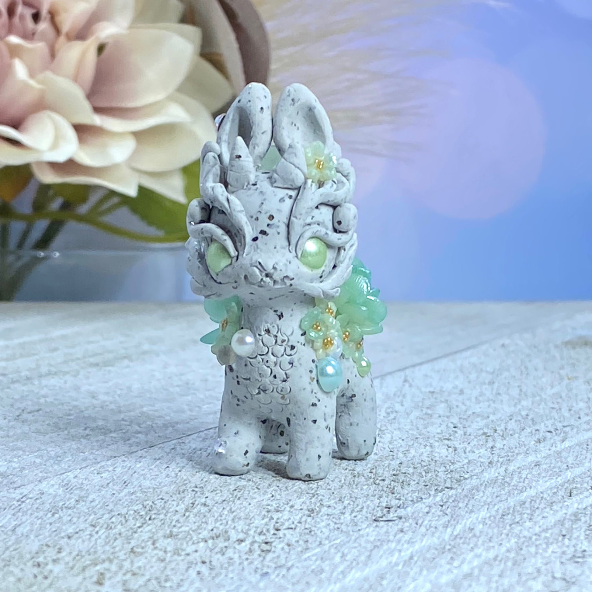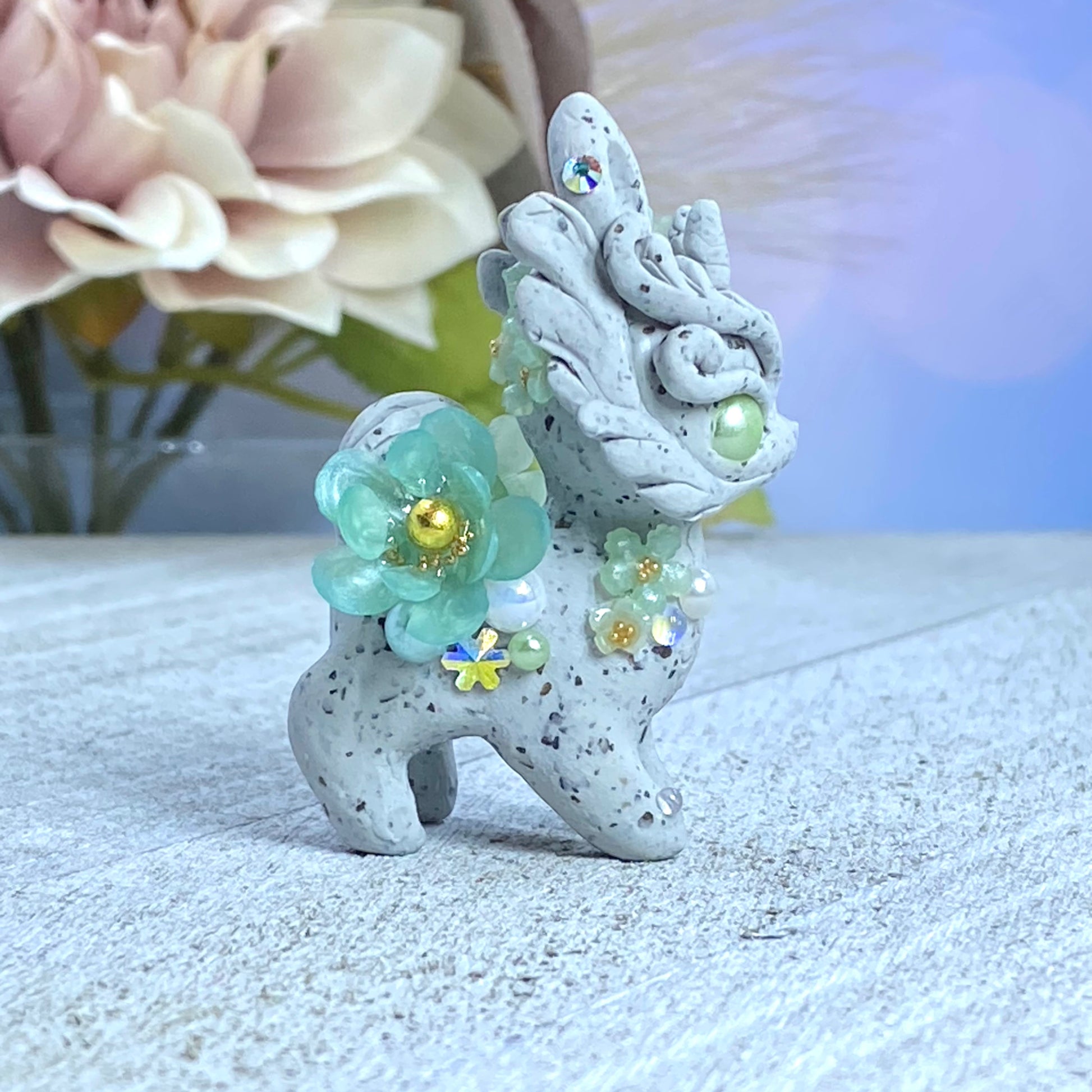 This Mint Green Stone Succulent is a unique work of art, with fine detailing handcrafted with materials like polymer clay and resin. This beauty is adorned with faux pearls, Pearl pigment powders, Swarovski crystals, and gold beed seeds, with a delicate resin flower sculpted petal by petal using UV resin located on the right side of body.
