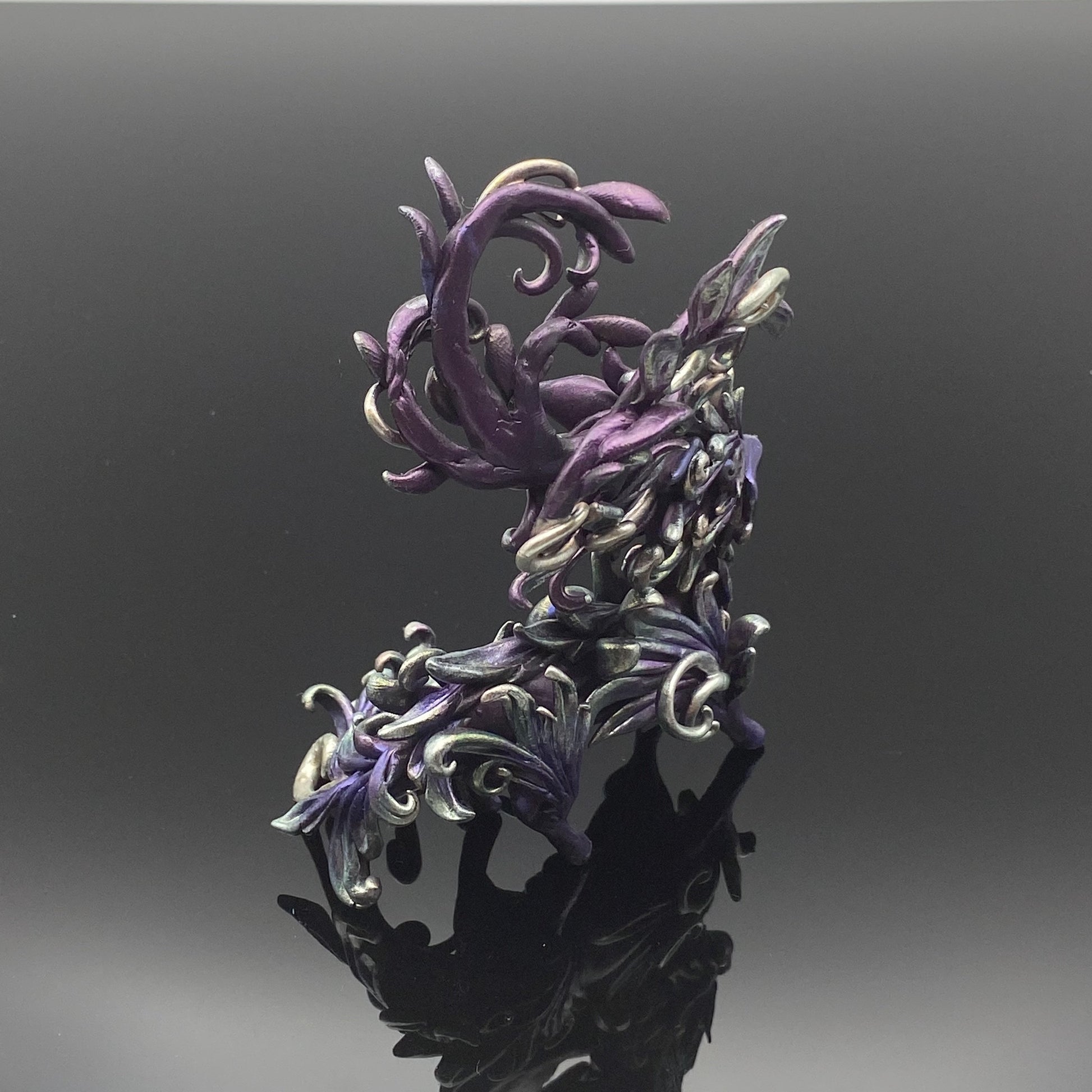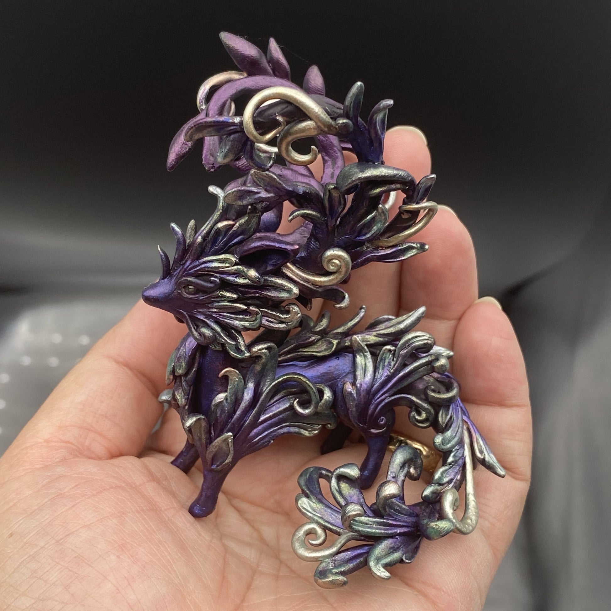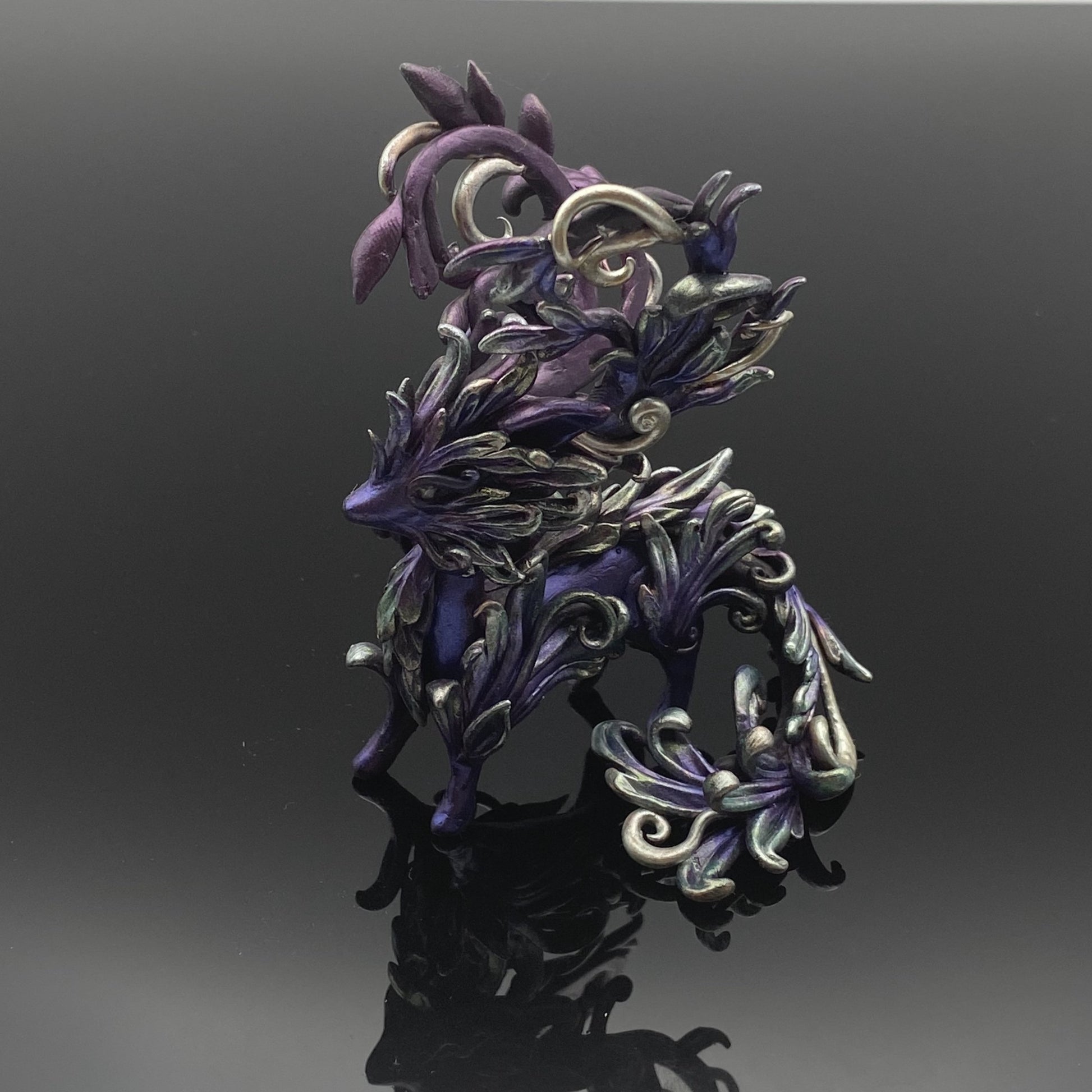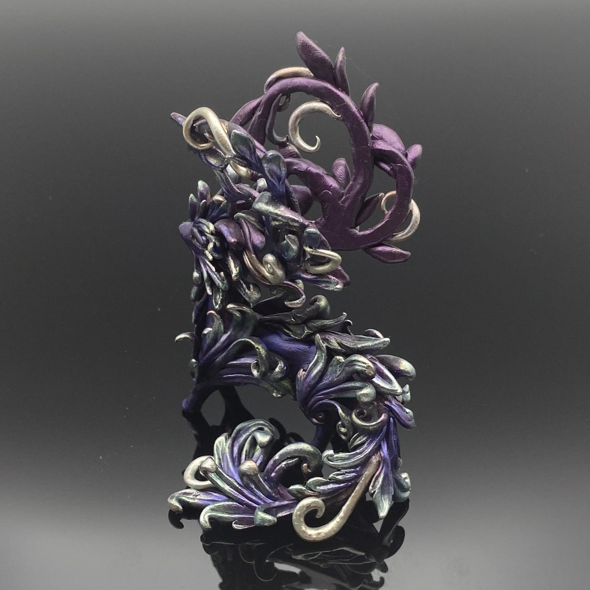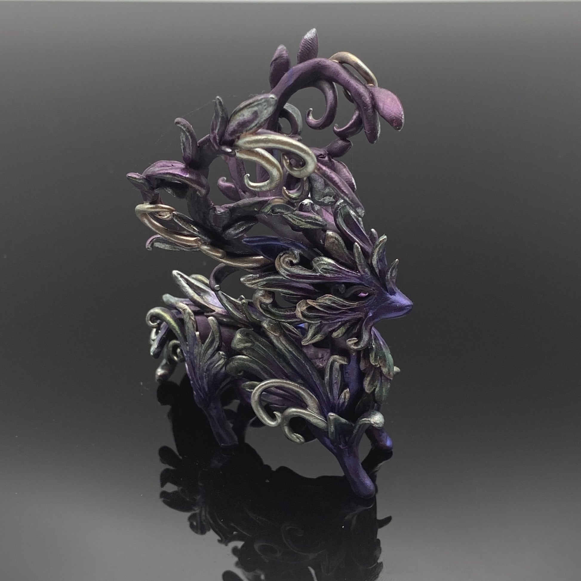 Protector of the forest and bringer of night, nightshade is a swirl of deep purple and blue hues and accented with silvery green and gold foliage. Sculpted by hand and made out of Sculpey Clay, this forest spirit is painted in rich acrylics and has swarovski crystal bead eyes.