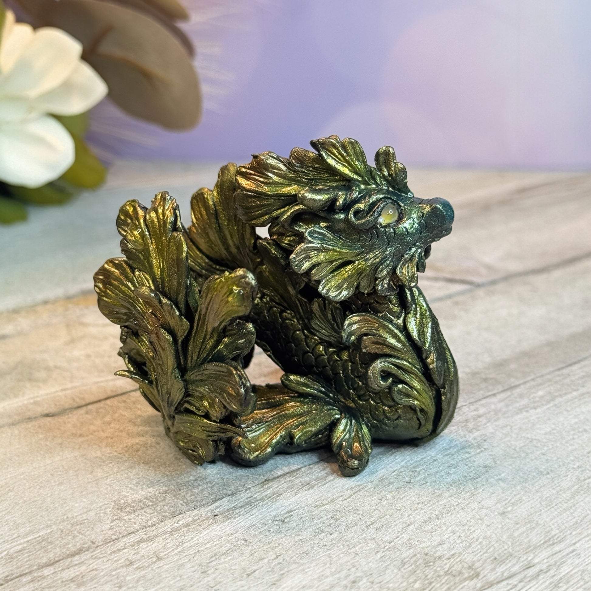 Introducing the Nori Kelpie Dragon, a unique and whimsical creation made with preciosa czech ab crystal, cosclay polymer clay, and acrylic paint. Shimmery Green Scales and dark green, orange and gold mane and tail fins make it a stand out piece. Add a touch of playfulness to your collection with this one-of-a-kind dragon!