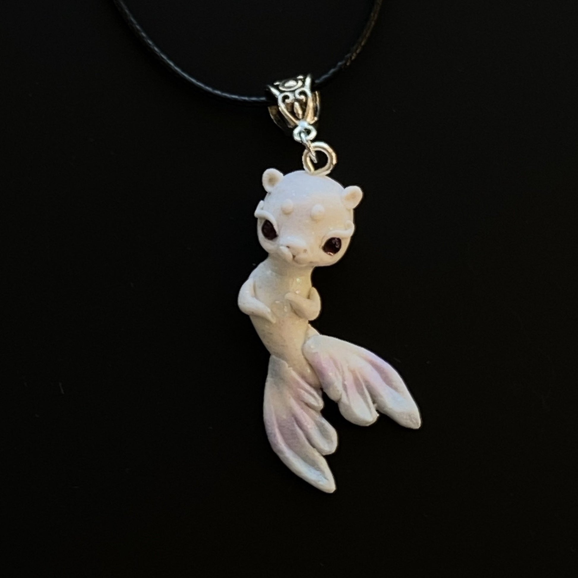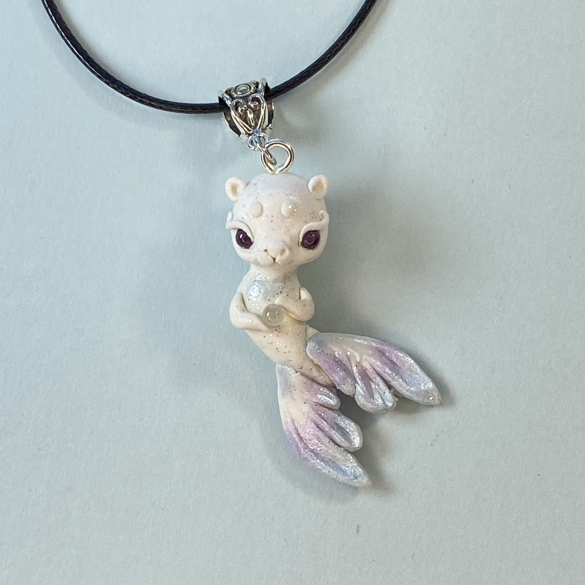 White baby otter mermaid charm with purple and blue pearl accents holding a tiny marble. Materials used include sculpey premo clay in frost white and glass crystal cabochons for eyes. Leather necklace included.
