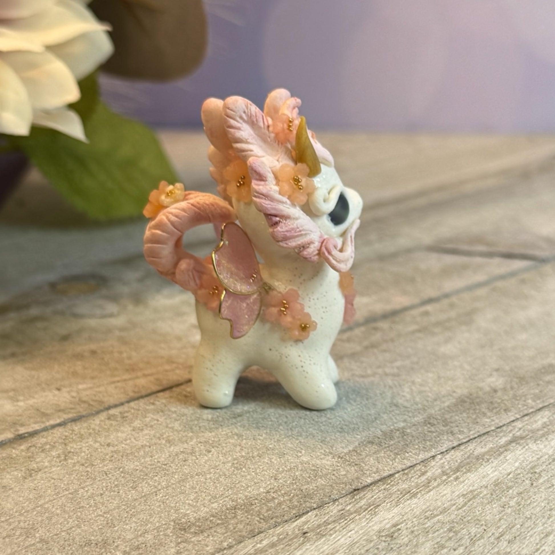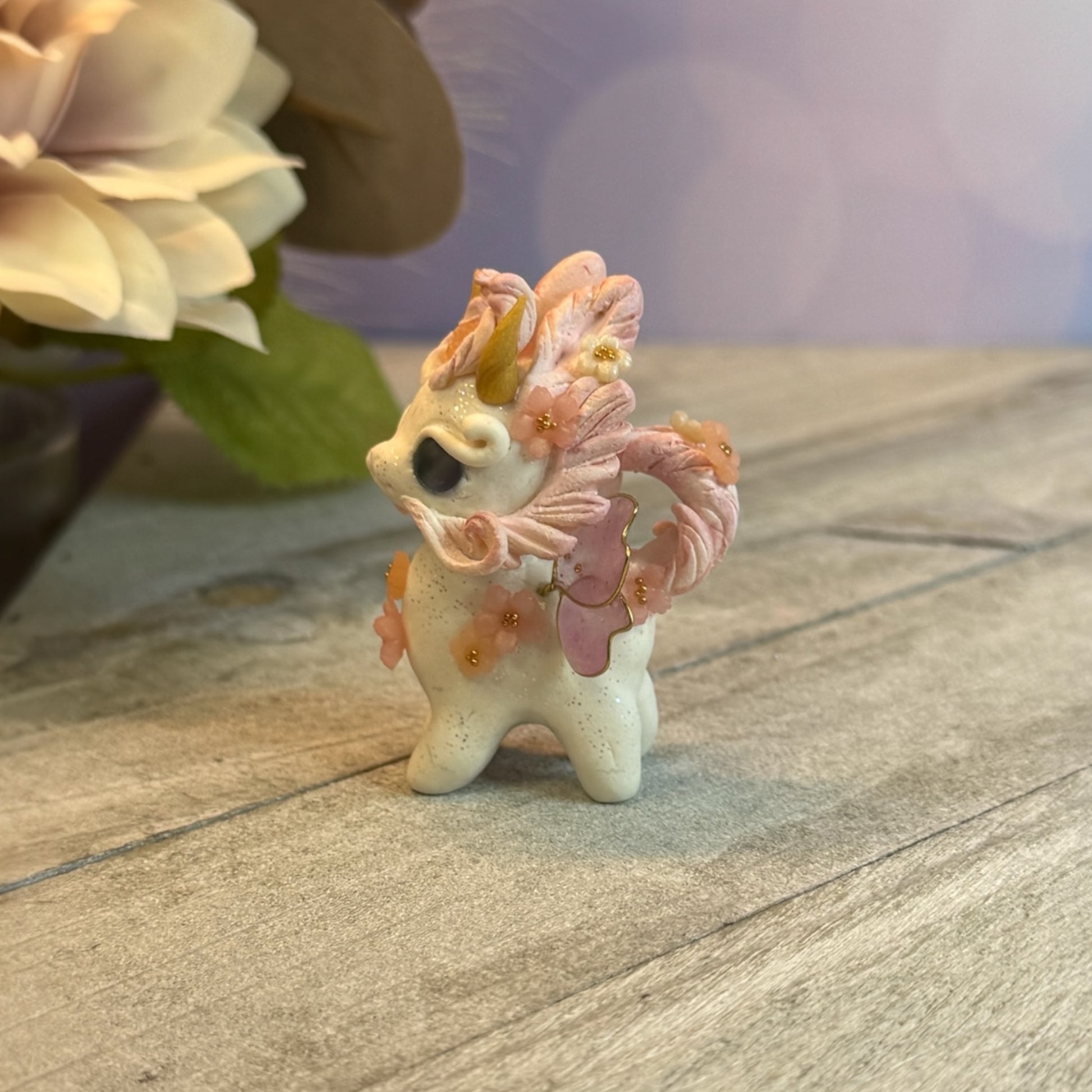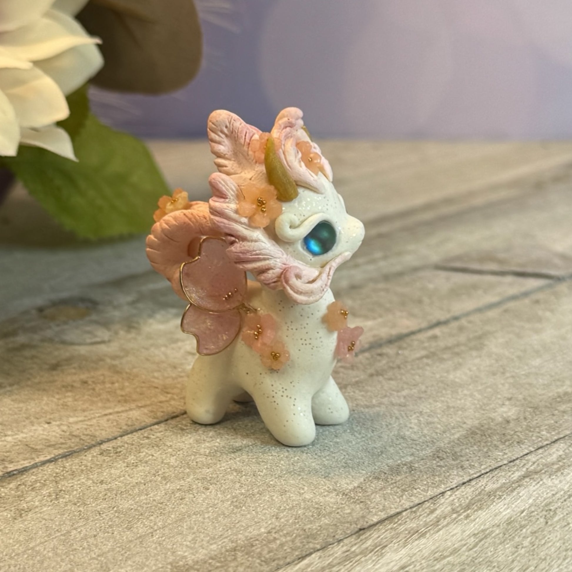 Meet the Light Pink Bunnigon, a playful little creature handmade with love from premo polymer clay. Adorned with resin and wire cherry blossom wings, glass bead eyes, and gold seed beads, this whimsical desk pet doubles as a guardian for your workspace. It's a one-of-a-kind addition to your collection!