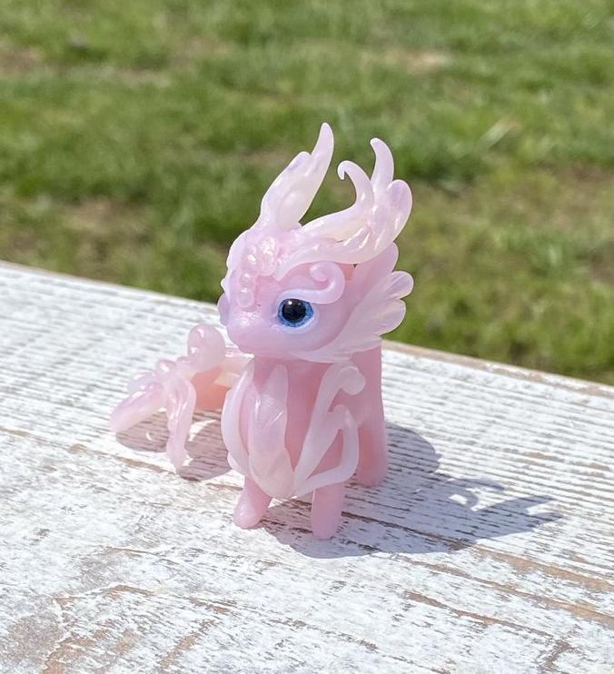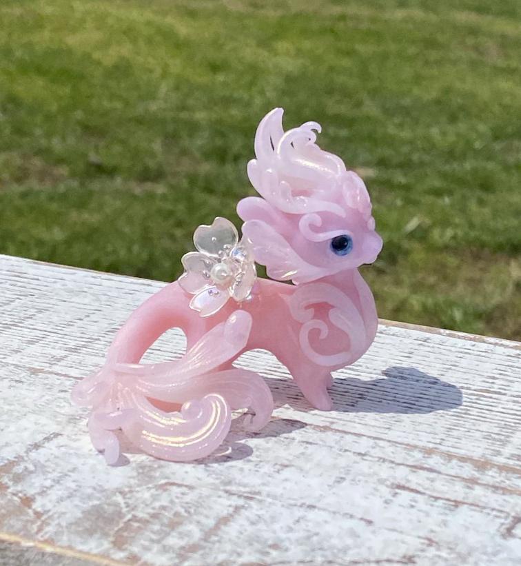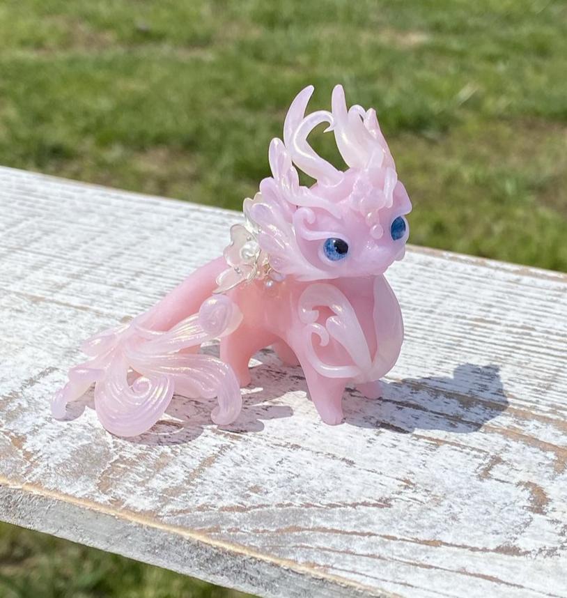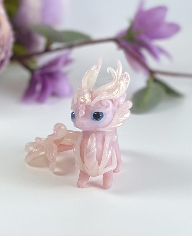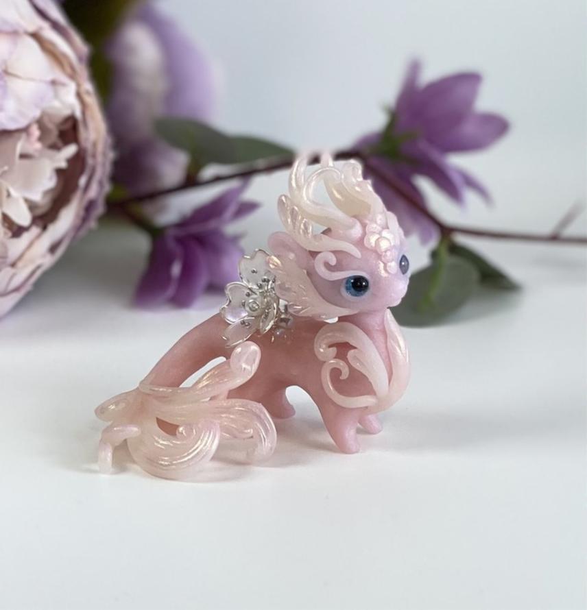 This little beauty is made out of translucent clay that resembles the luminous qualities of jade. Materials used include fimo clay, mica powders and glass cabochons for eyes. The flower resting on her back is also hand made using wire, resin, silver beads, paint, glass pearl and glass bubbles beneath resembling dew.