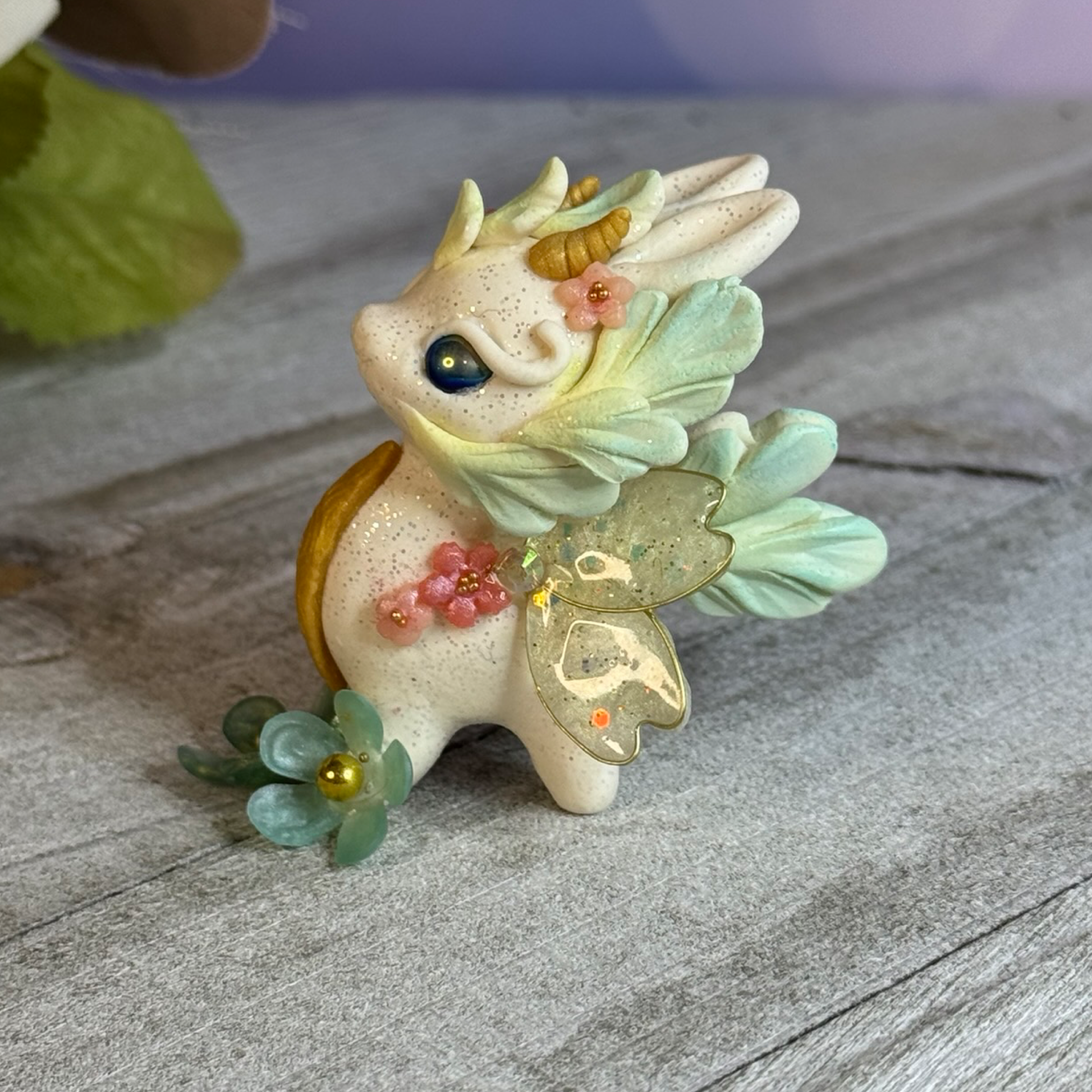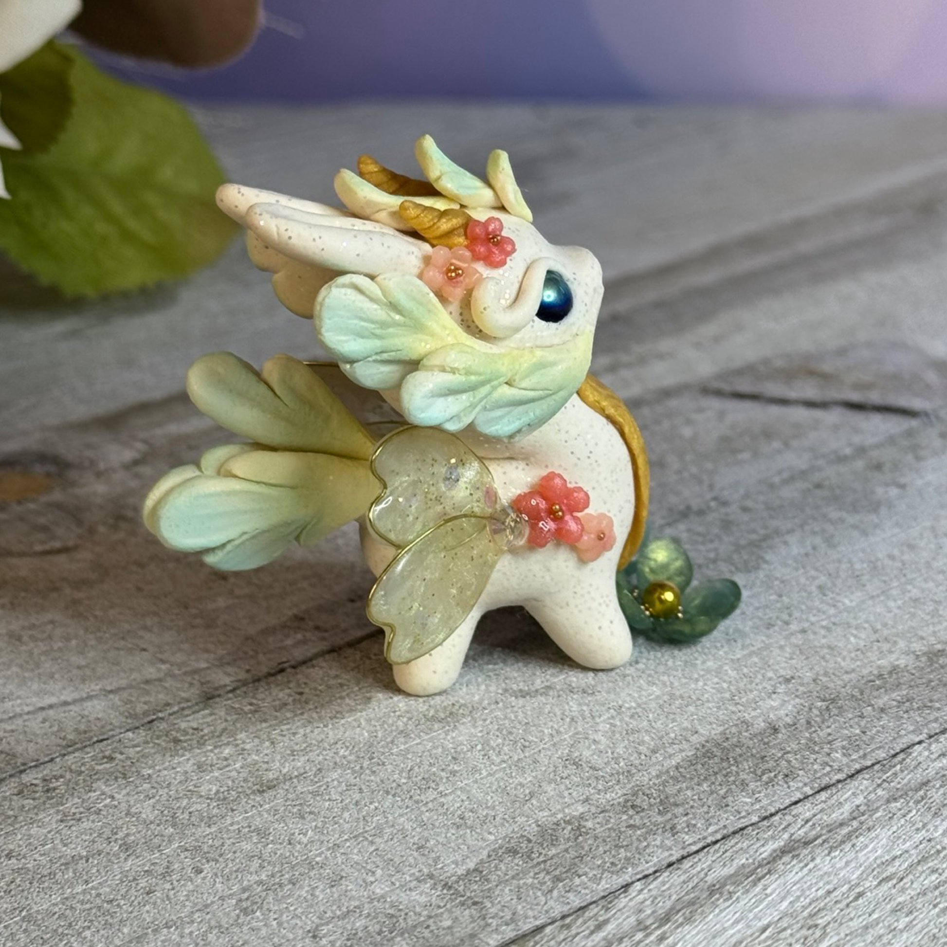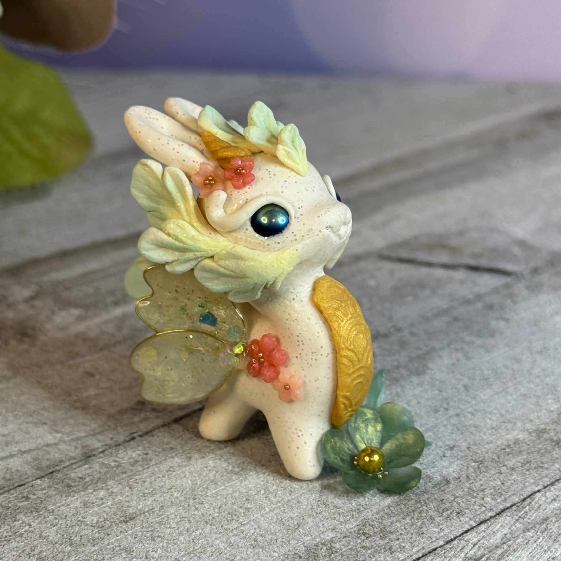 Meet your new desk companion, the Pale Yellow and Green Bunnigon! Handmade with love and attention to detail, this creature features glass bead eyes, gold seed beads for flowers, and even two small, hand sculpted green resin flowers with gold bead. It's the perfect blend of charm and whimsy. Bring a touch of playful joy to your workspace with this little cutie.