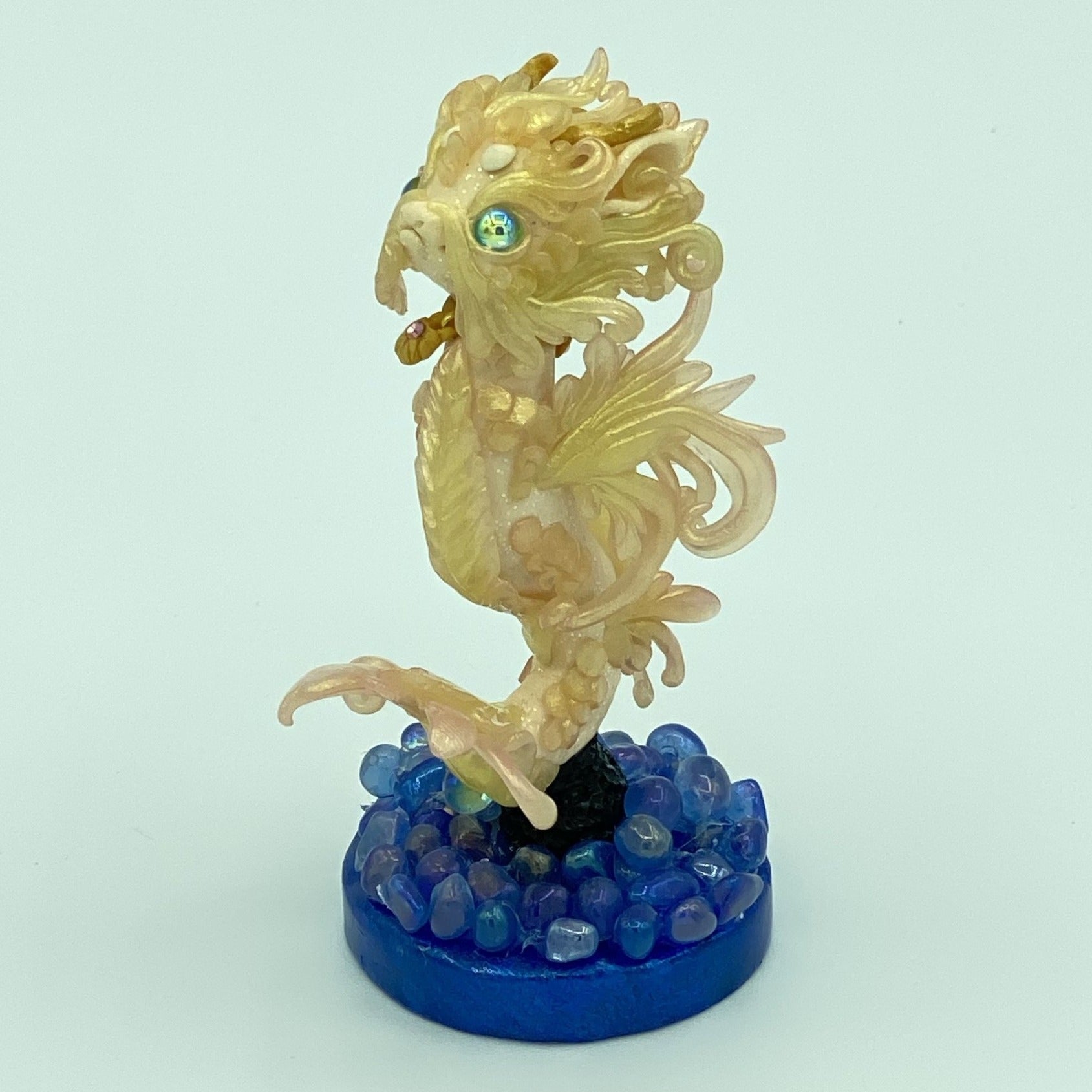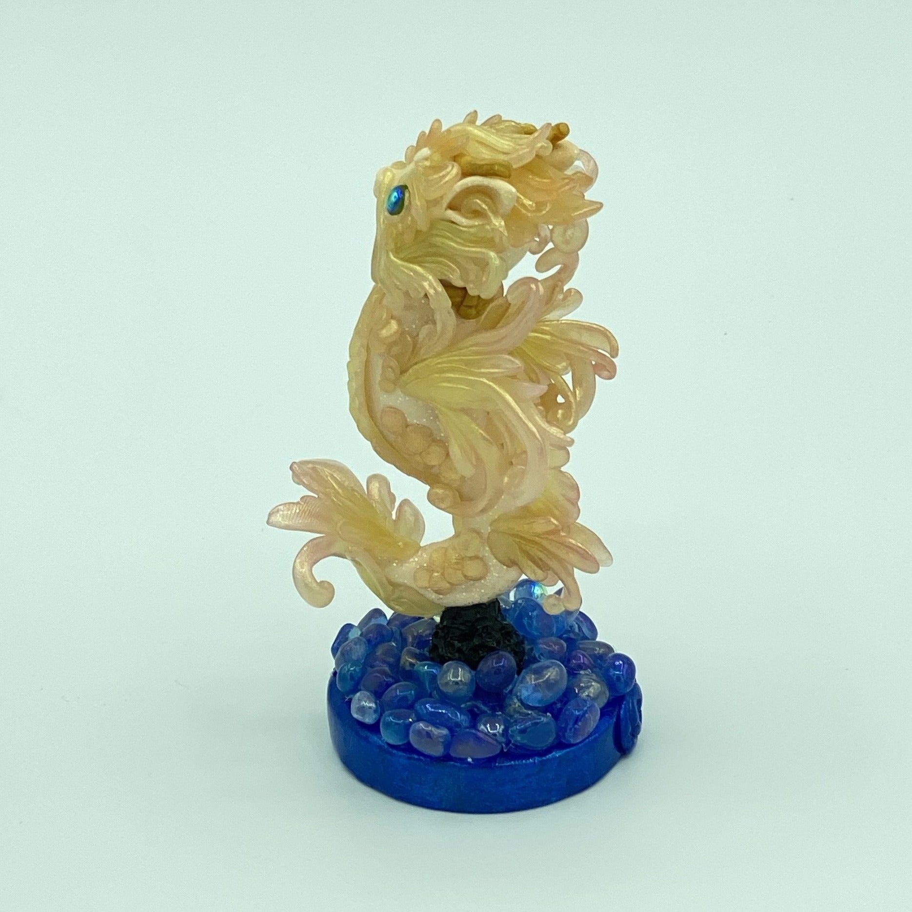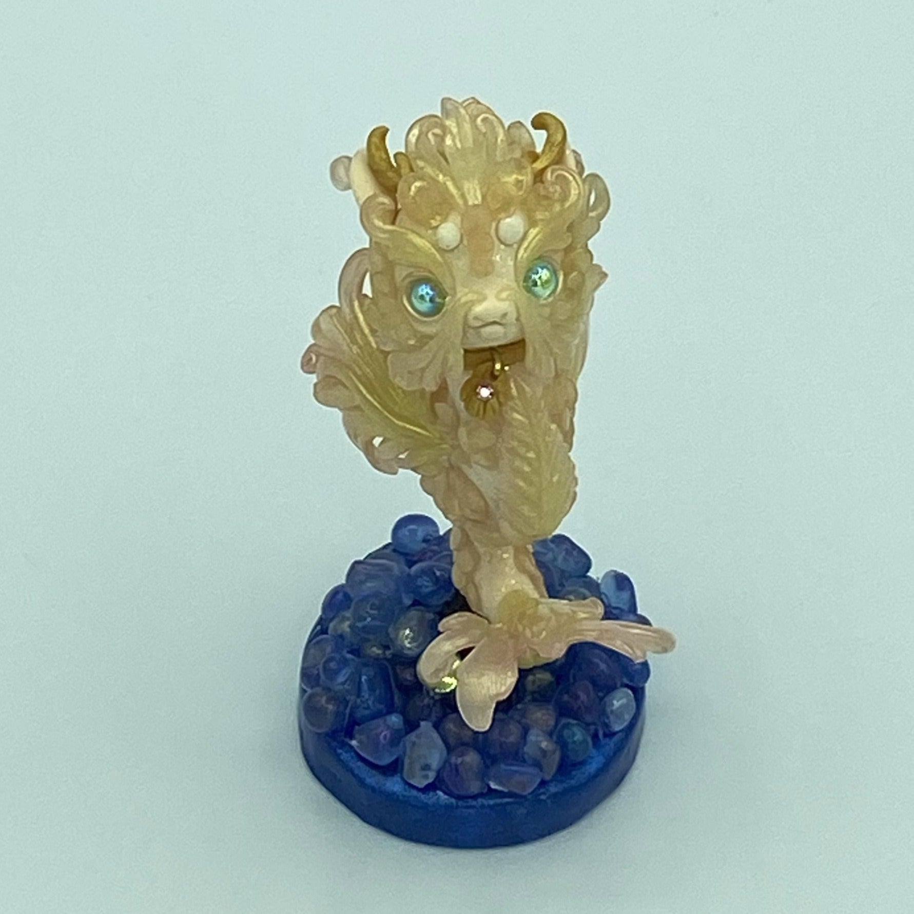 Pretty and delicate, this Peach and Gold water dragon is rare and elusive! Made entirely out of Sculpey Polymer Clay, she sits atop her rock on her clay stand that's adorned with colorful blue stones. She has green AB czech glass cabochon eyes that change color with the light and is accented with pearl ex mica powders.